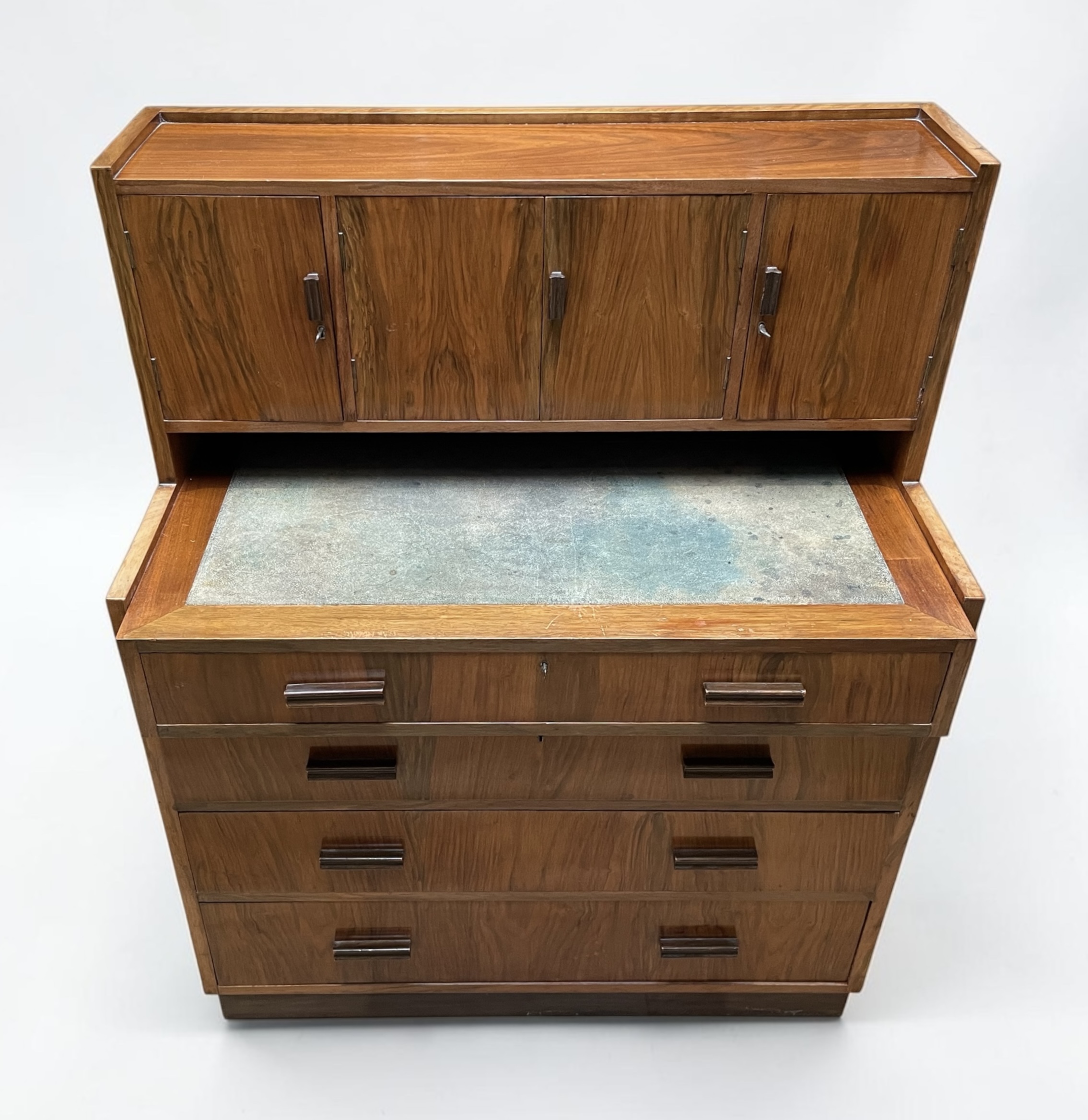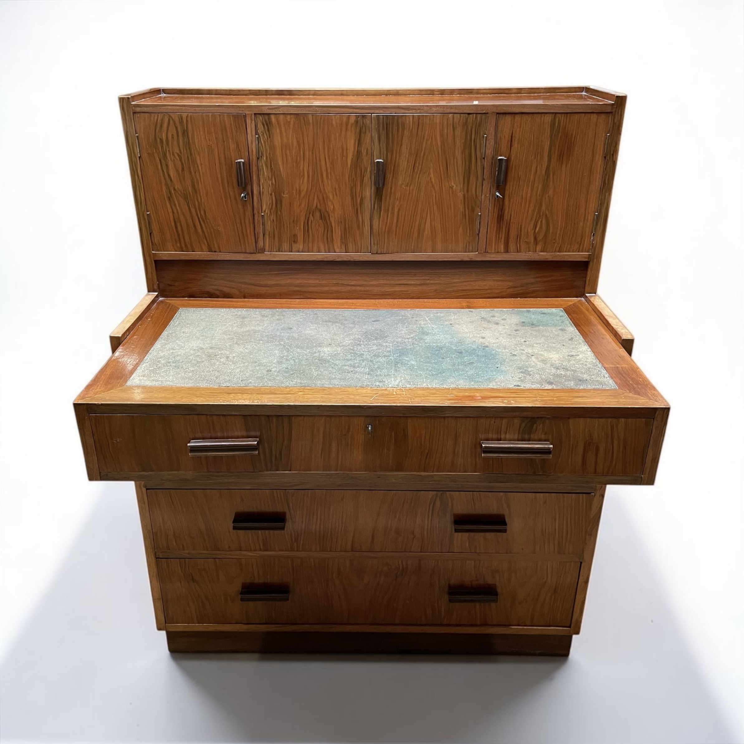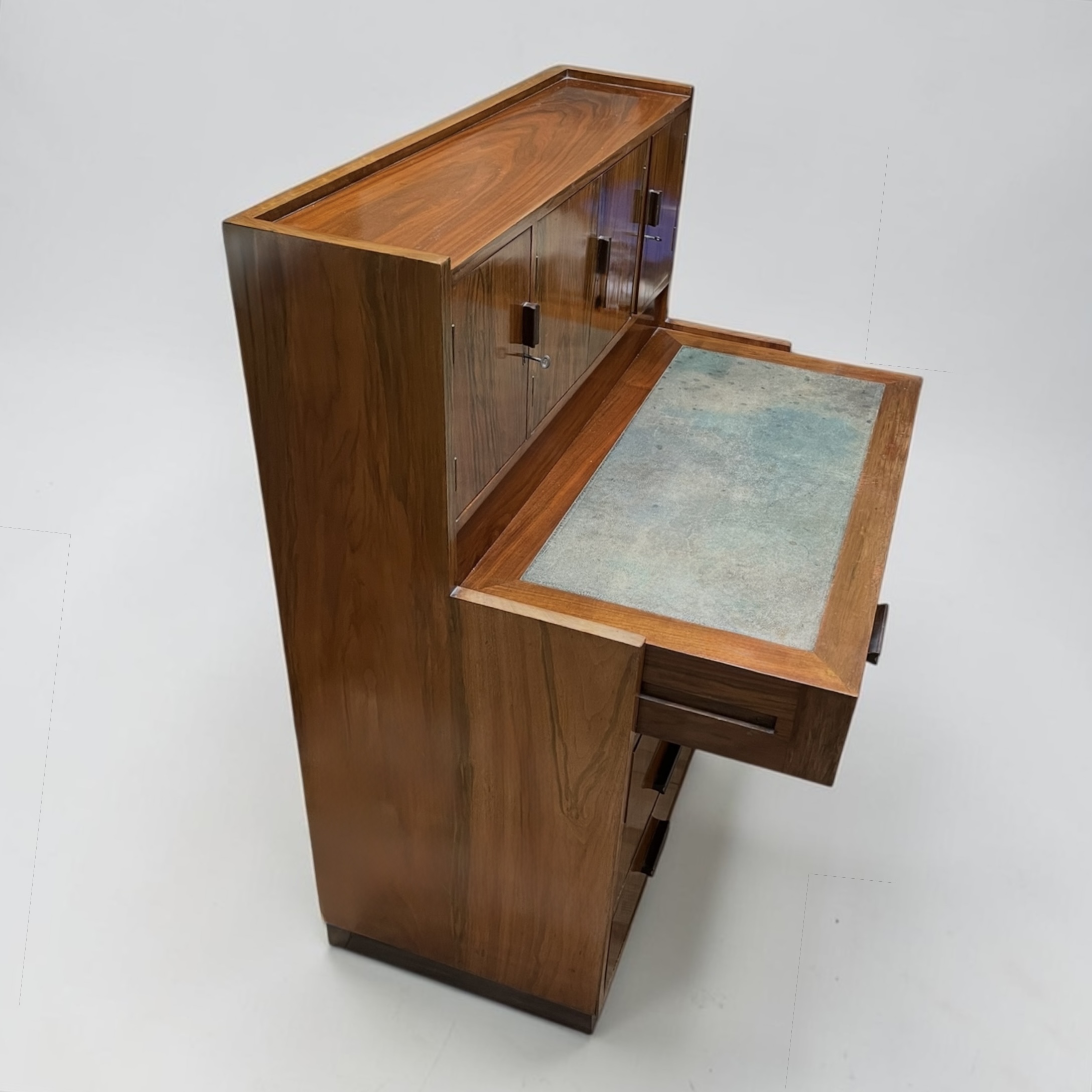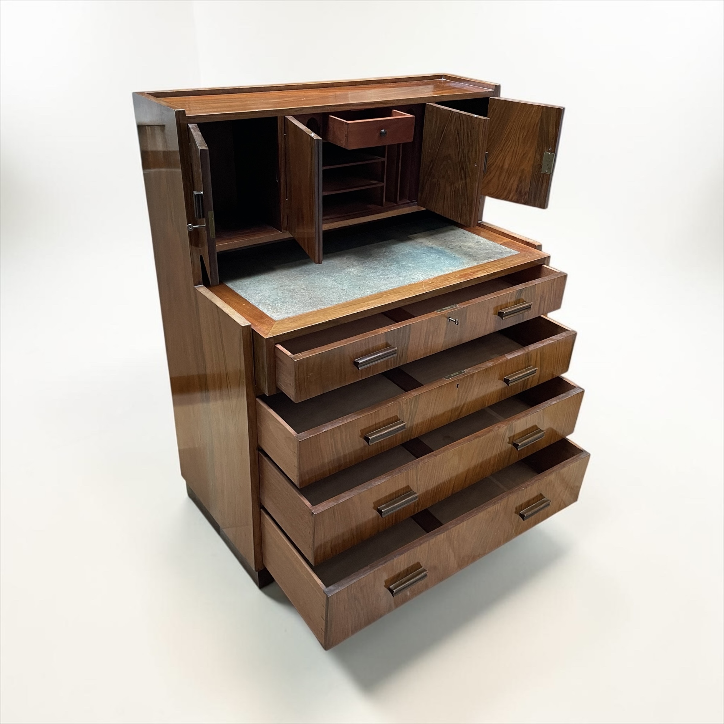 A well designed, compact desk in walnut. The inset shagreen top, with attached drawer, simply pulls forward, when required to be worked from. Beneath a further three graduated drawers and to the top four doors, with the central doors opening to pigeon holes and a drawer. A well made desk, with all locks in working order and each door and drawer with solid walnut rectangular handles.