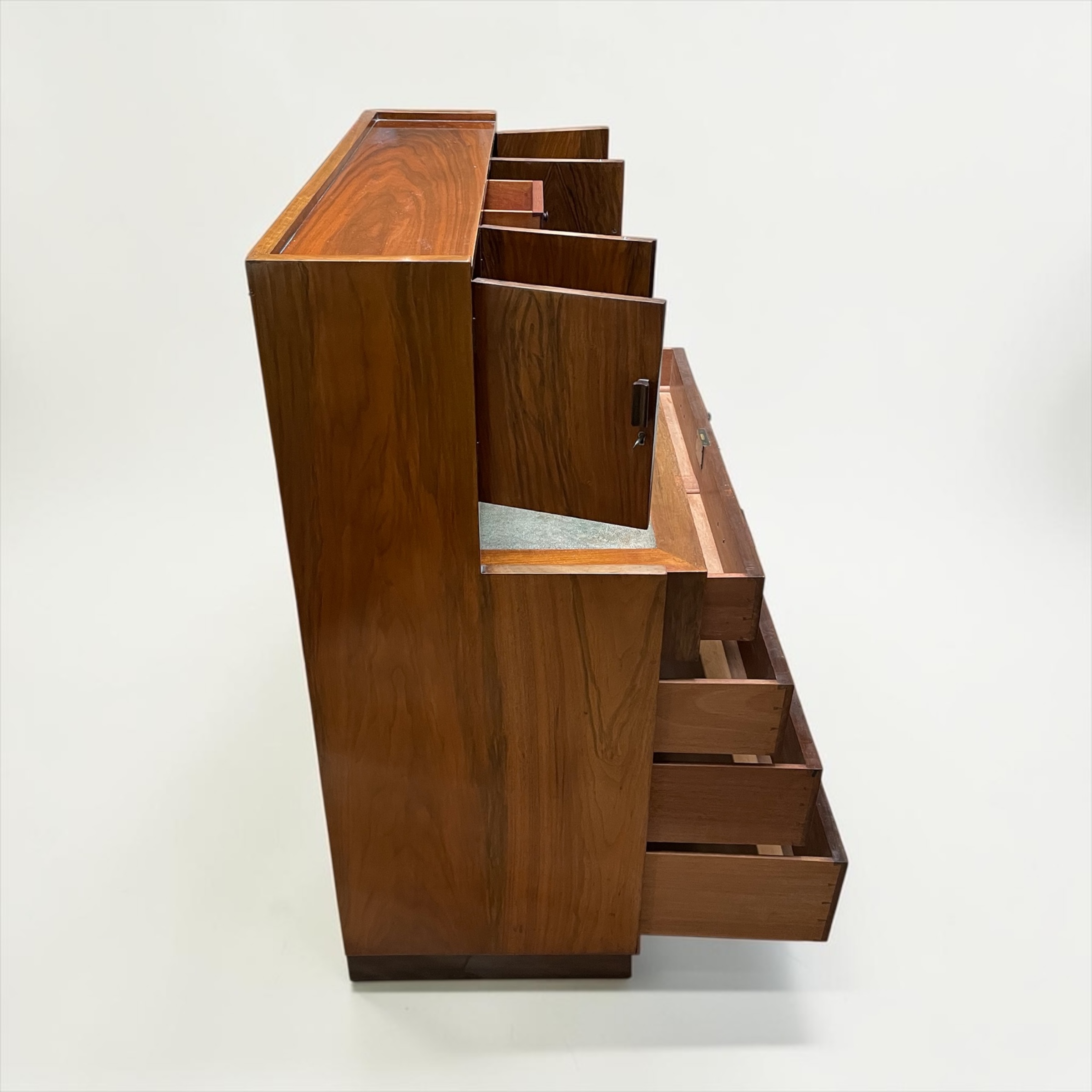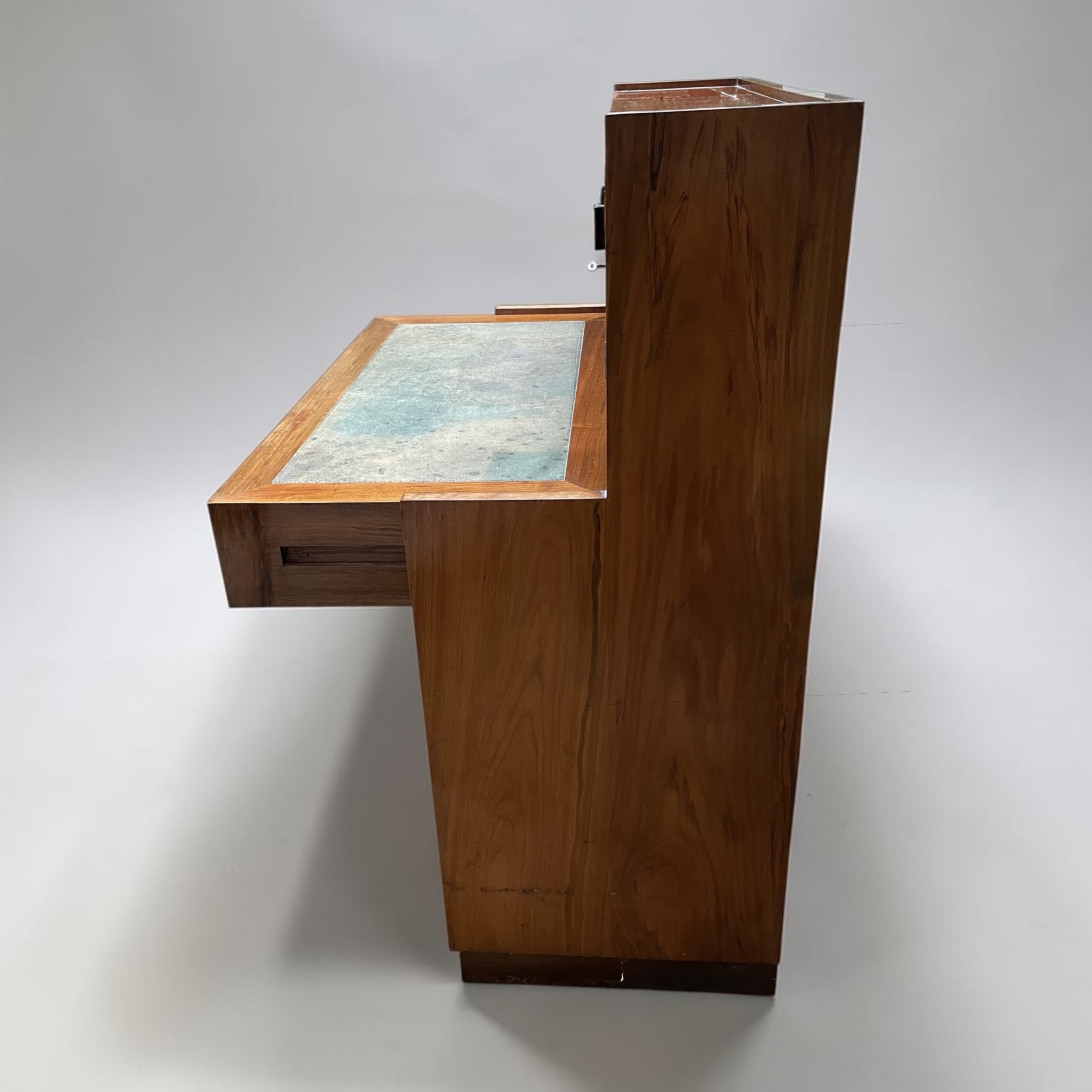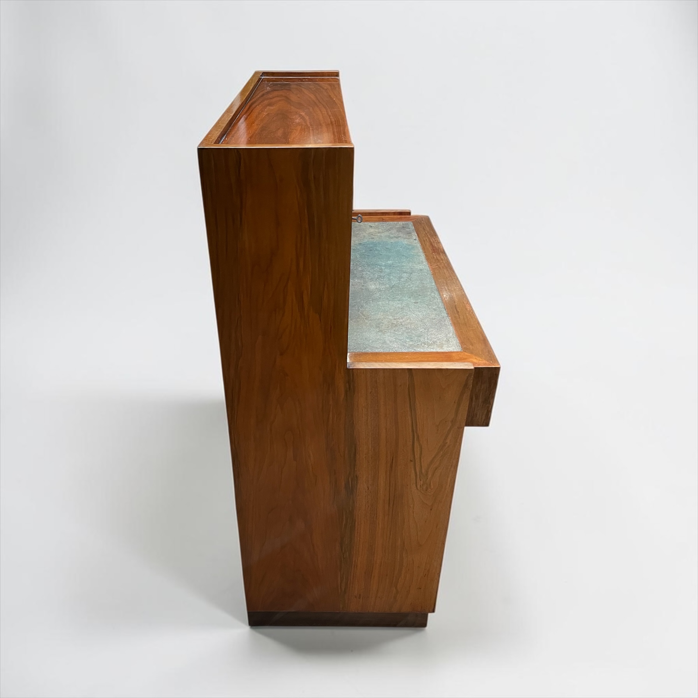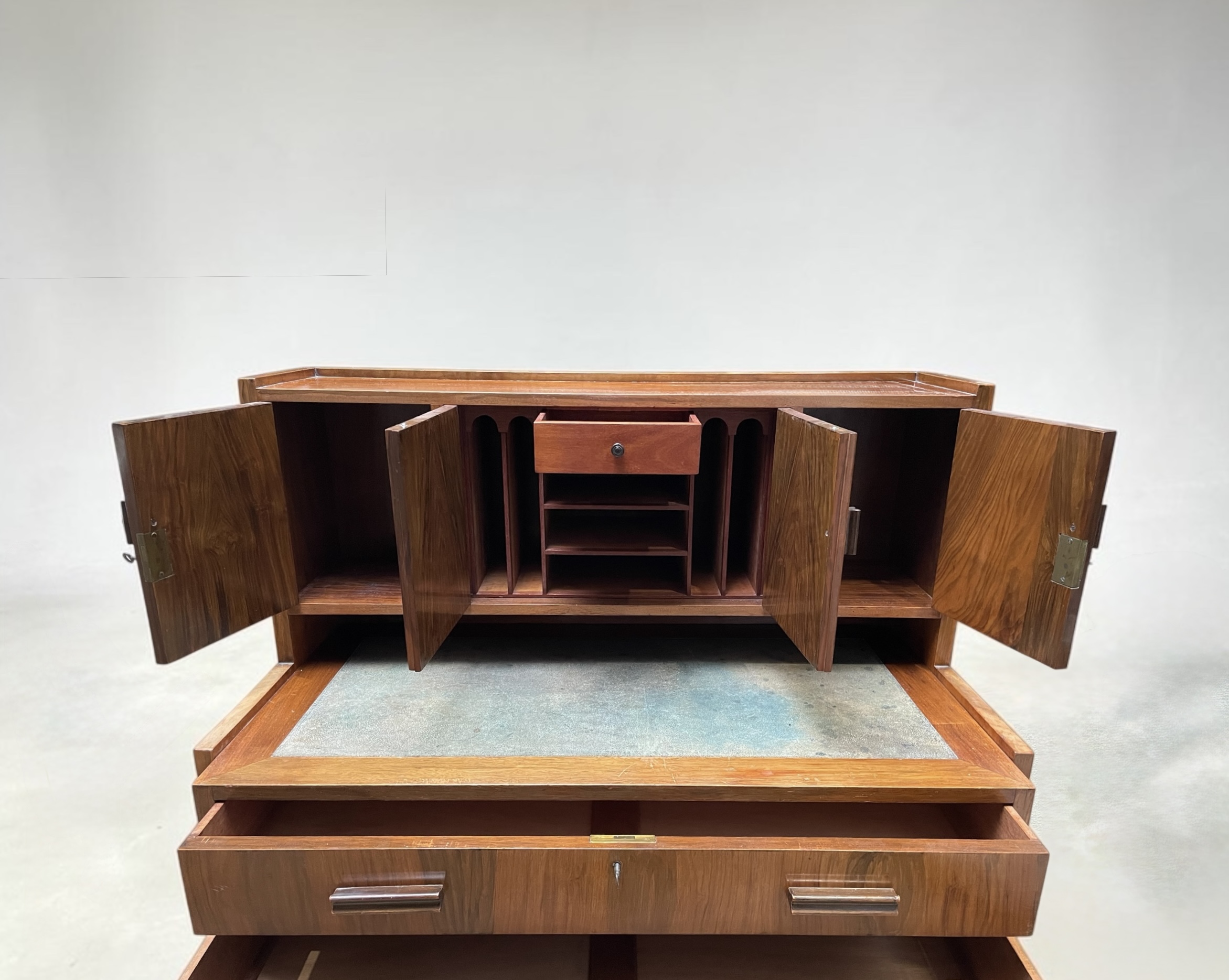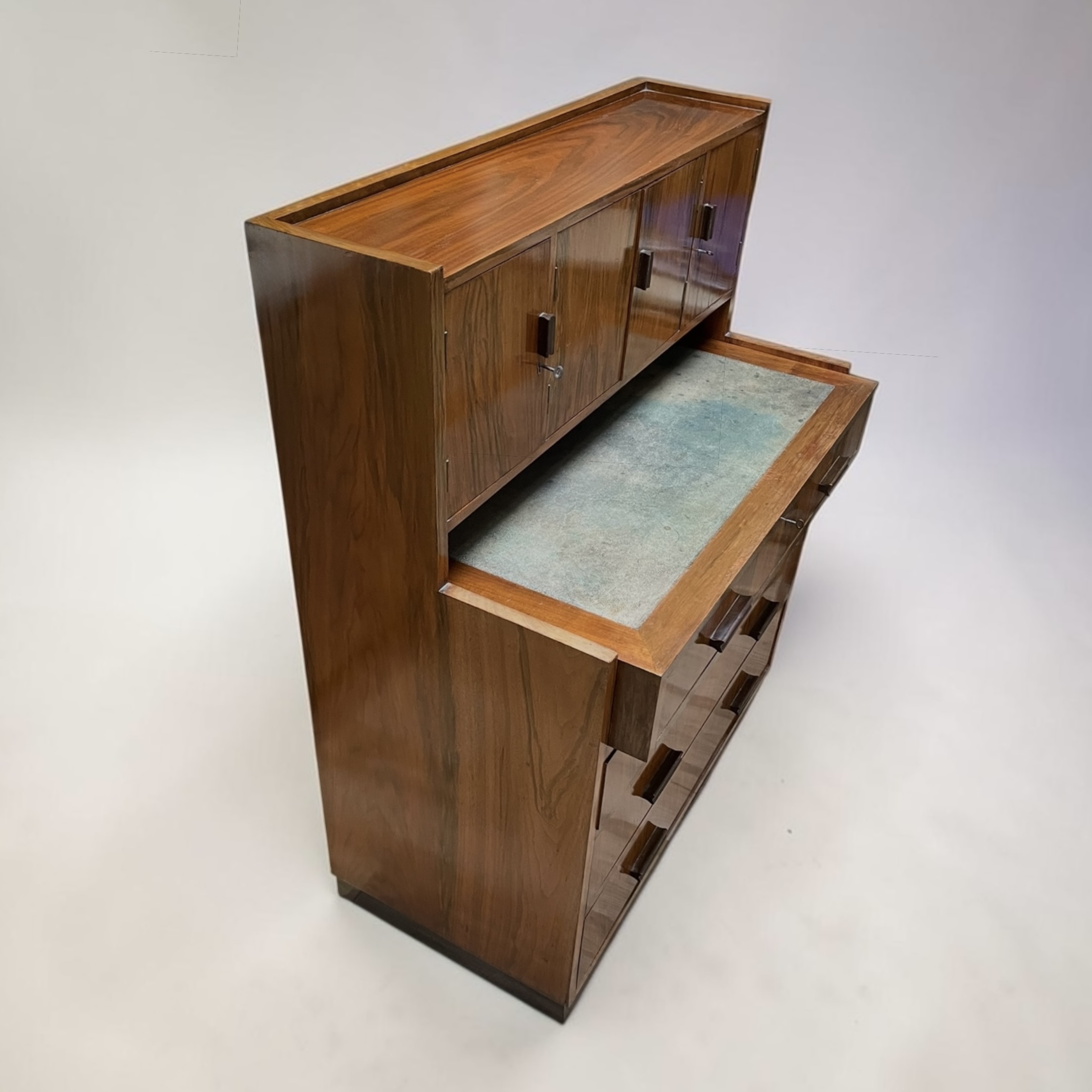 A well designed, compact desk in walnut. The inset shagreen top, with attached drawer, simply pulls forward, when required to be worked from. Beneath a further three graduated drawers and to the top four doors, with the central doors opening to pigeon holes and a drawer. A well made desk, with all locks in working order and each door and drawer with solid walnut rectangular handles.
