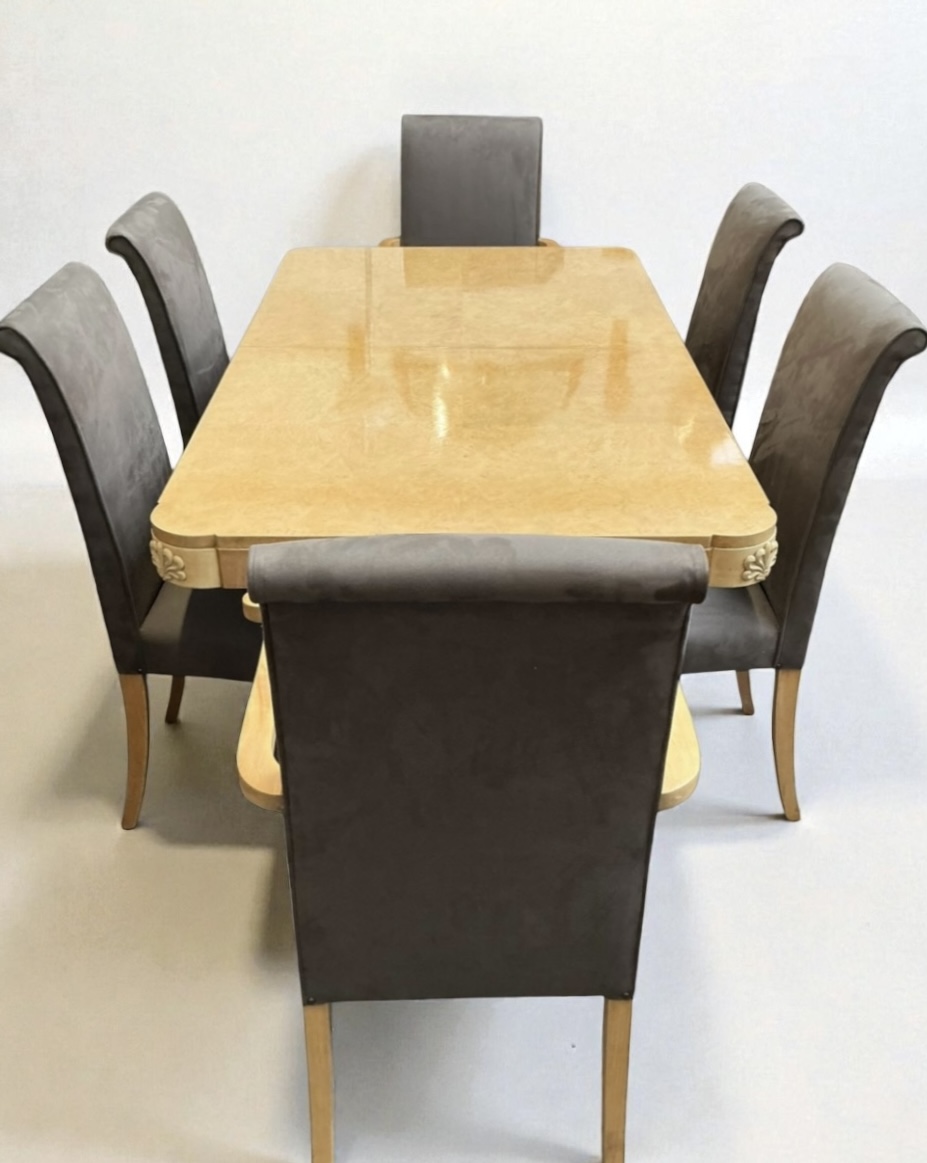 The extending dining table with a self opening/closing folding leaf stored neatly within the table. The two carvers and four chairs re-upholstered in a dark grey faux suede, perfect for the modern or period interior.