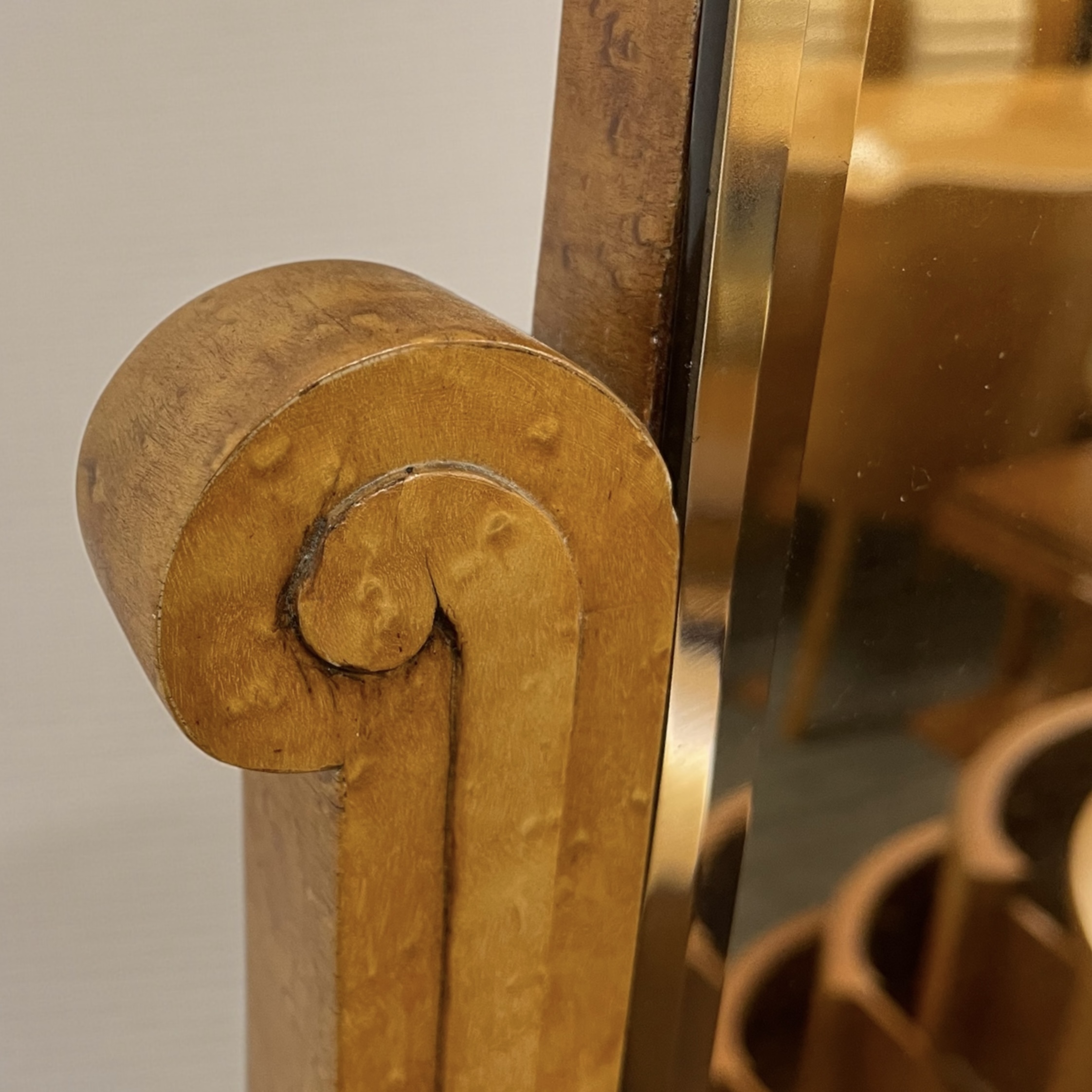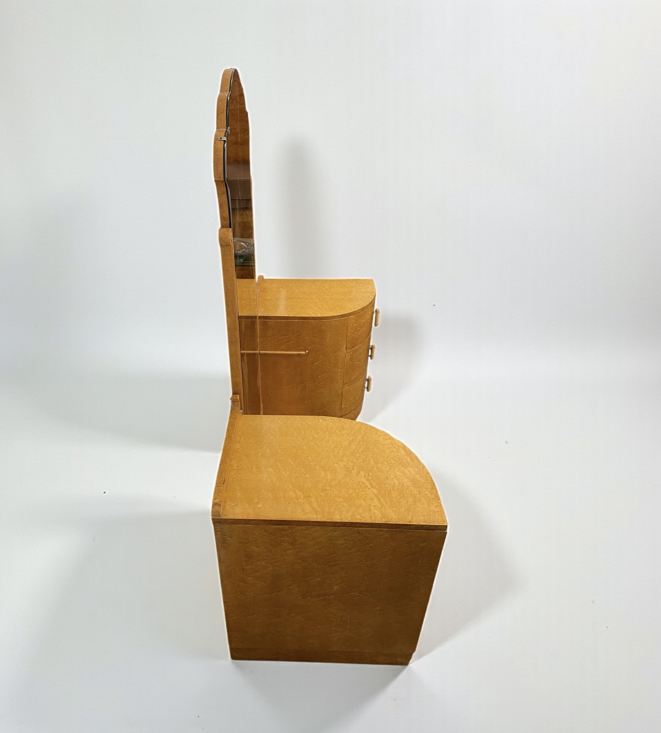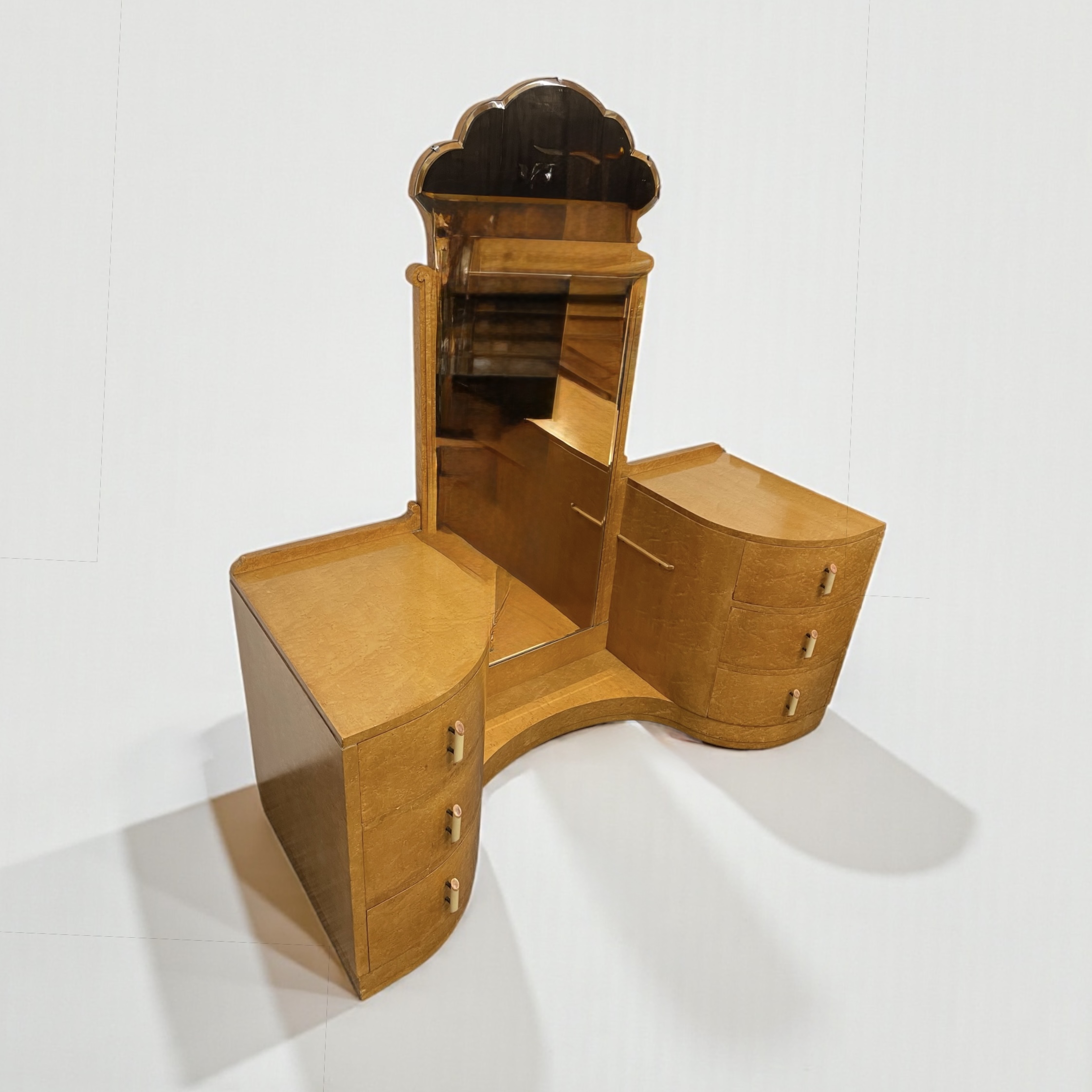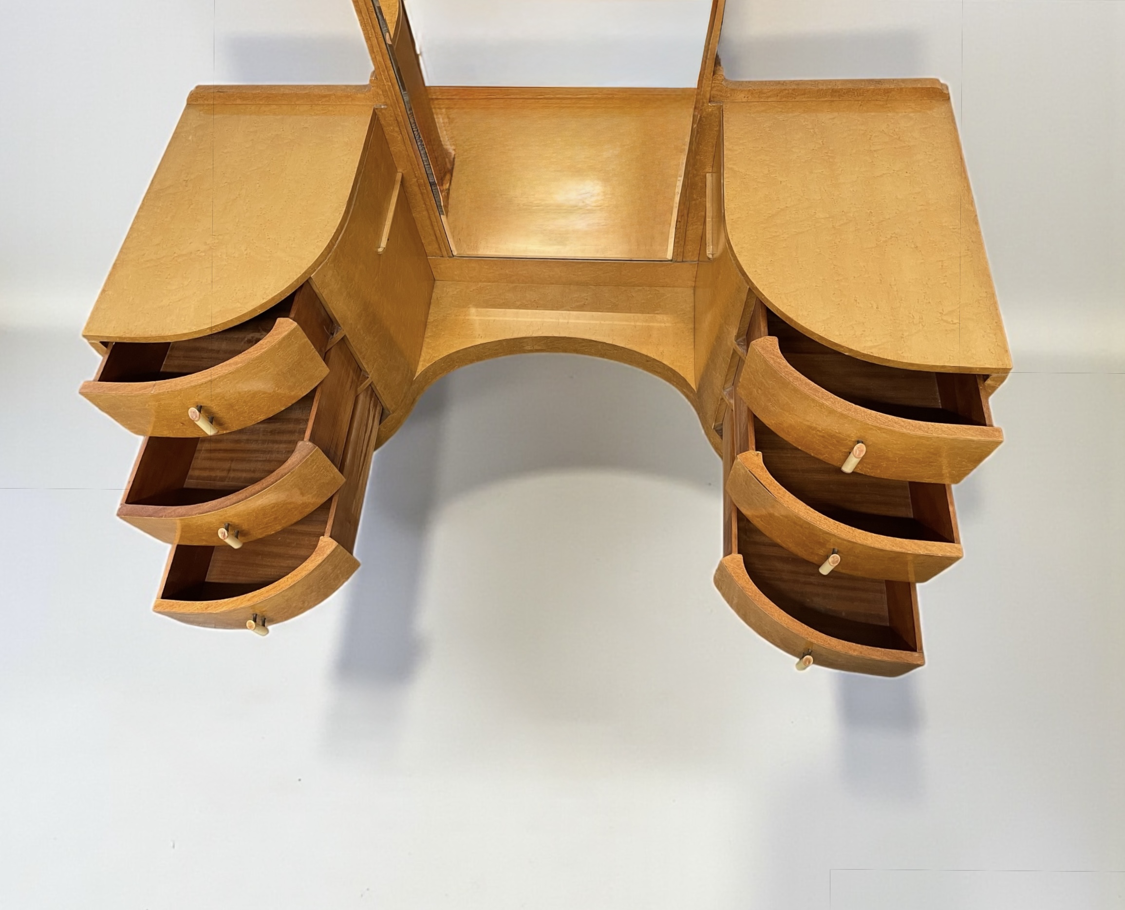 A fine Art Deco dressing table by Harry and Lou Epstein. In birds eye maple, with three curved drawers to each side, with cream and coral pink phenolic handles and a central glass shelf. Curved detailing to the top of the full length mirror and frame and a scroll detail to each side of the mirror. This original mirror has been slightly tinted, adding to its appeal. A gla