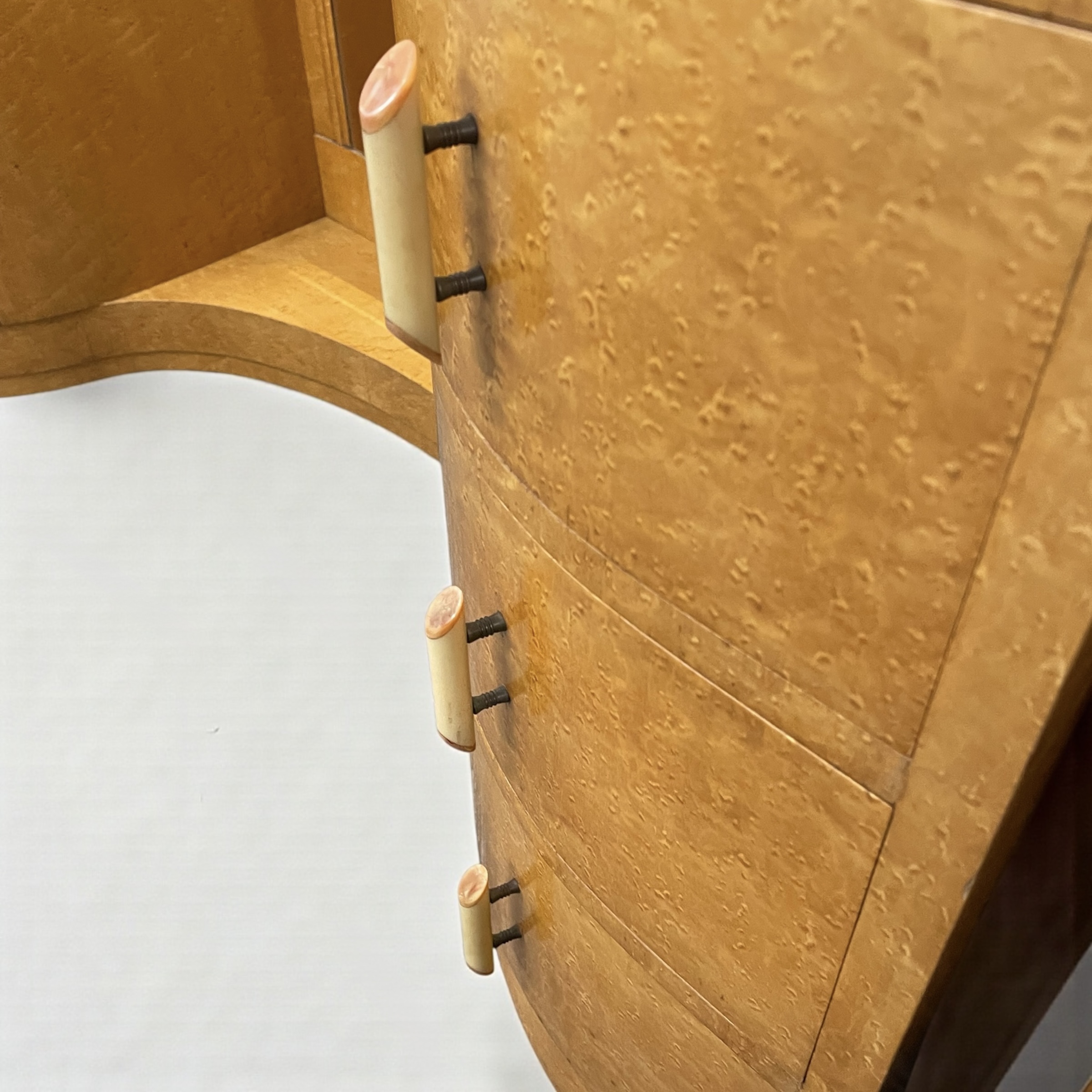 A fine Art Deco dressing table by Harry and Lou Epstein. In birds eye maple, with three curved drawers to each side, with cream and coral pink phenolic handles and a central glass shelf. Curved detailing to the top of the full length mirror and frame and a scroll detail to each side of the mirror. This original mirror has been slightly tinted, adding to its appeal. A gla