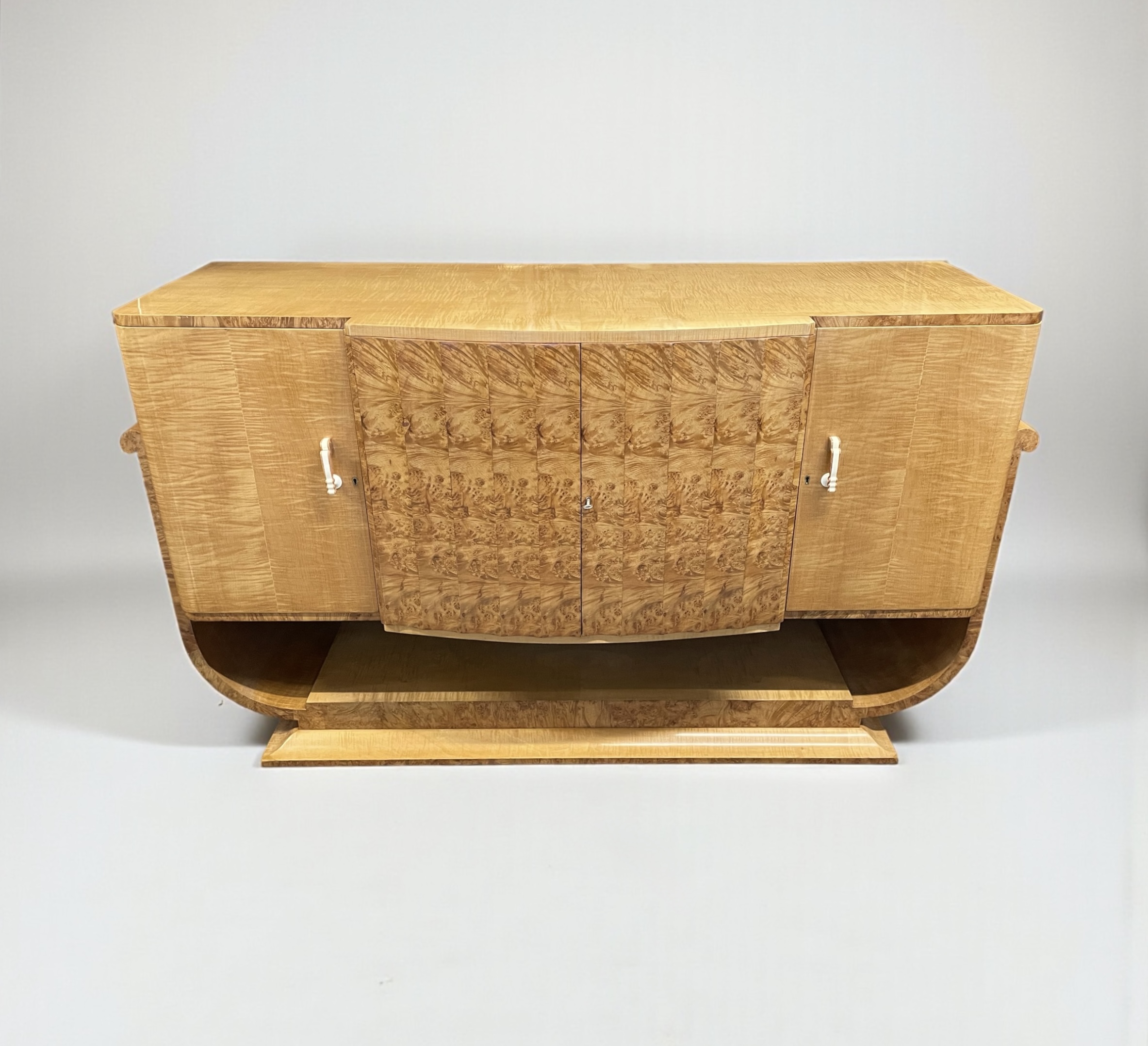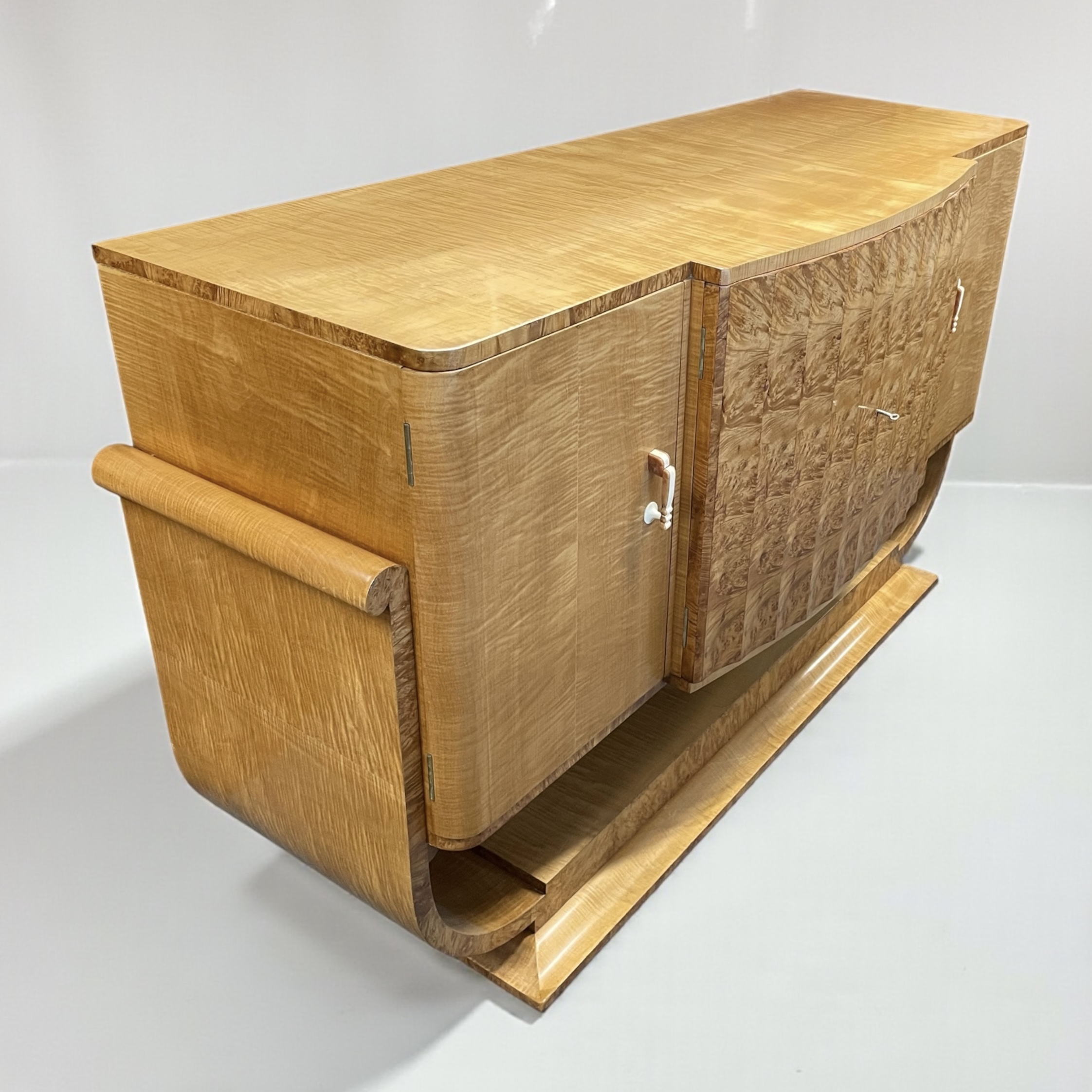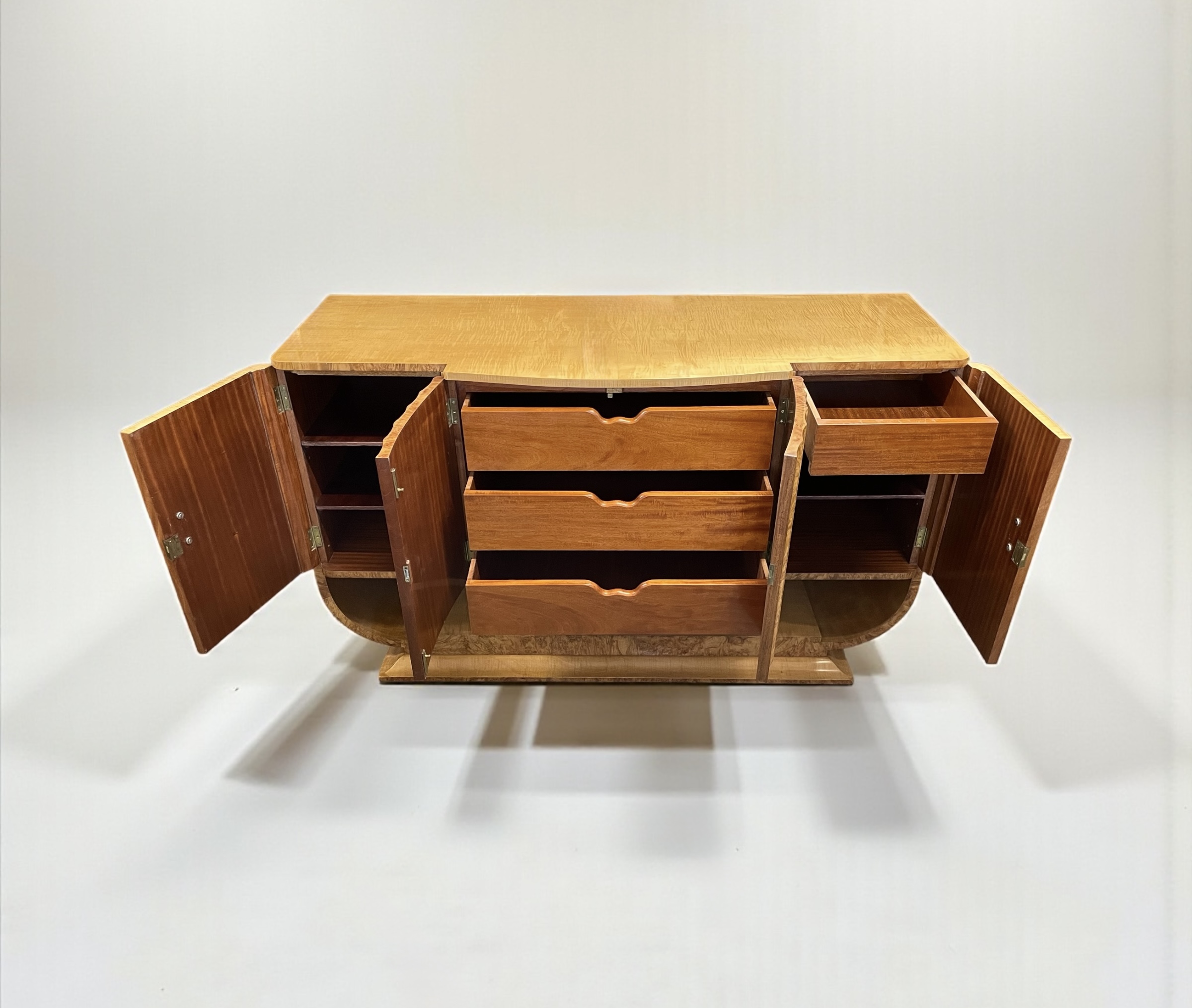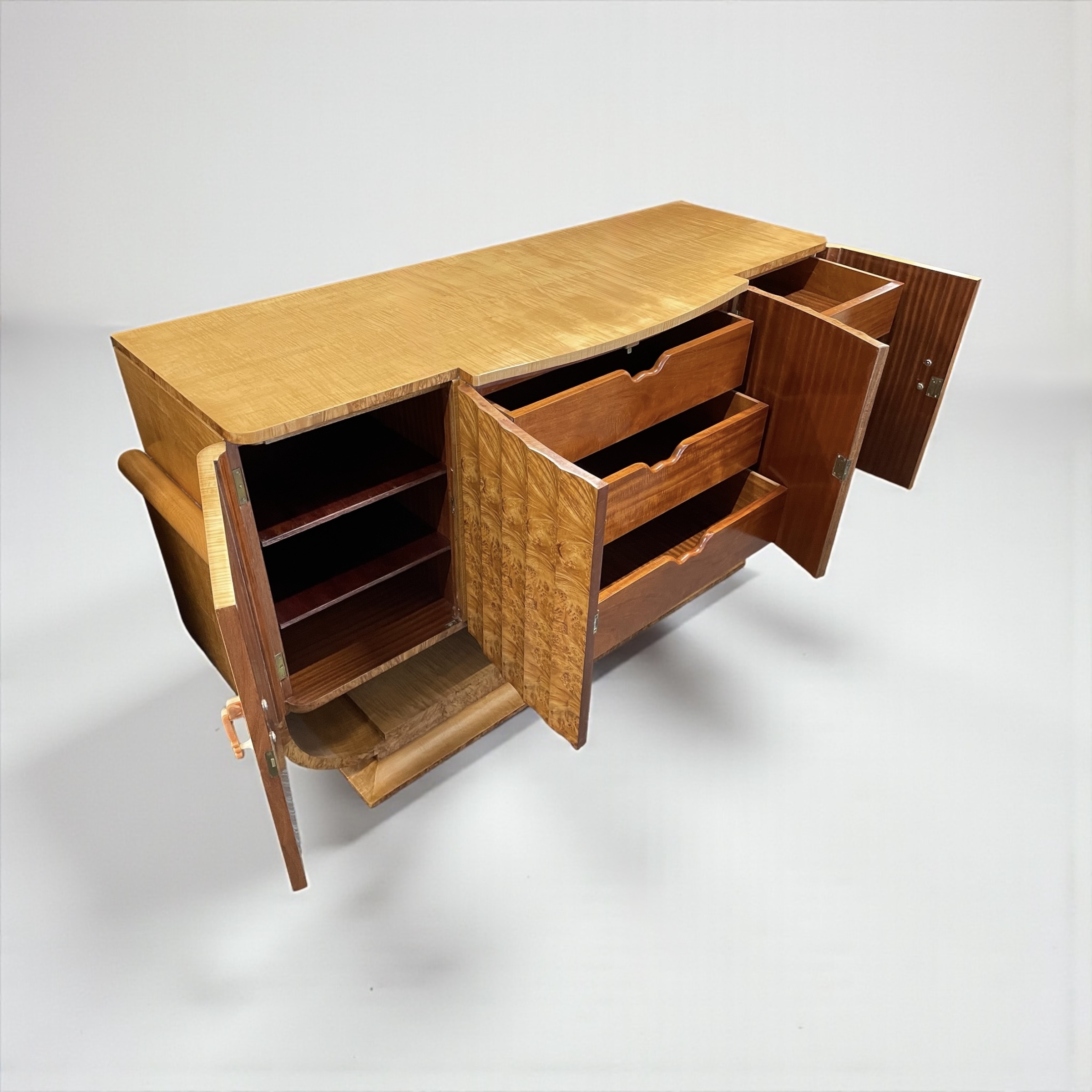 A Fine Art Deco sideboard by Harry and Lou Epstein, in burr walnut and satin birch on solid mahogany.