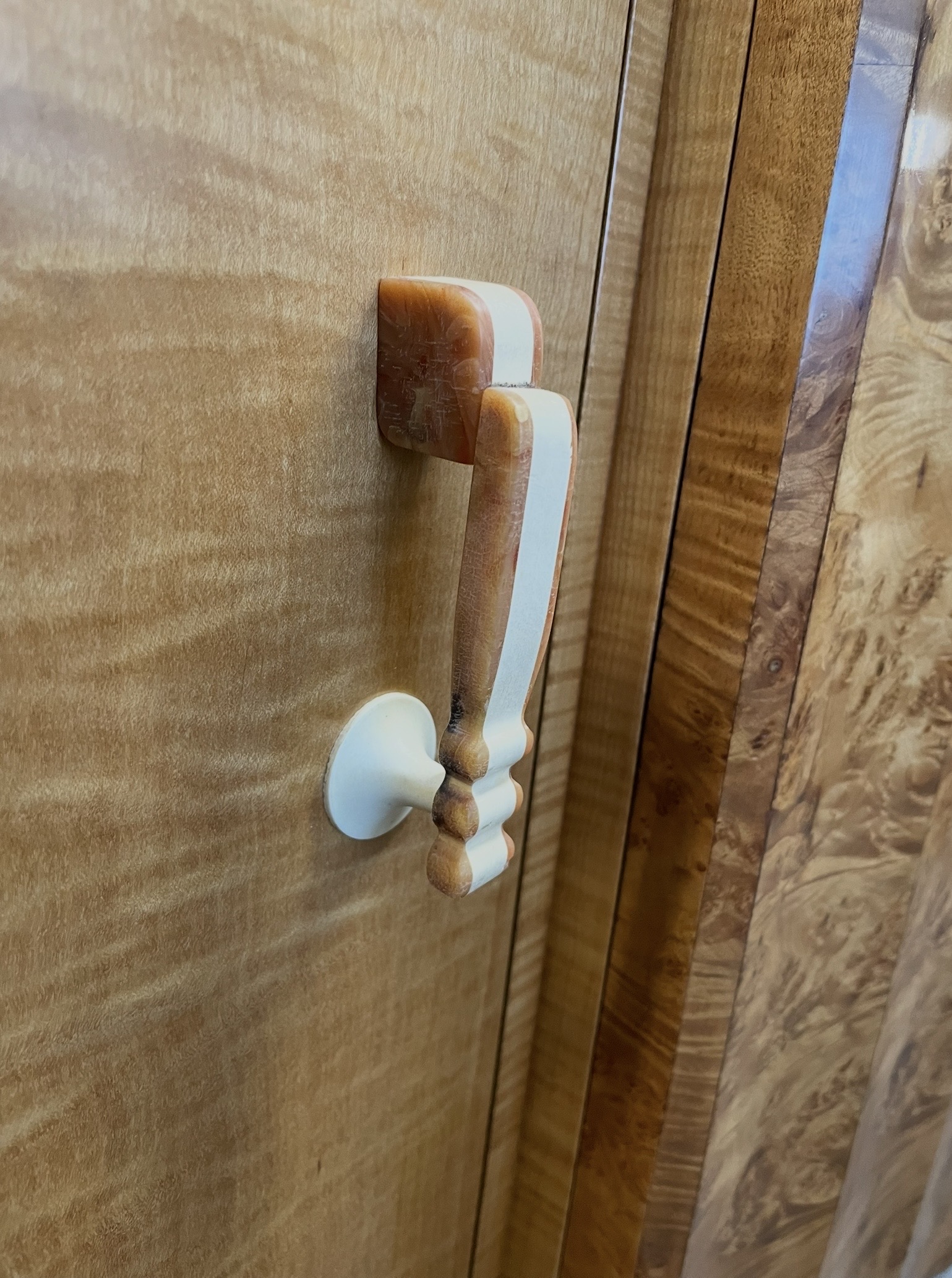 The central cupboard opens to reveal three drawers with a three shelved cupboard to the left hand side and to the right cupboard, two shelves with a top single drawer. Set over a U-shaped base and with bakelite handles.