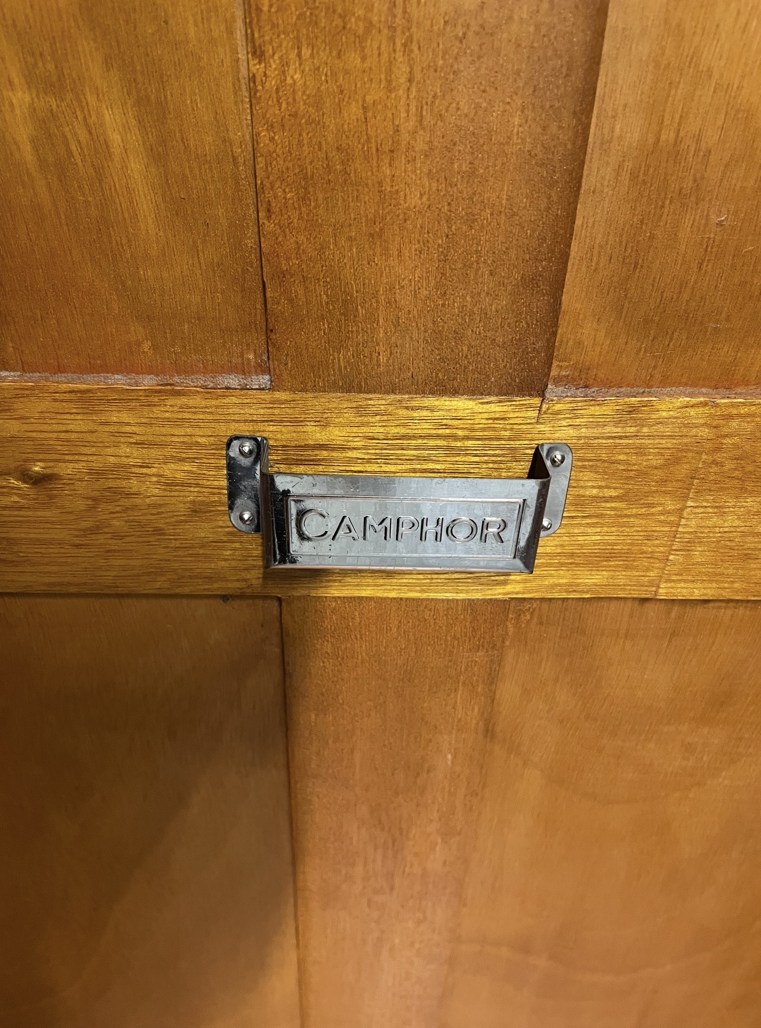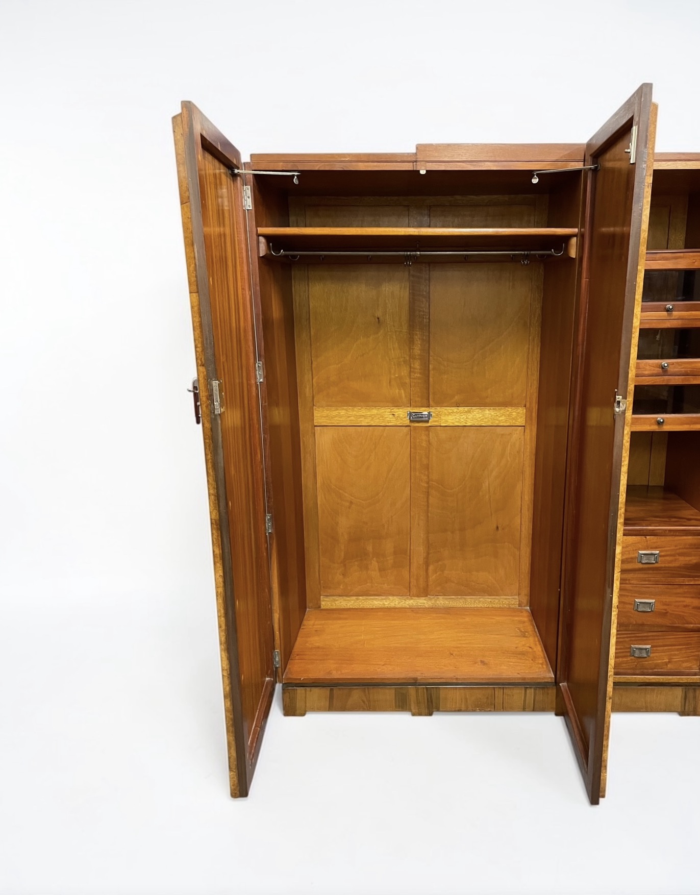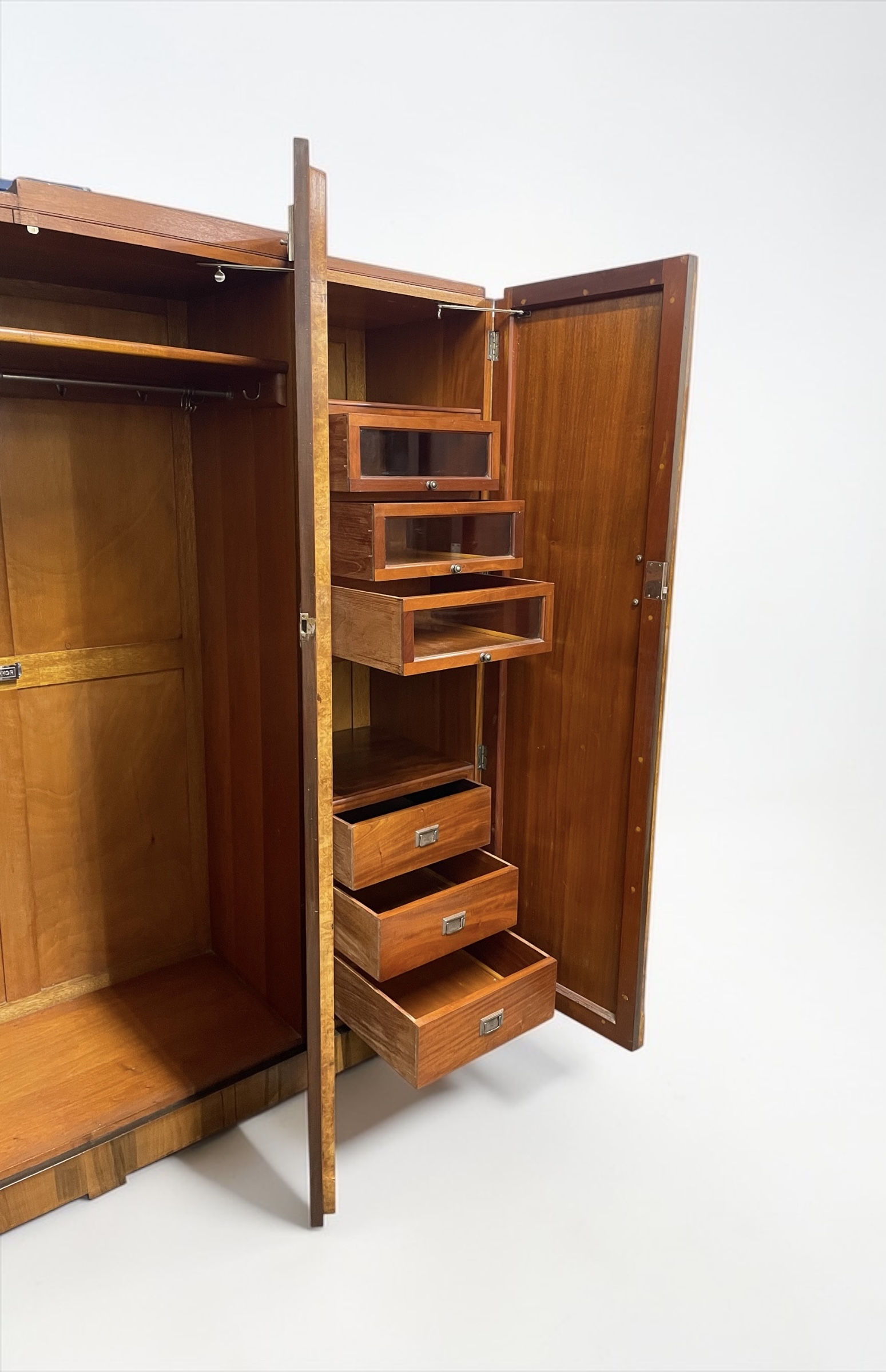 To the left hand side, two doors open to reveal a top shelf and a hanging rail, with the original chrome holder for camphor. To the right, a top shelf, three drawers with glazed fronts. Below a further shelf and three drawers with Art Deco designed handles.
