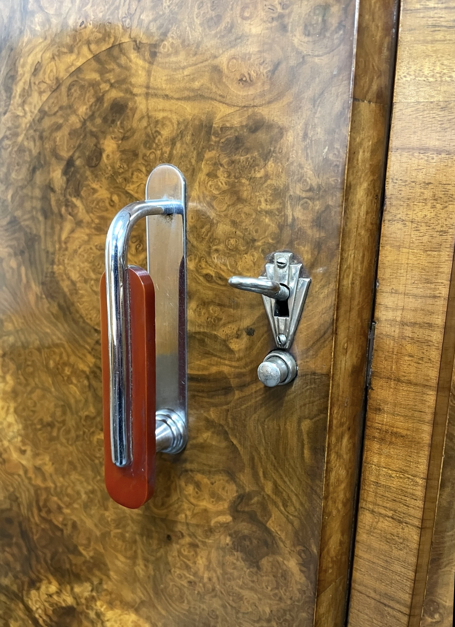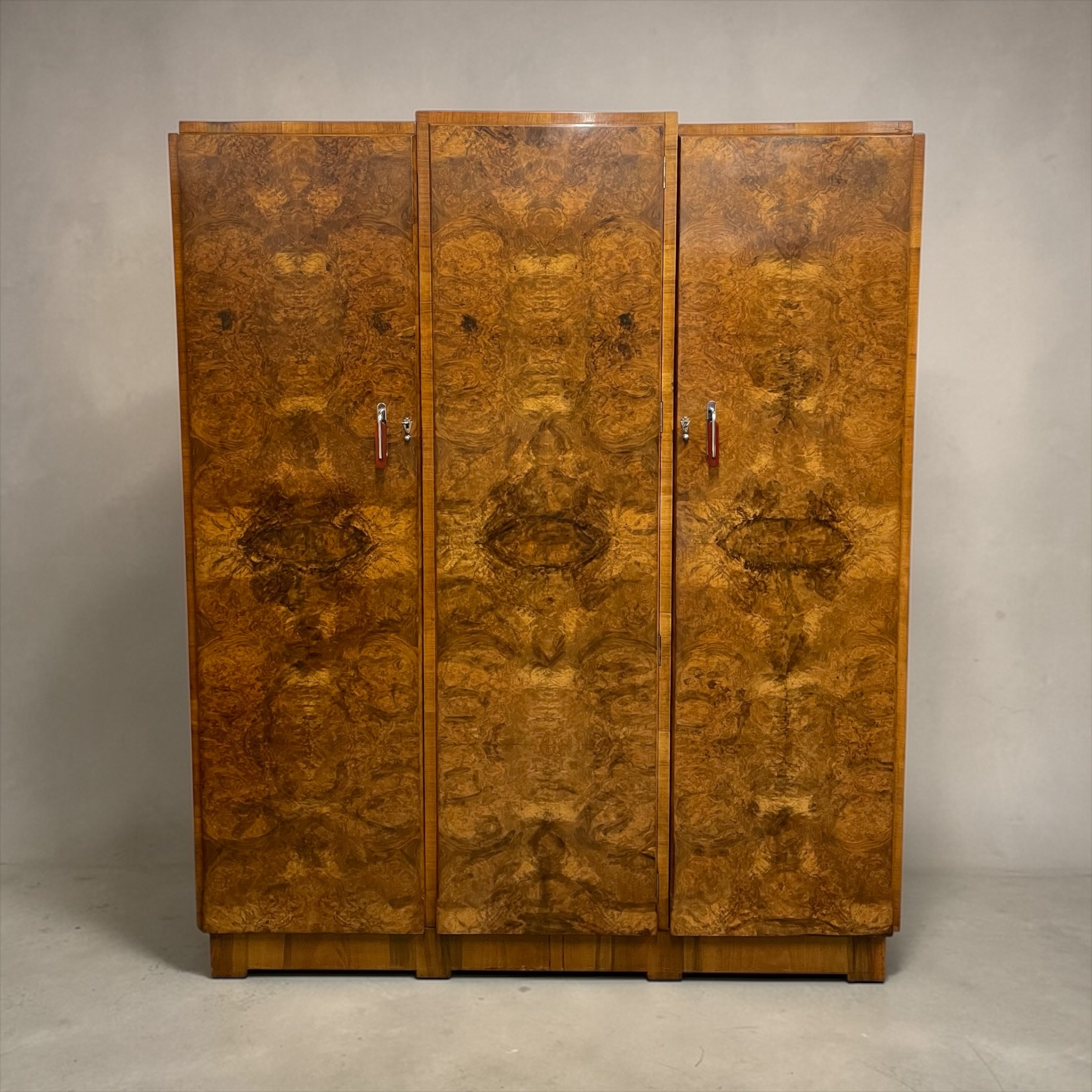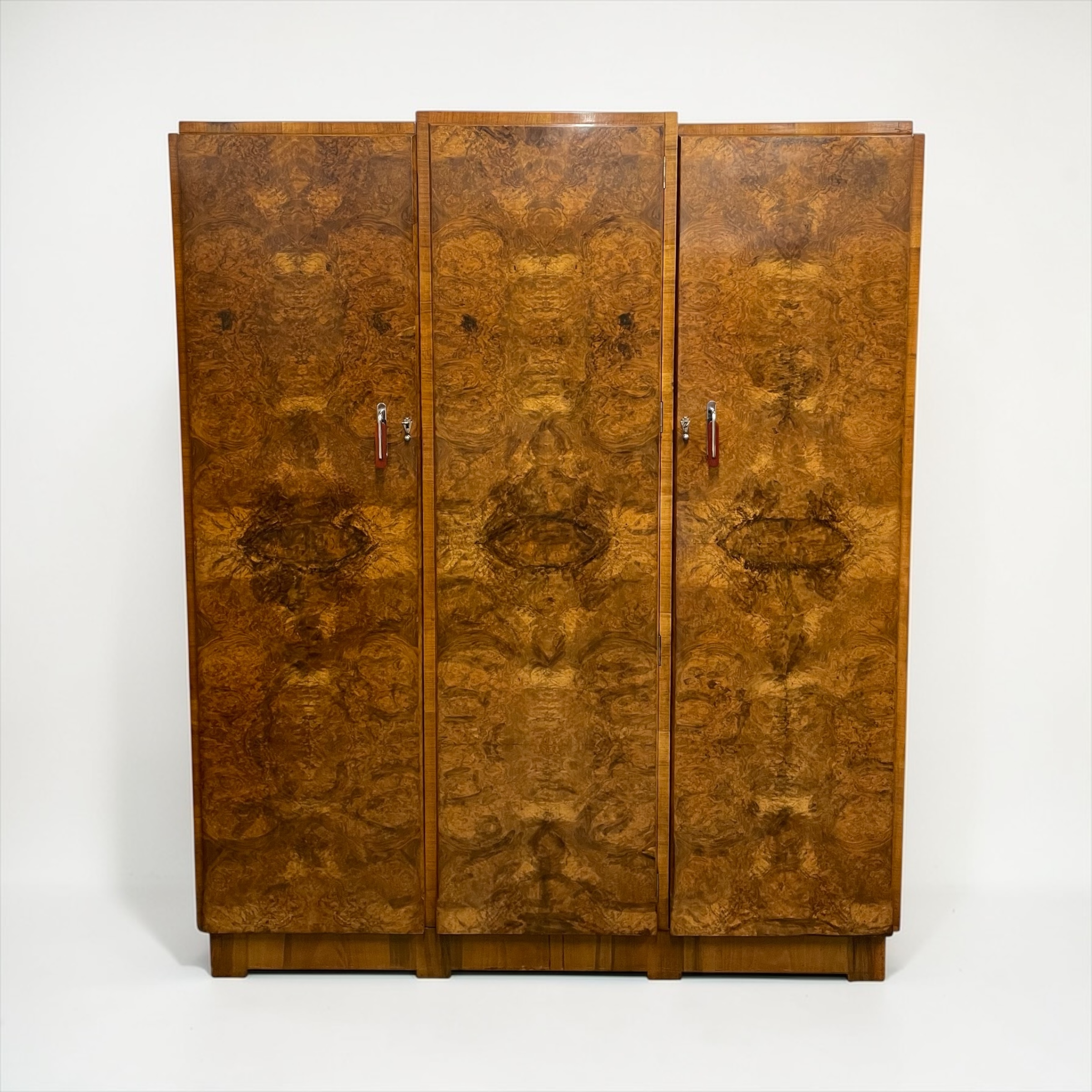 A Fine Art Deco triple wardrobe. In highly figured walnut with excellent chrome and red phenolic handles and chrome fan shaped escutcheons.