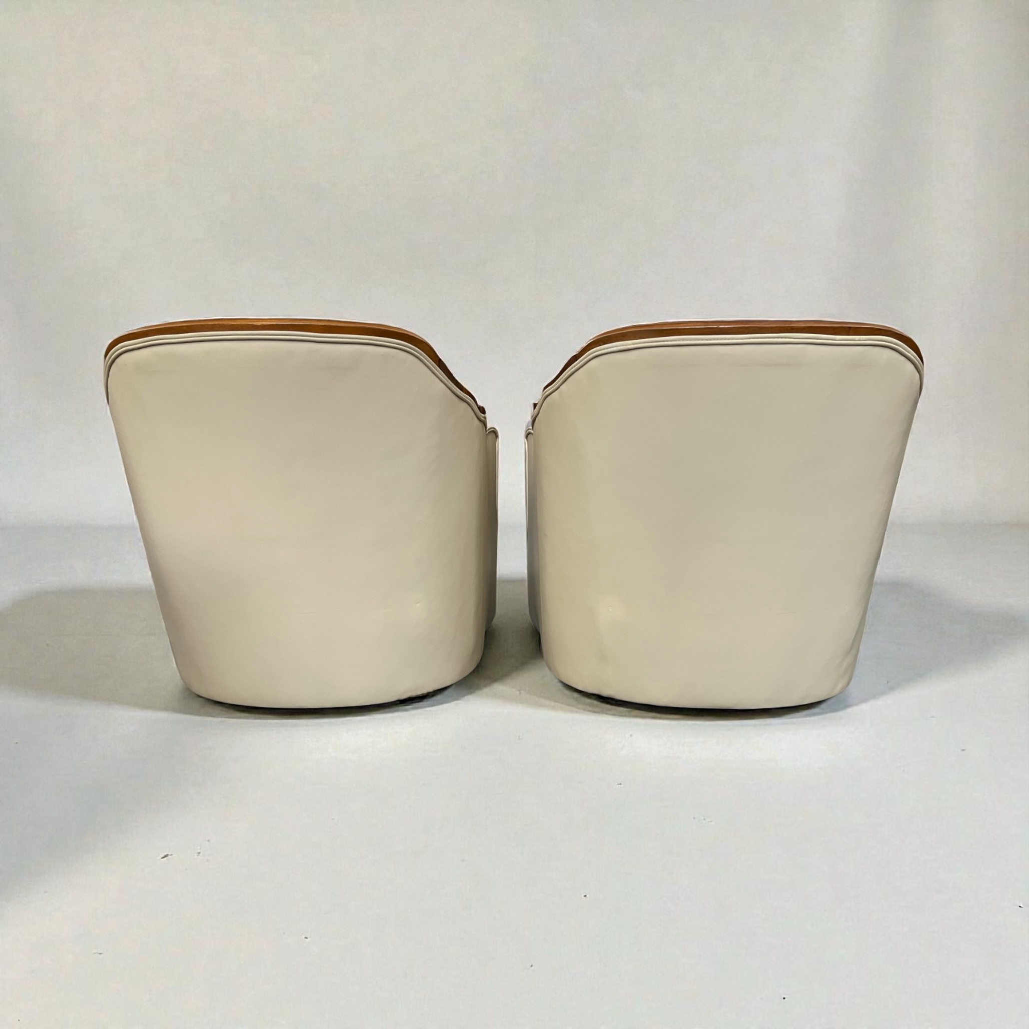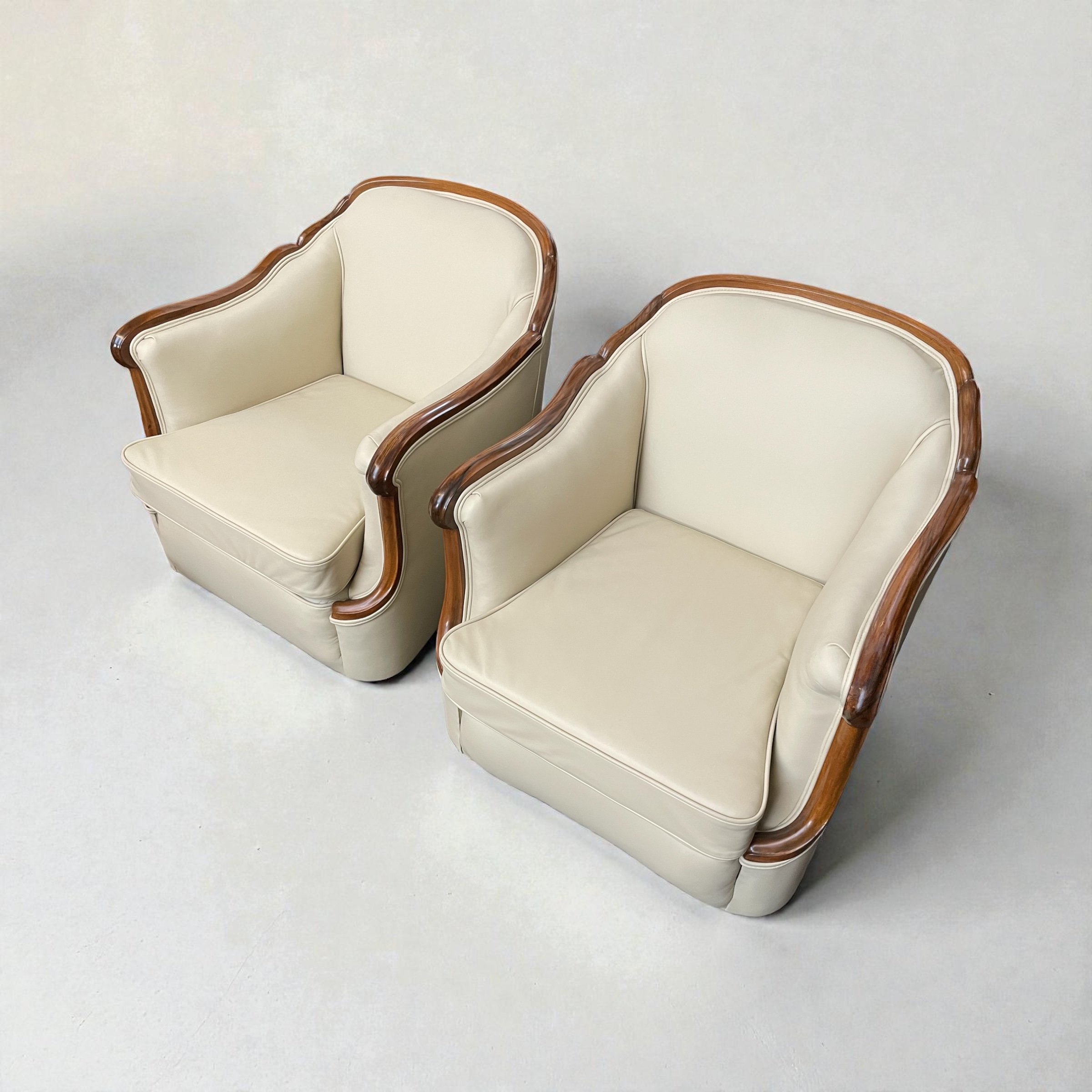 A fine Art Deco pair of armchairs by Maurice Adams. The chairs with elegant curved solid walnut detailing, sprung seats and reupholstered in soft cream leather and raised on chrome castors.