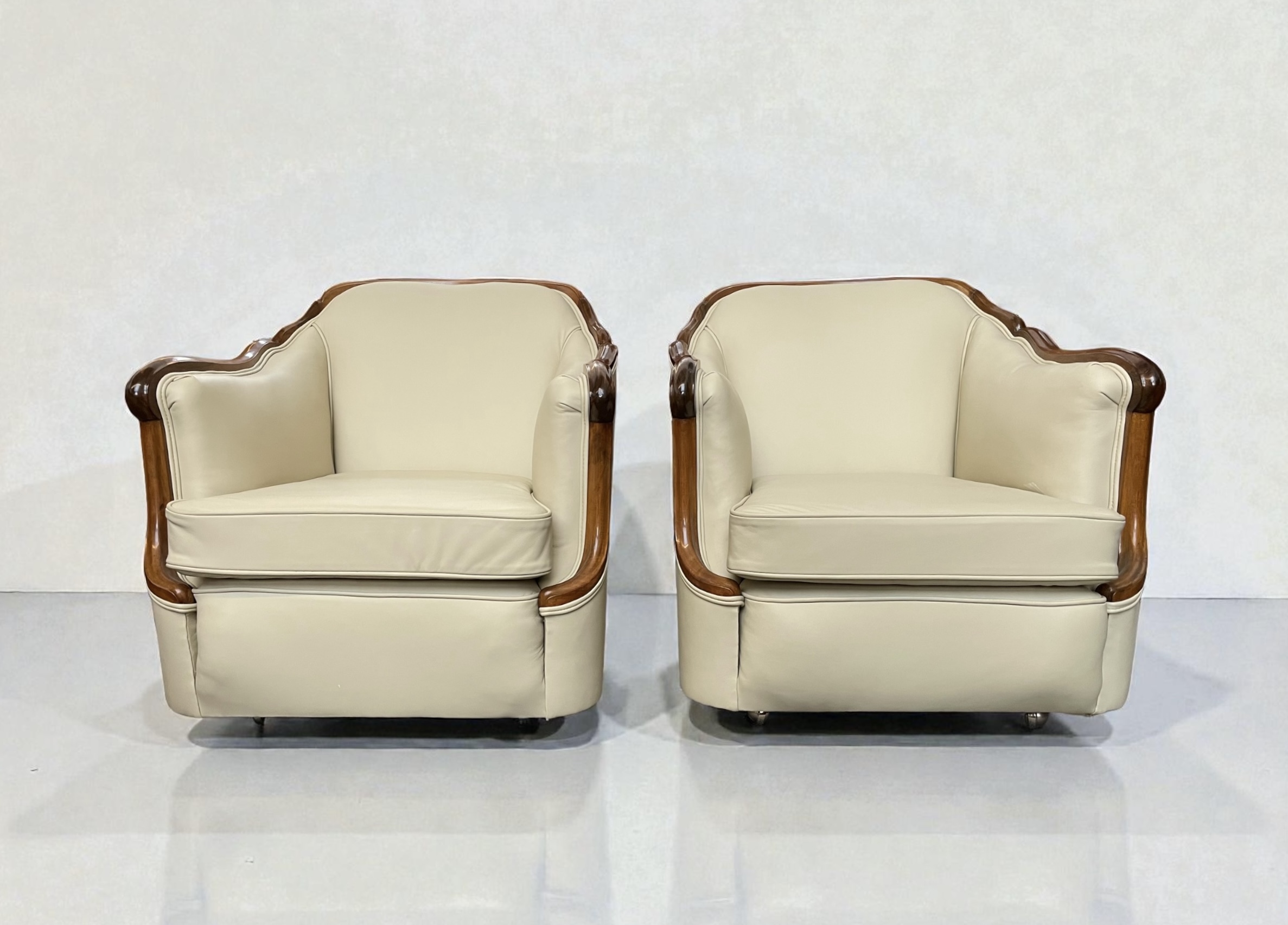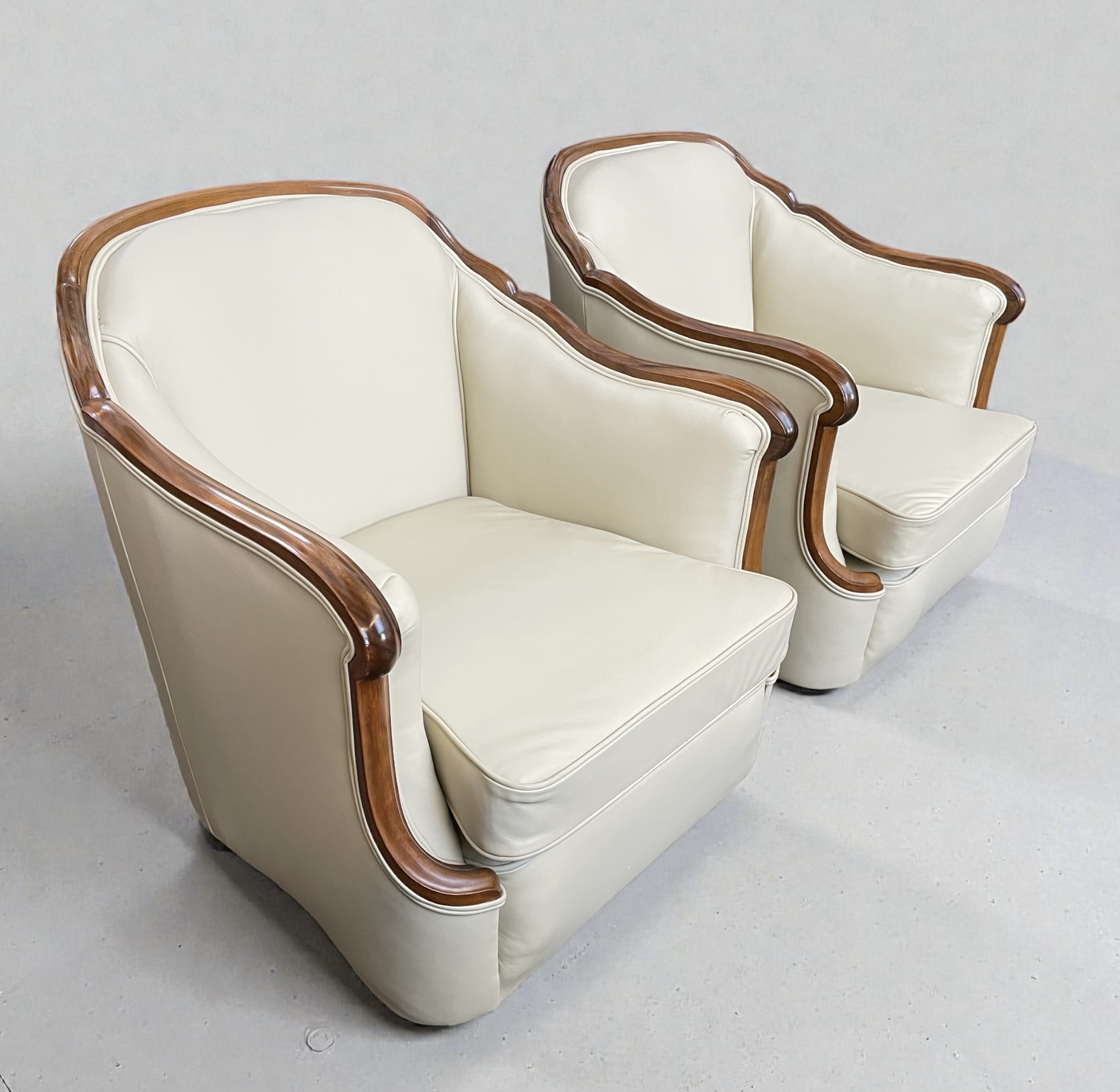 A fine Art Deco pair of armchairs by Maurice Adams. The chairs with elegant curved solid walnut detailing, sprung seats and reupholstered in soft cream leather and raised on chrome castors.