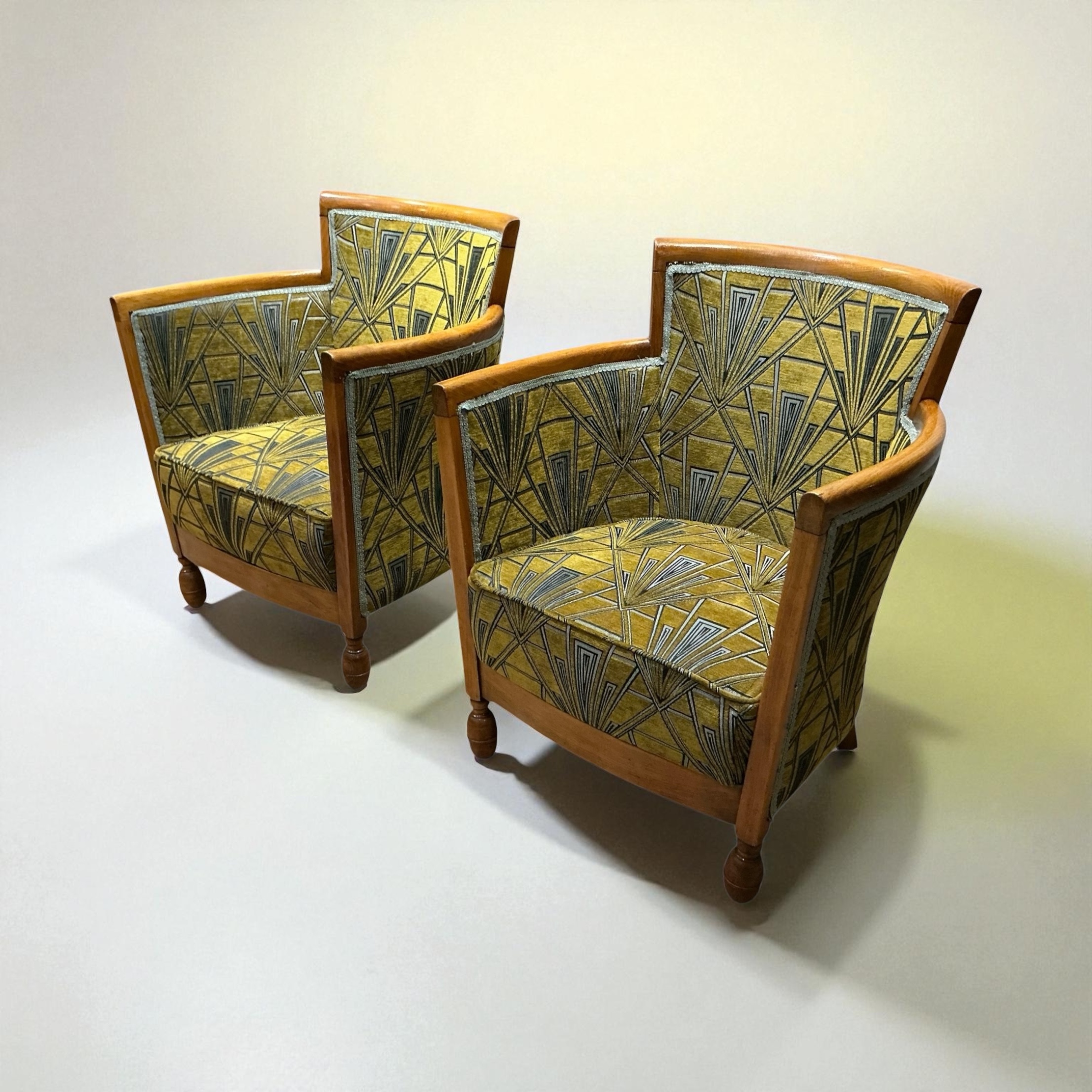 A Pair of Art Deco chairs, with a beech frame and upholstered by the last owner in a striking green, grey and silver Art Deco patterned fabric.