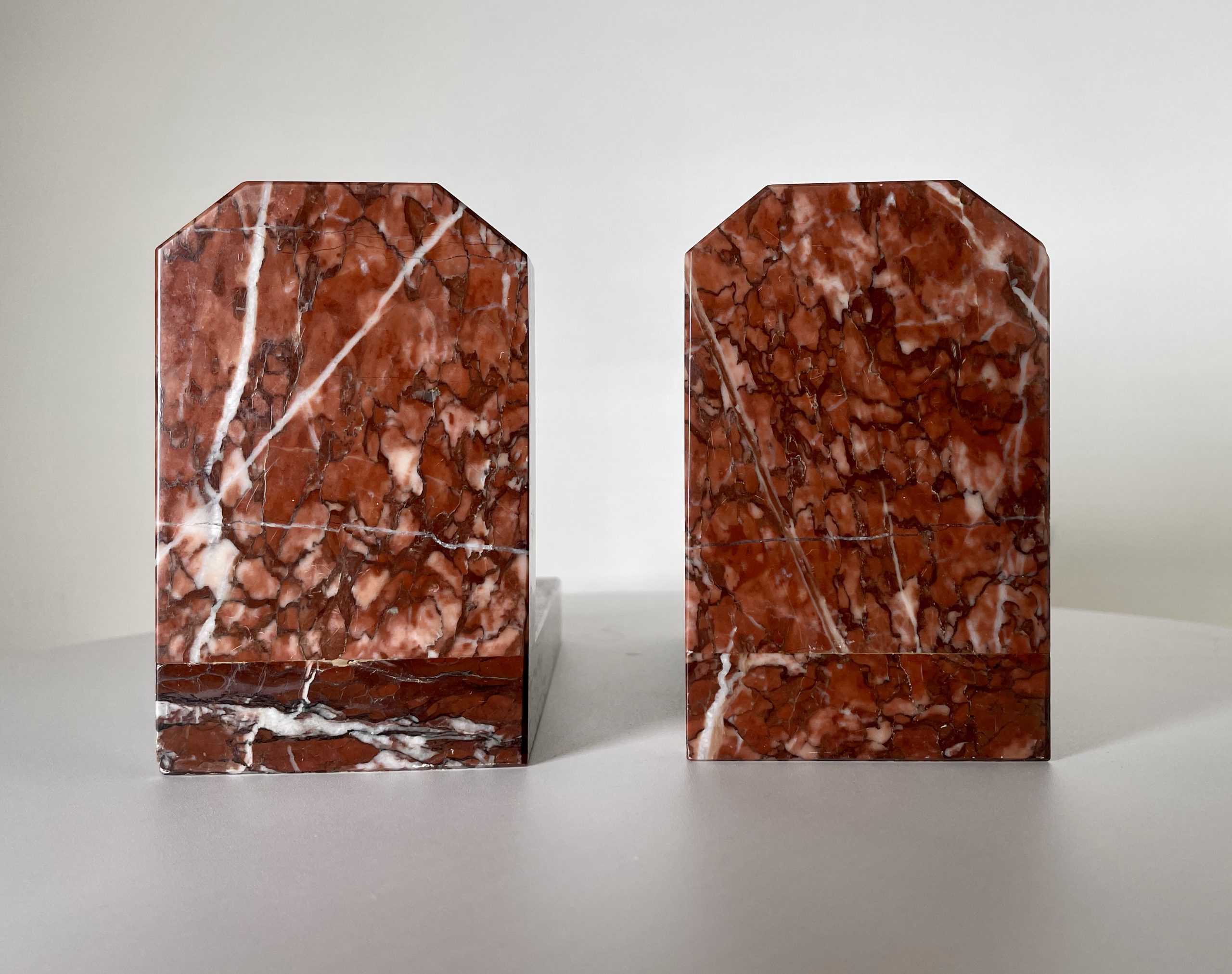 A Pair of French Art Deco Bookends. On each bookend a pair of silvered birds sit on a cluster of toadstools. Each mounted on attractive red veined marble.