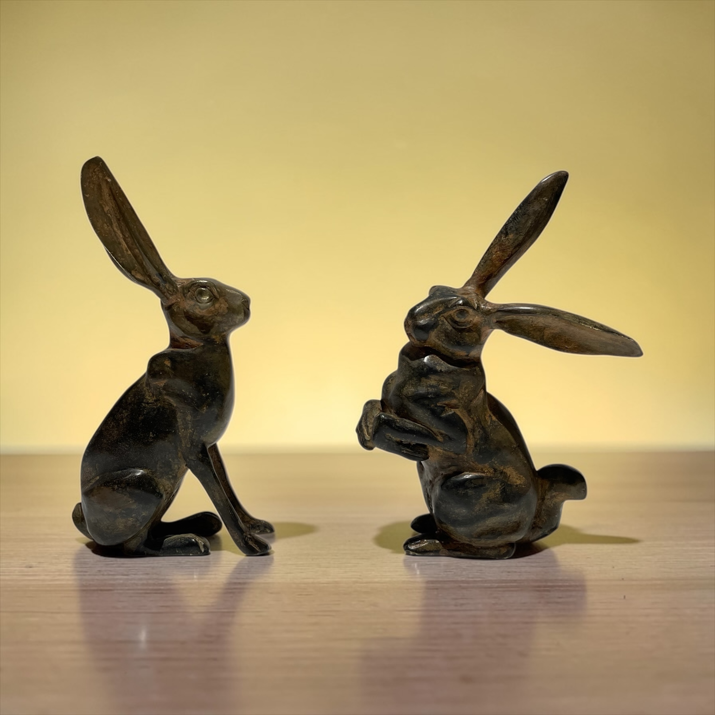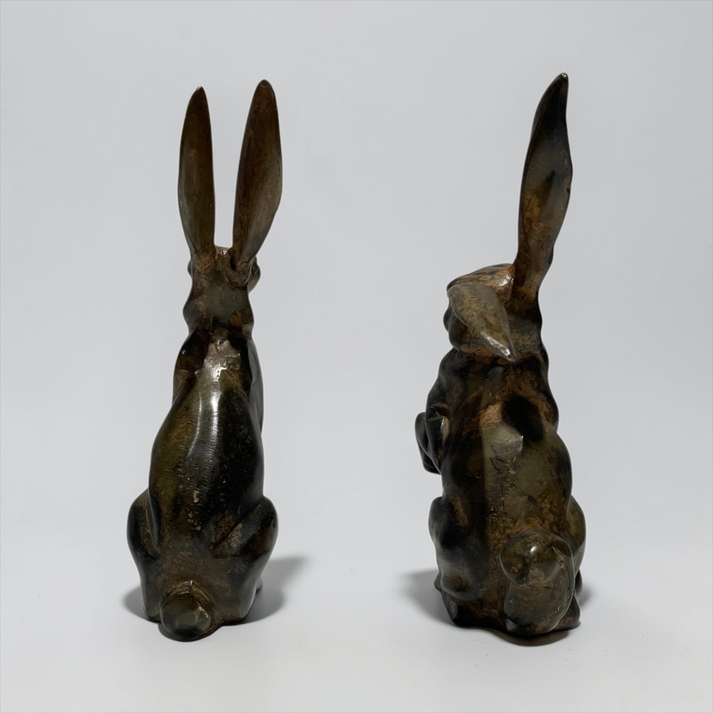 A pair of stylised, bronze hares. by the renowned sculptor, Pierre Chenet. His foundry mark, featuring his name and circular crown to each of the undersides.