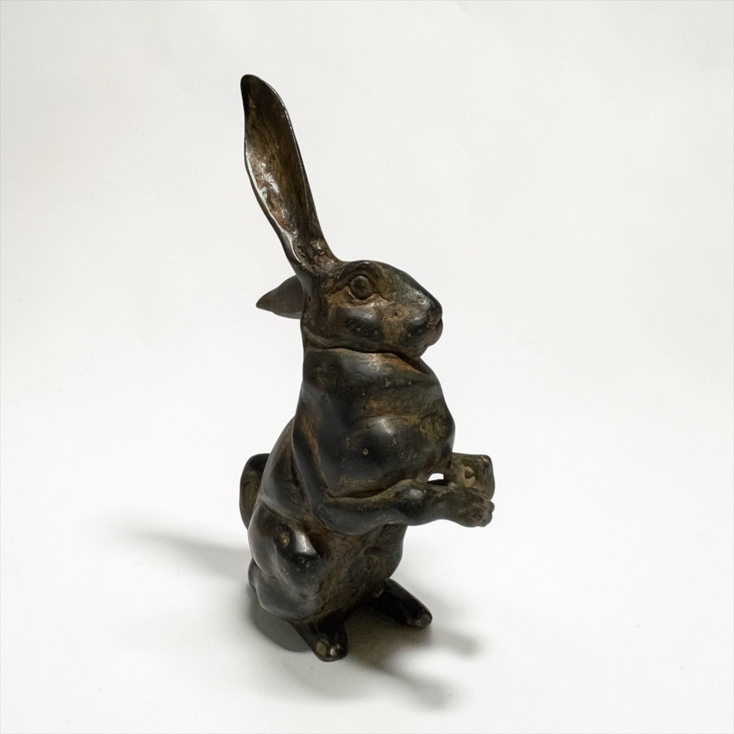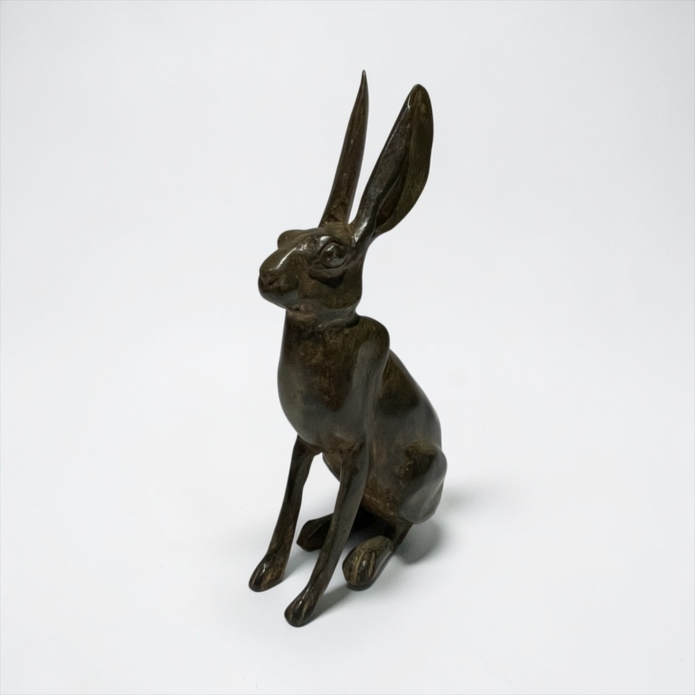 He is renowned for a unique ‘acid patina’ technique. This process involves acid washing the bronze to create a varied, nuanced brown or green patinated effect, ensuring that no two pieces have identical colouring. His modernist style balances naturalistic observation with simplified, smooth forms that capture the essential character of his subjects.