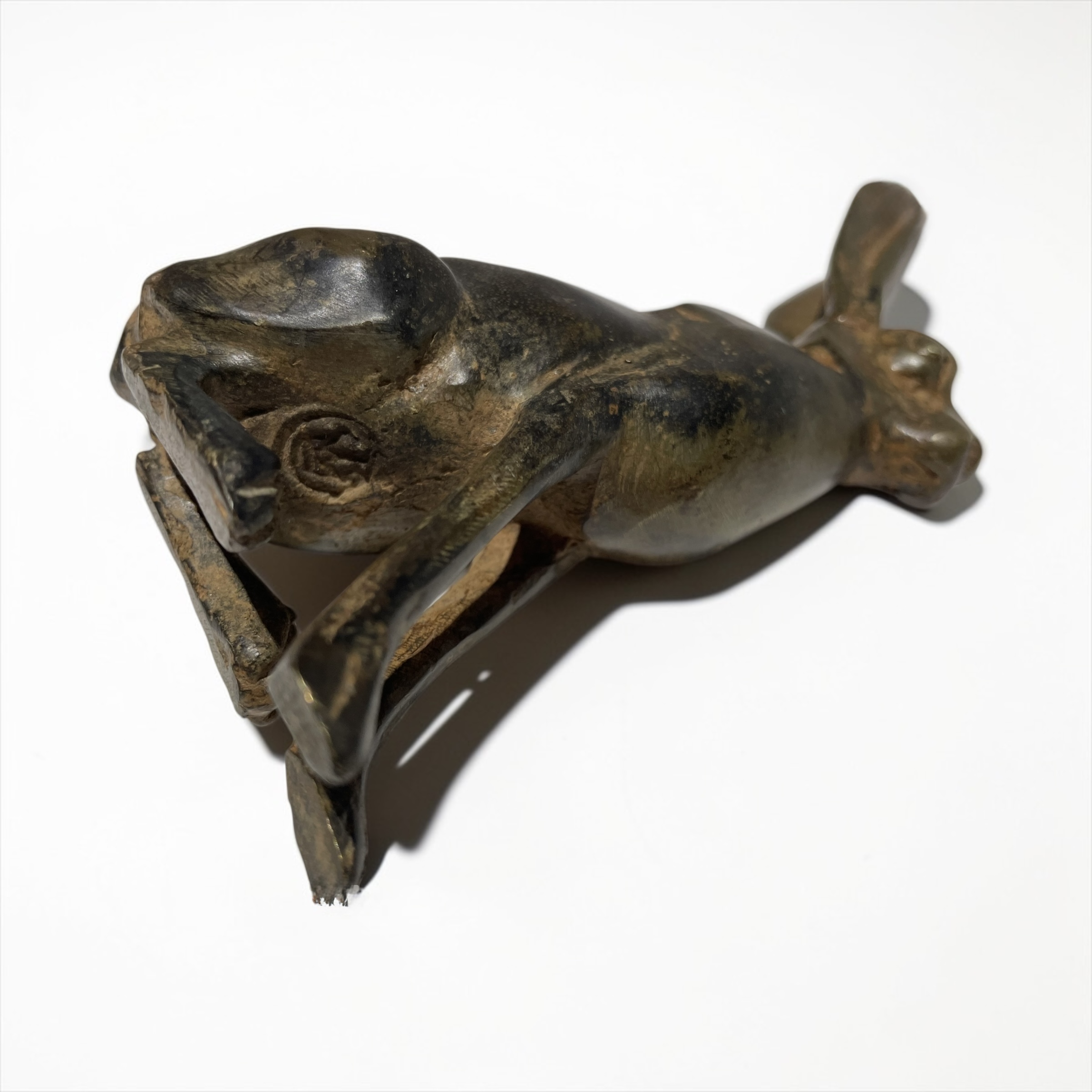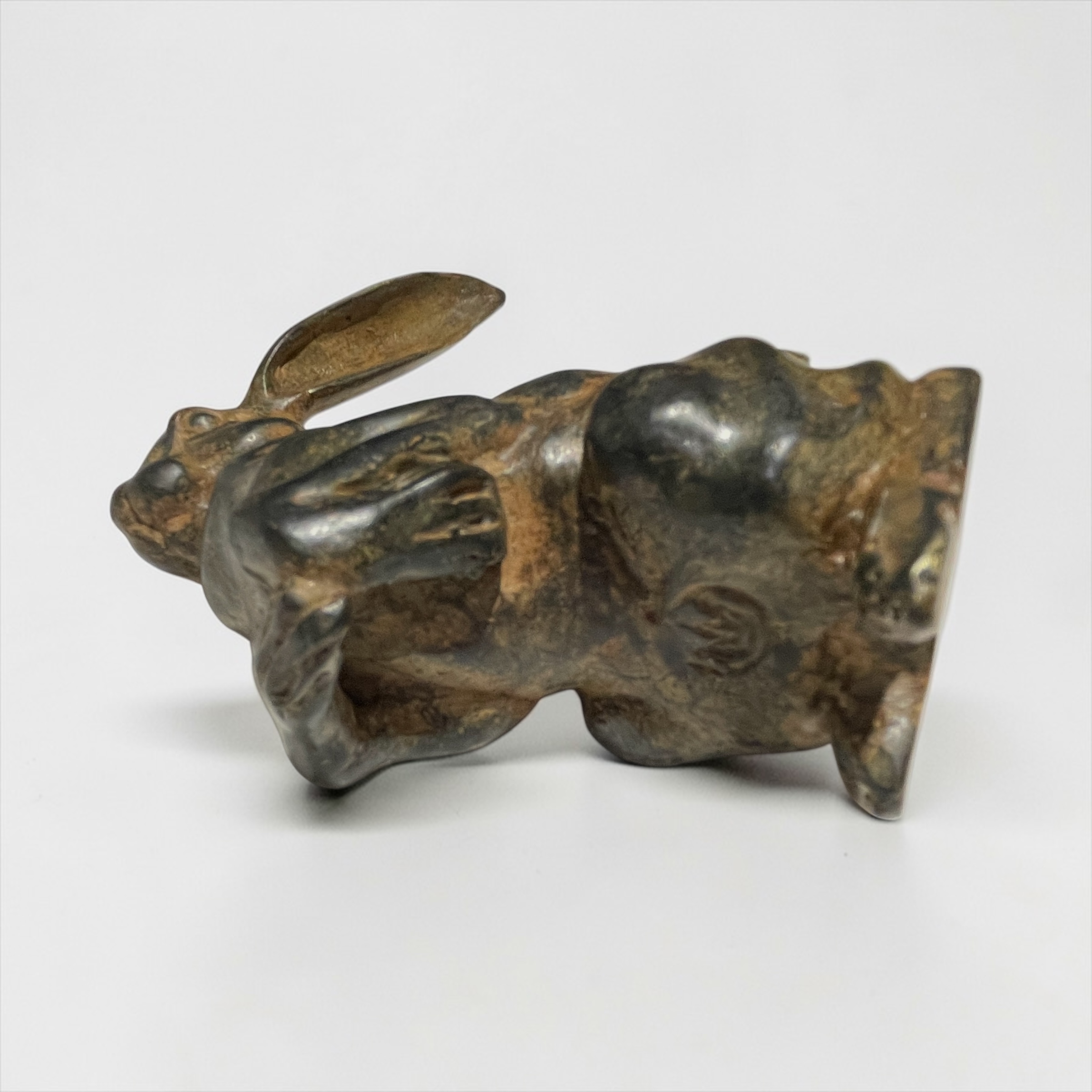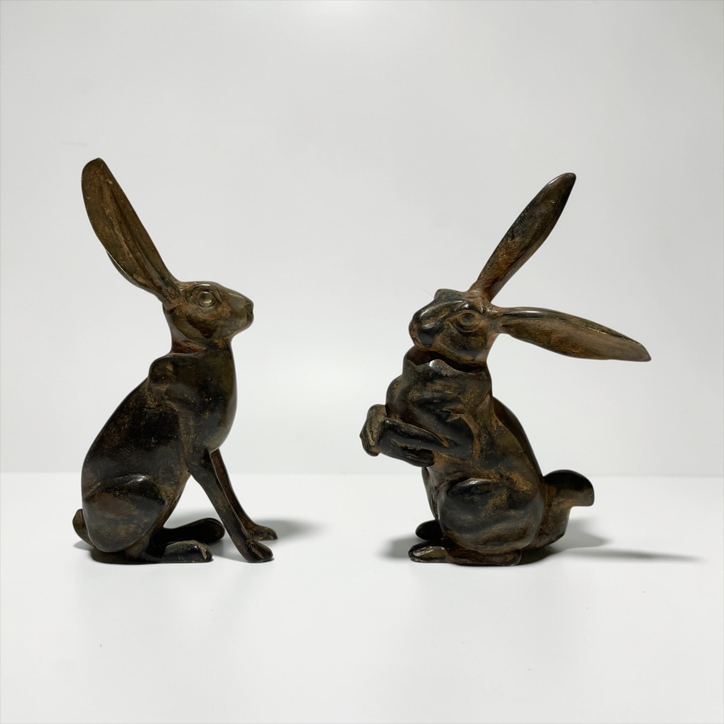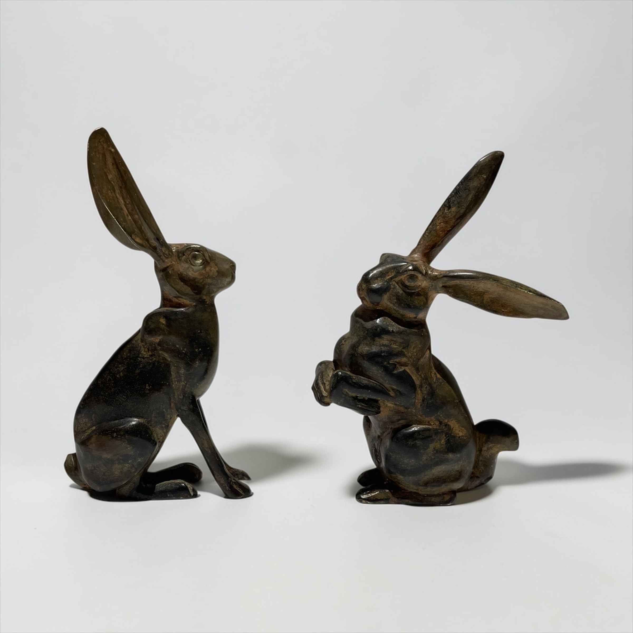 A pair of stylised, bronze hares. by the renowned sculptor, Pierre Chenet. His foundry mark, featuring his name and circular crown to each of the undersides.