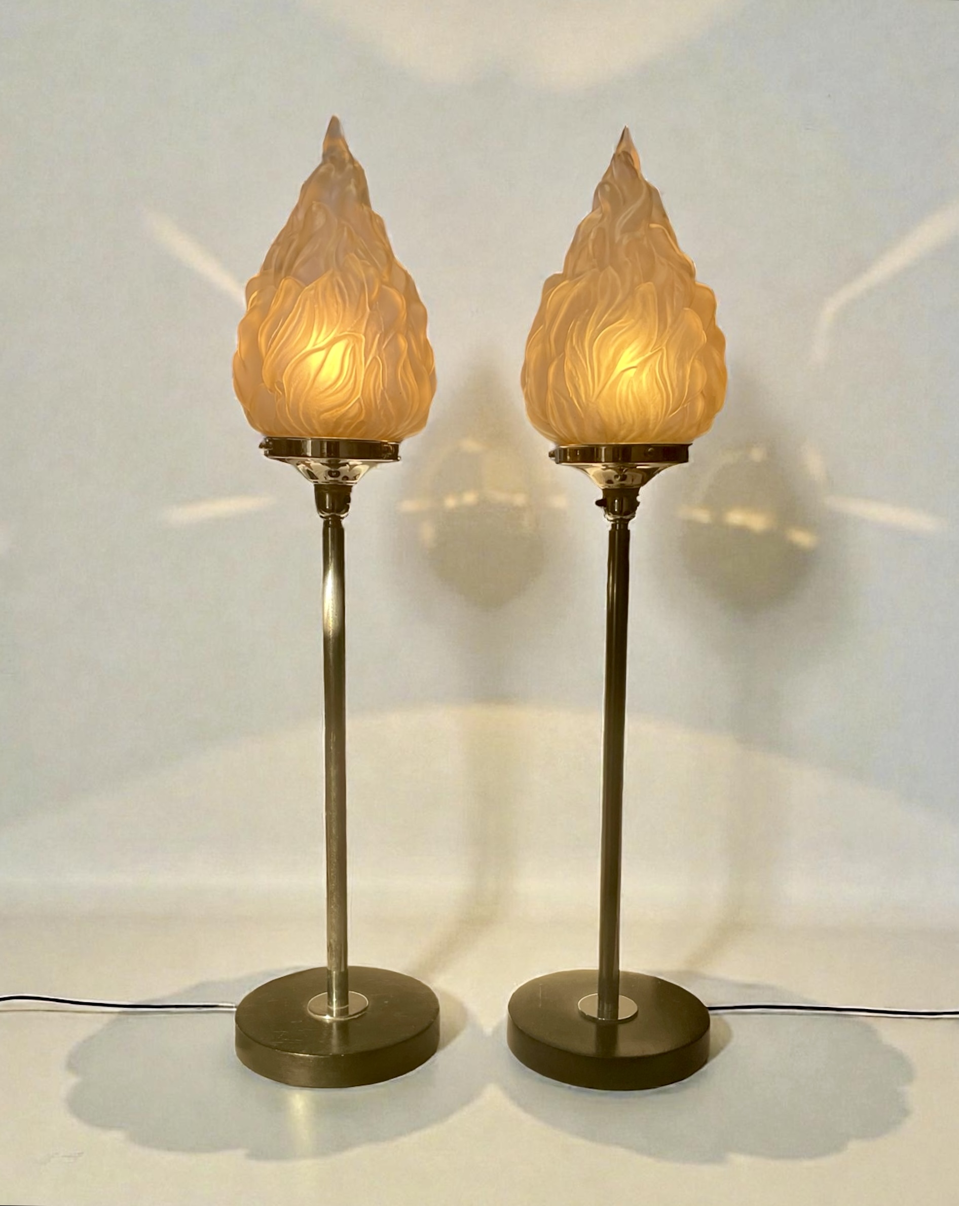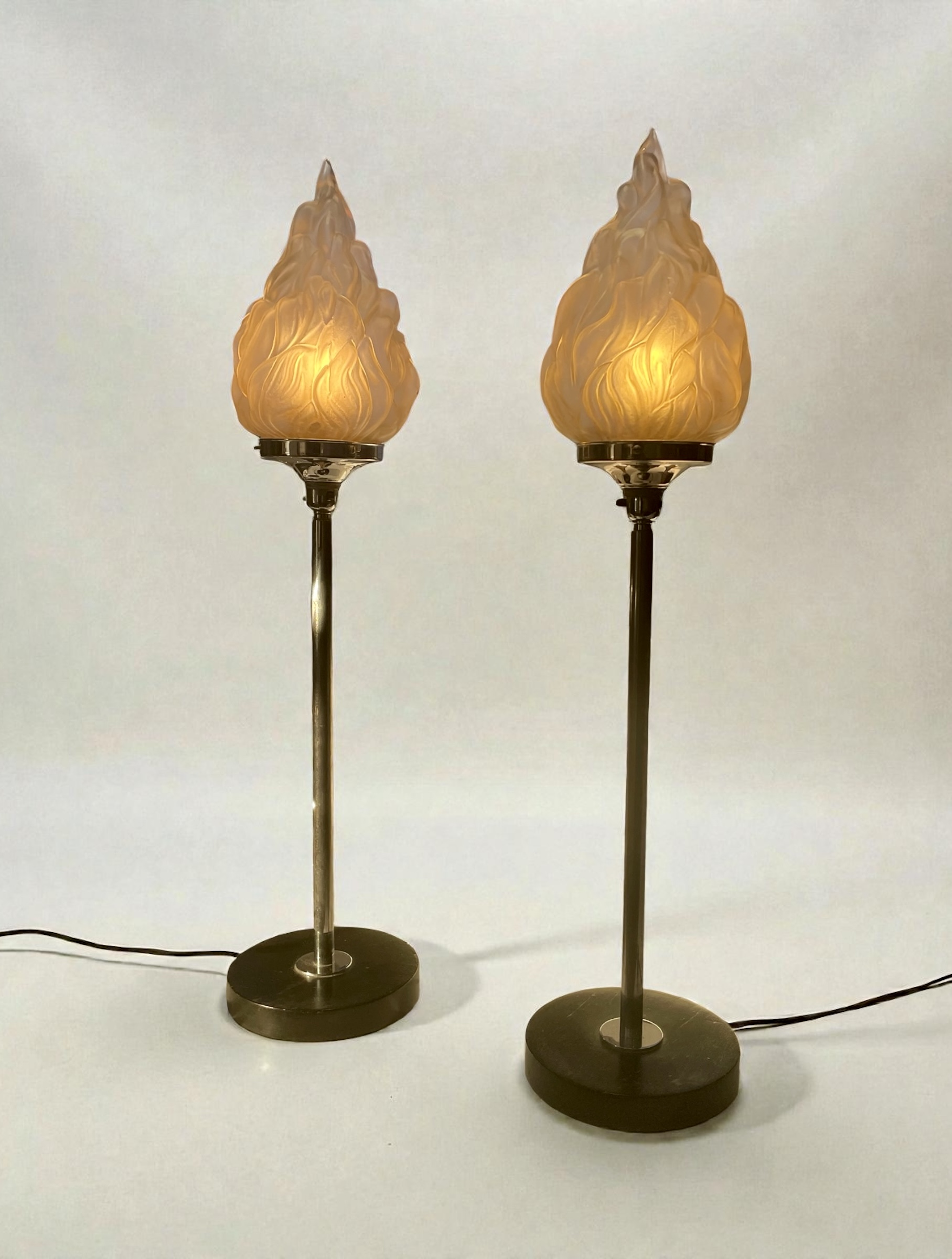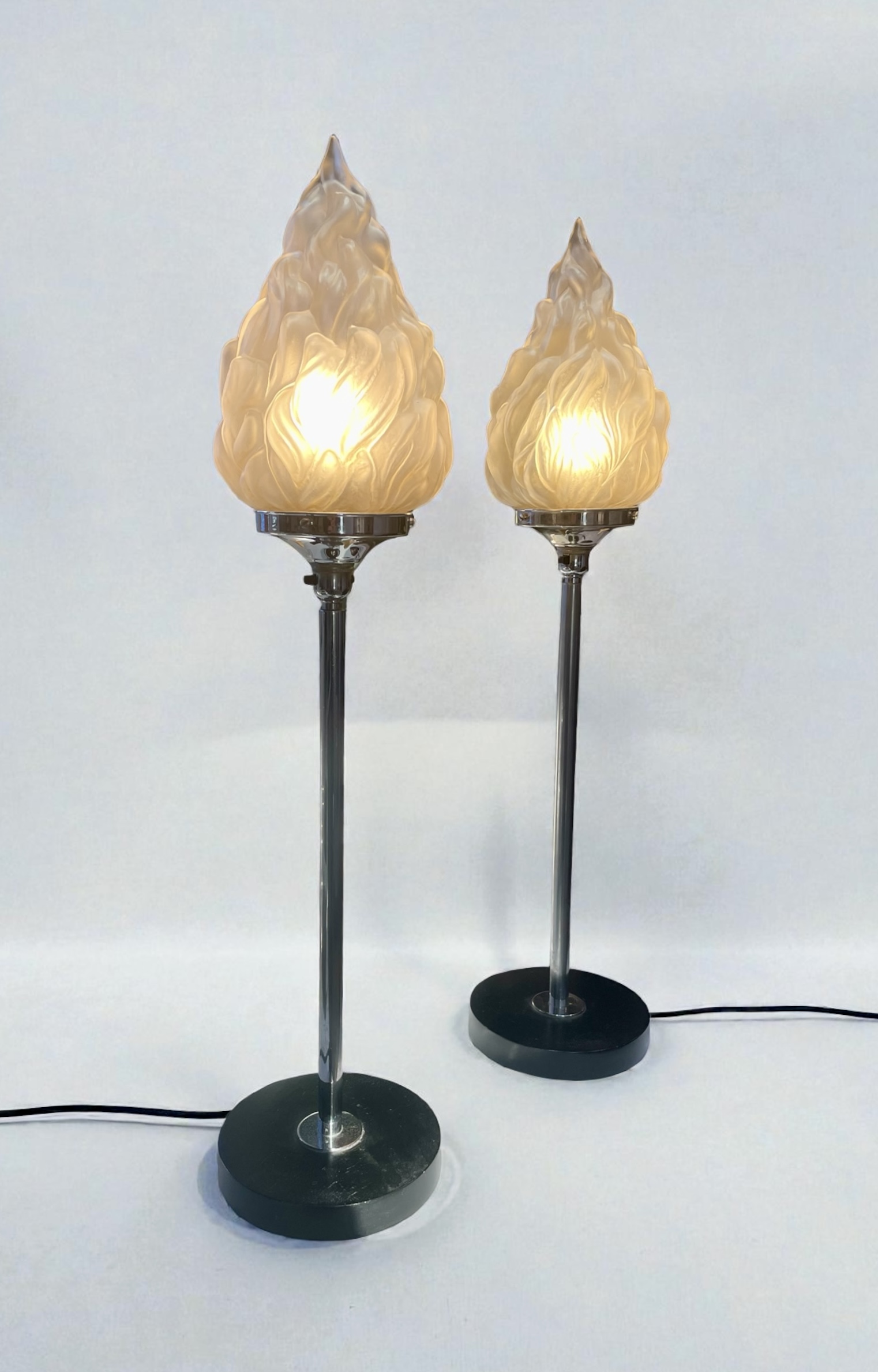 A particularly tall pair of Art deco lamps, with flame effect opaque glass shades, chrome columns and circular ebonised bases. Recently rewired with black authentic cord lead and PAT tested.