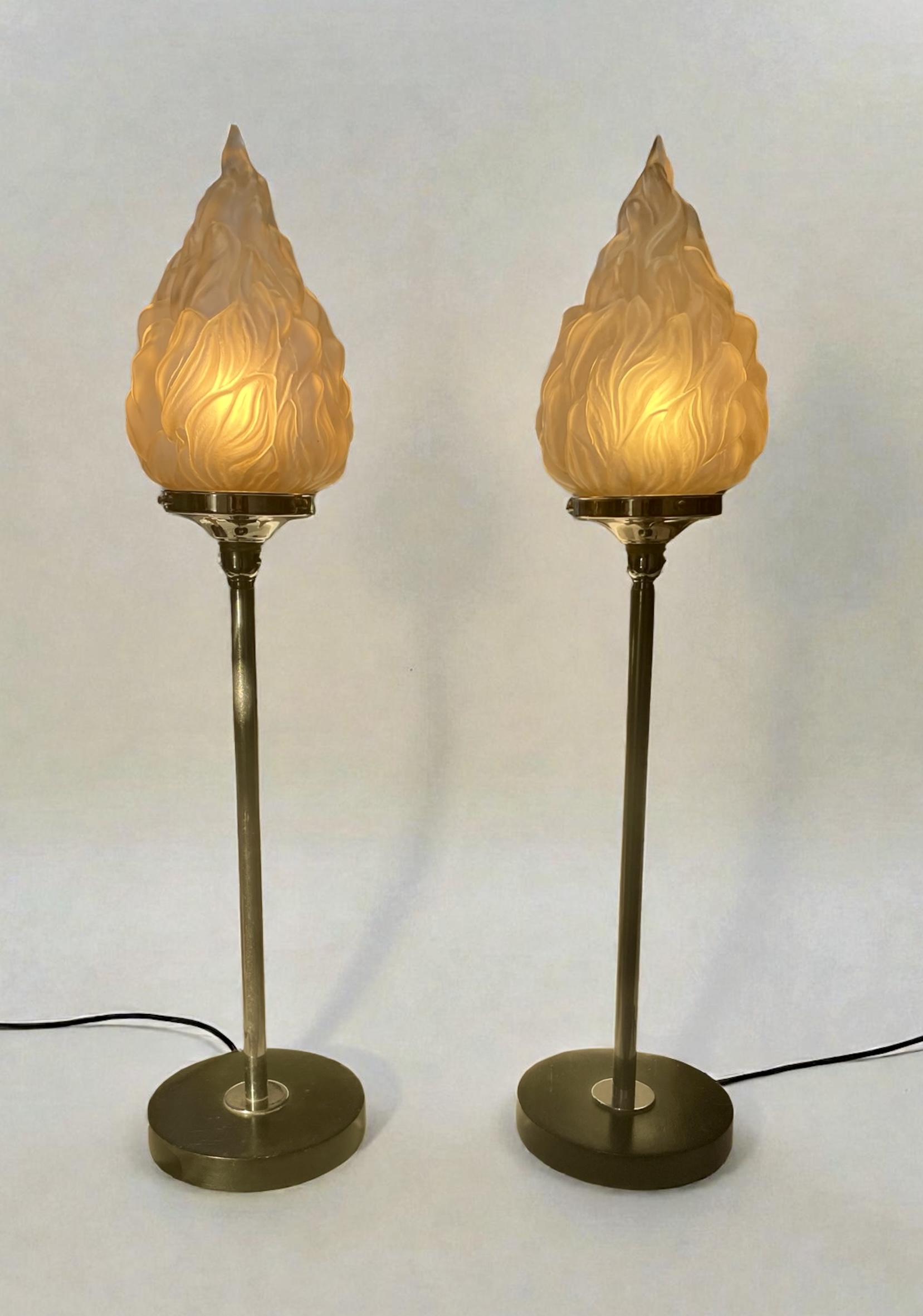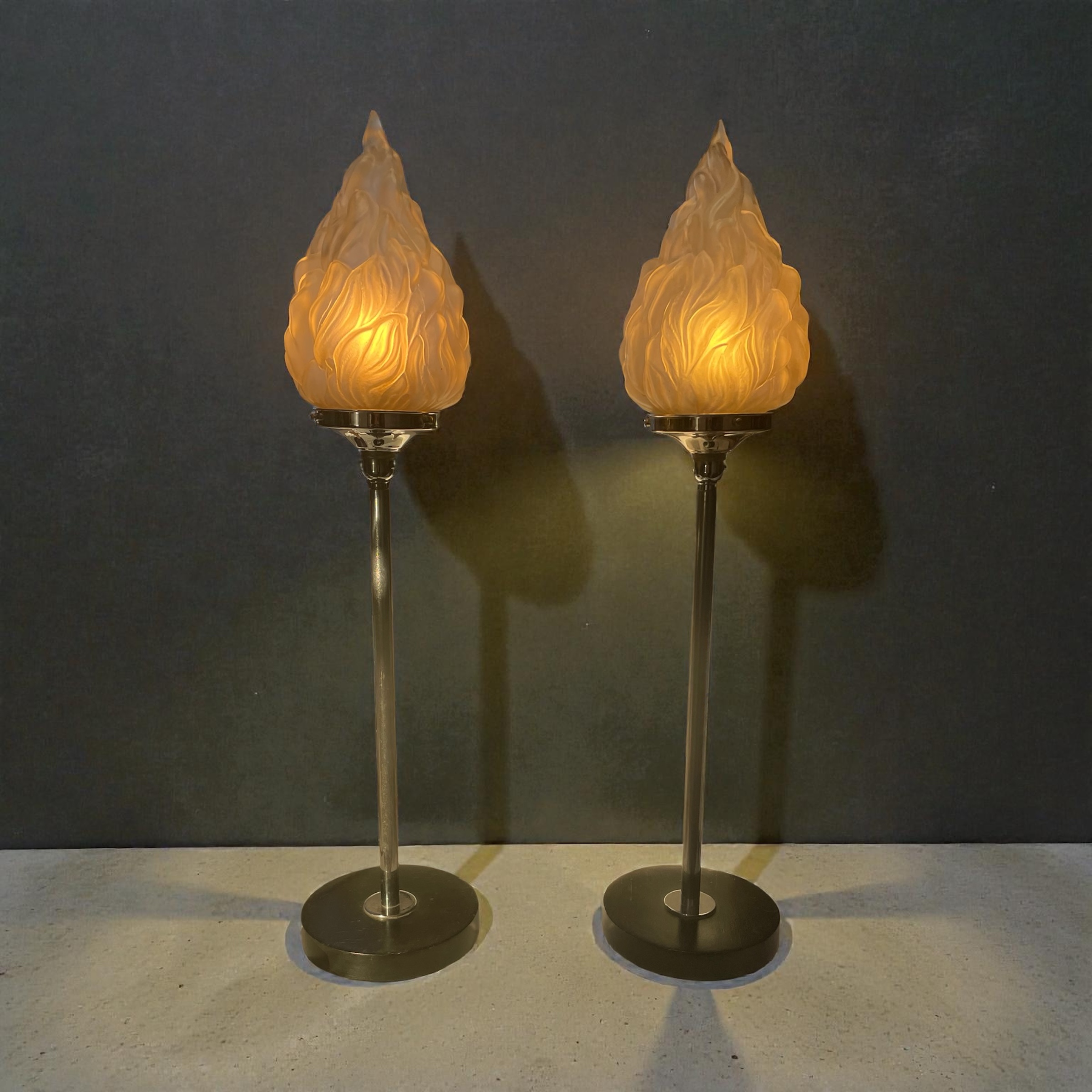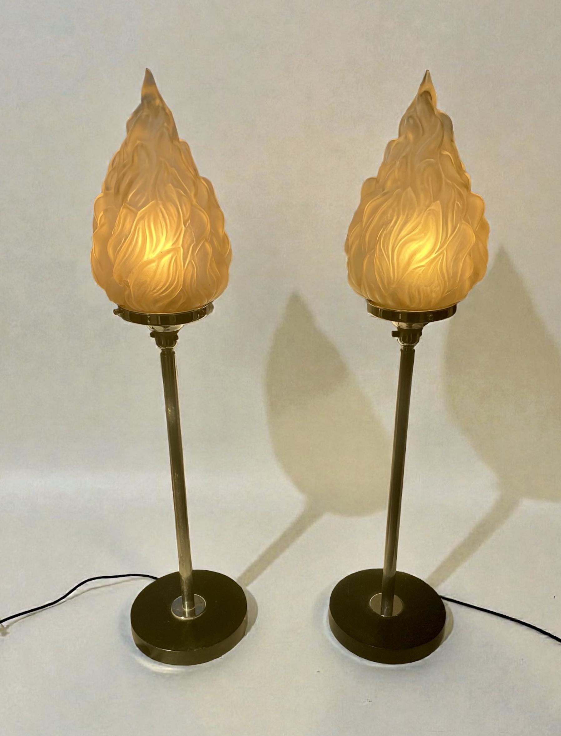 A particularly tall pair of Art deco lamps, with flame effect opaque glass shades, chrome columns and circular ebonised bases. Recently rewired with black authentic cord lead and PAT tested.