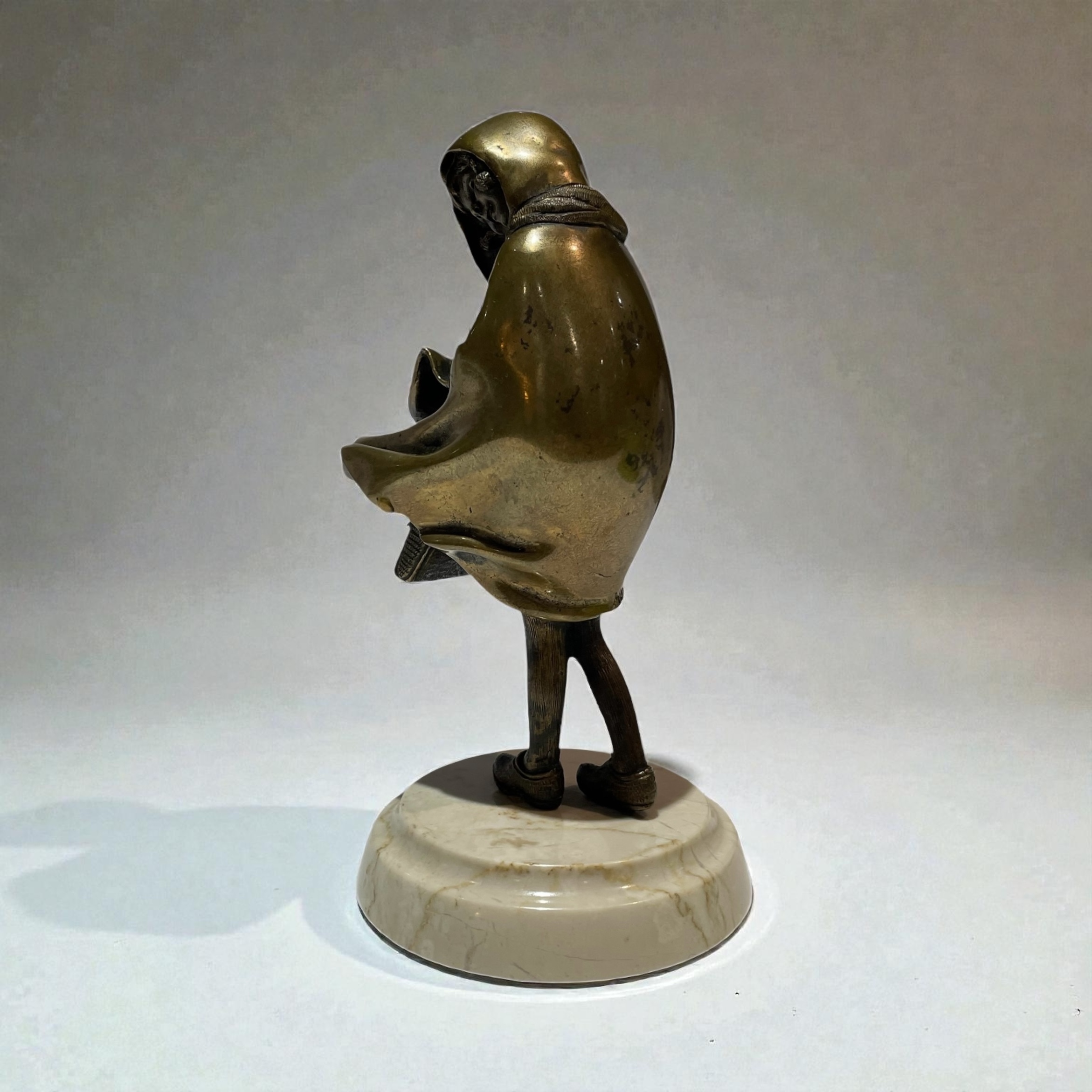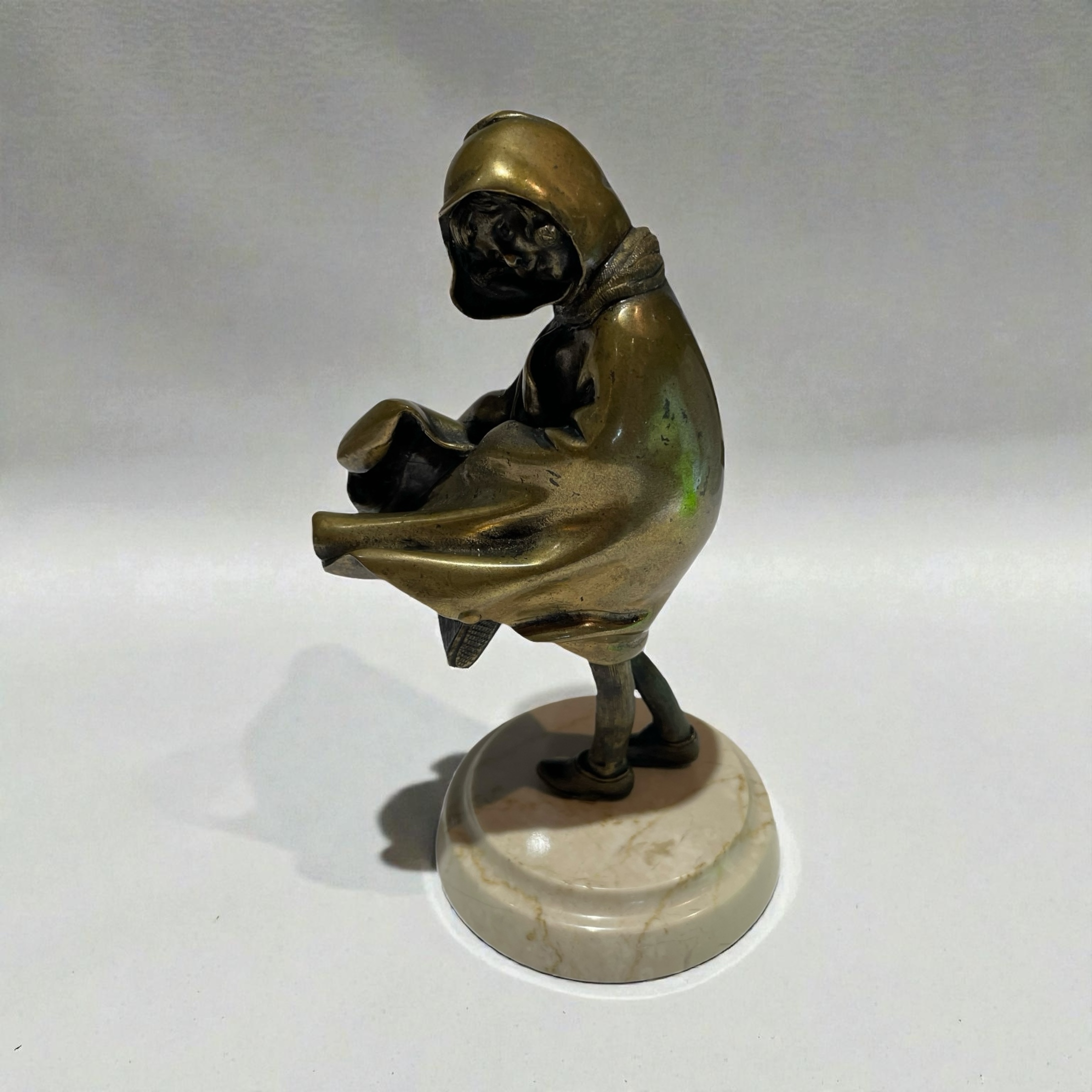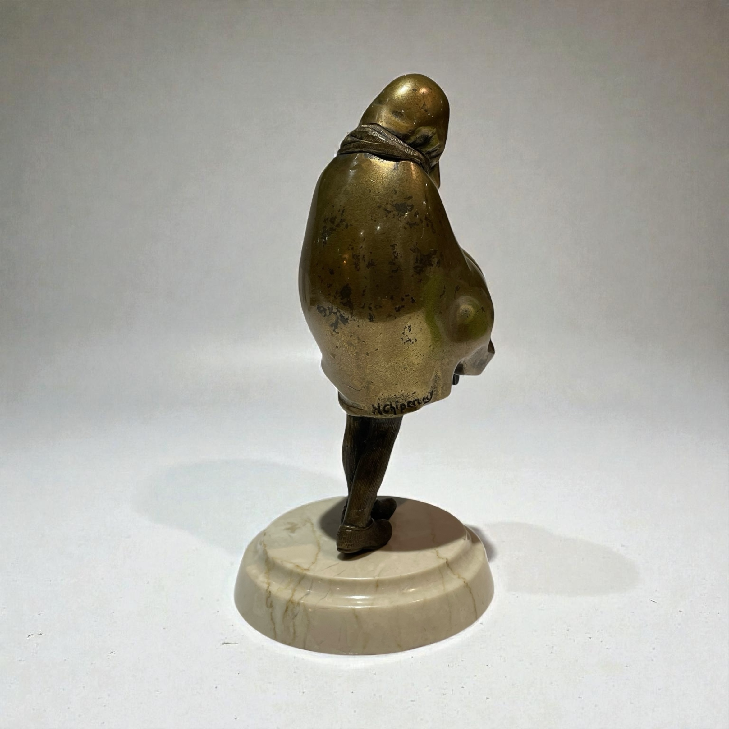 A patinated bronze figure of a young girl. Beautifully executed, wearing a cloak and walking in a strong wind, and concealing her satchel under her cloak. Raised on a moulded, circular, cream veined marble base and signed to the back of the cloak, H. Chiparus.
