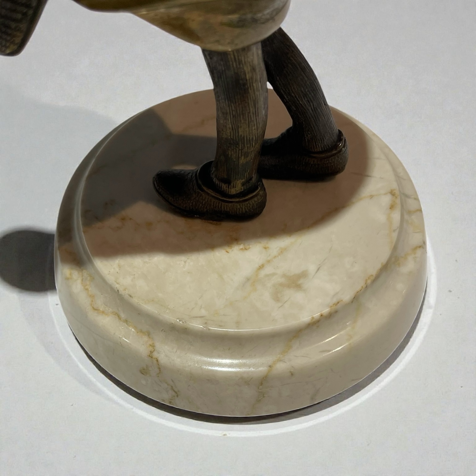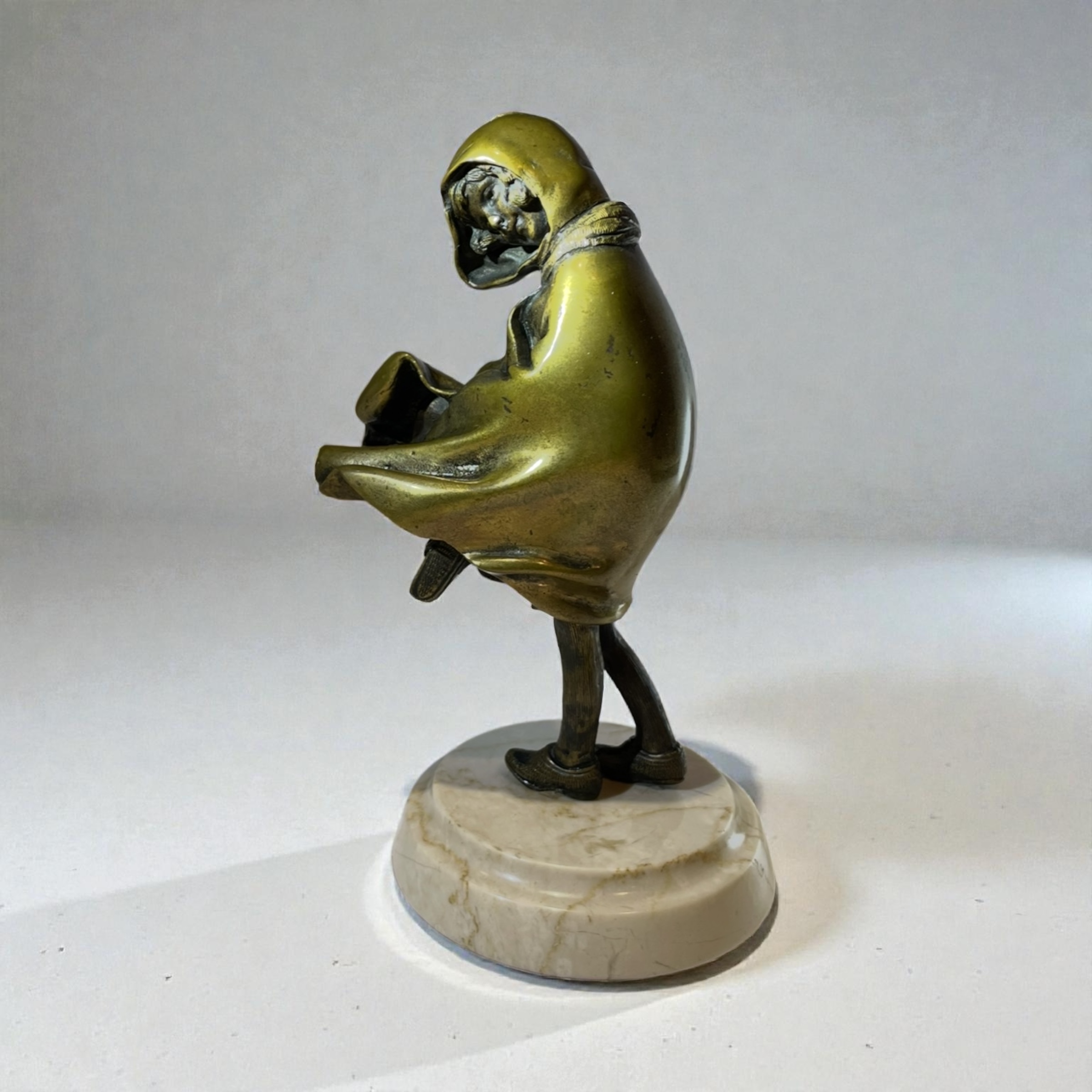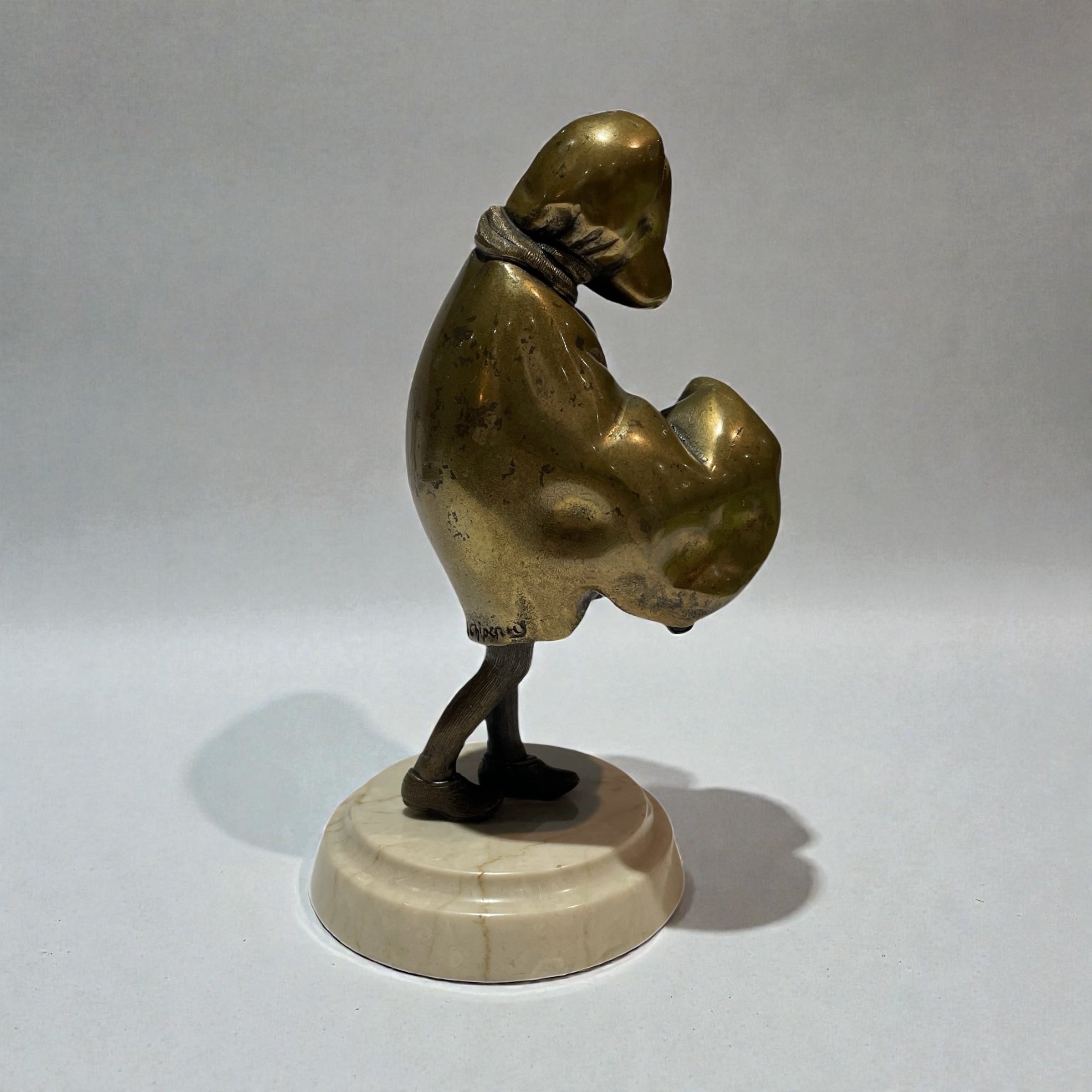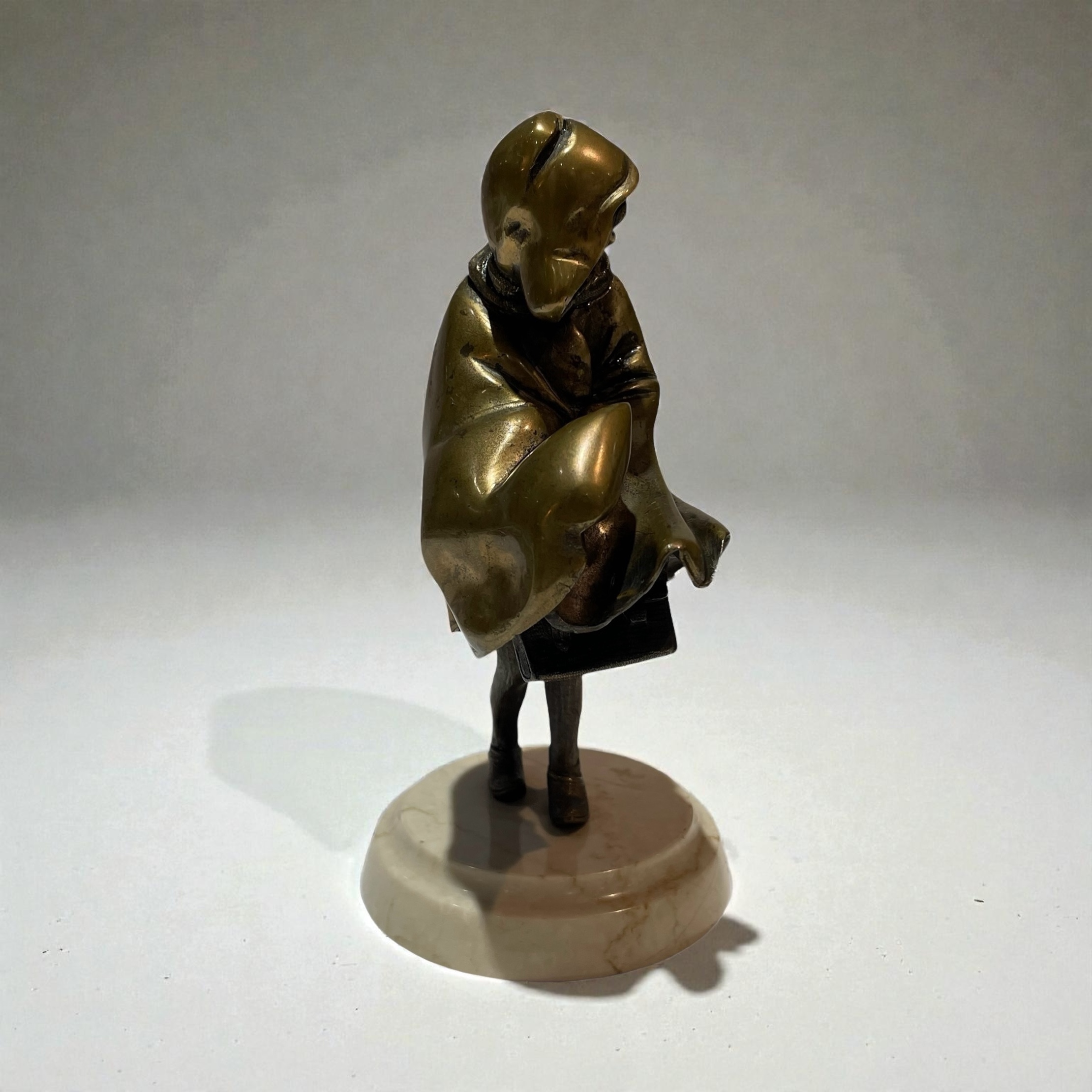A patinated bronze figure of a young girl. Beautifully executed, wearing a cloak and walking in a strong wind, and concealing her satchel under her cloak. Raised on a moulded, circular, cream veined marble base and signed to the back of the cloak, H. Chiparus.