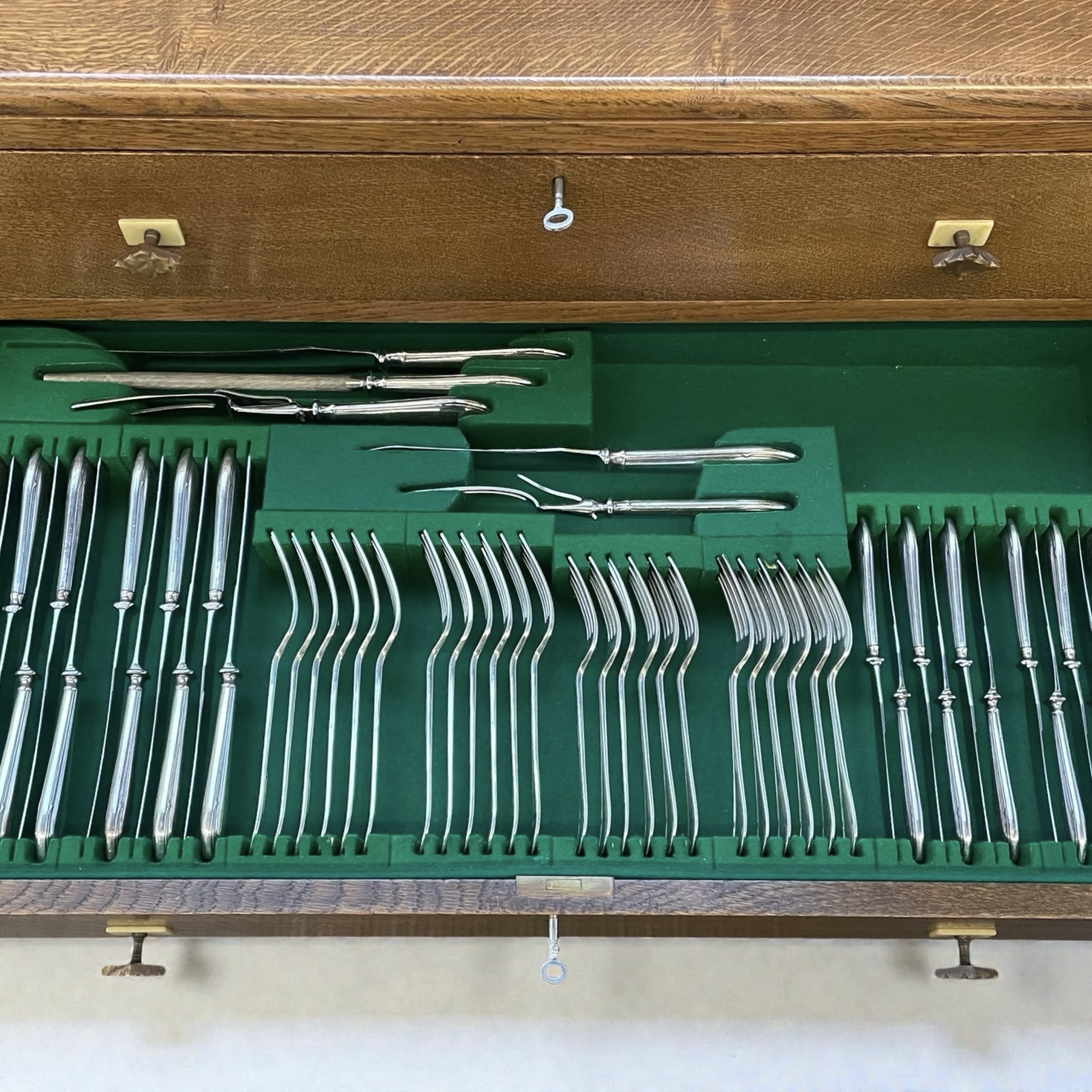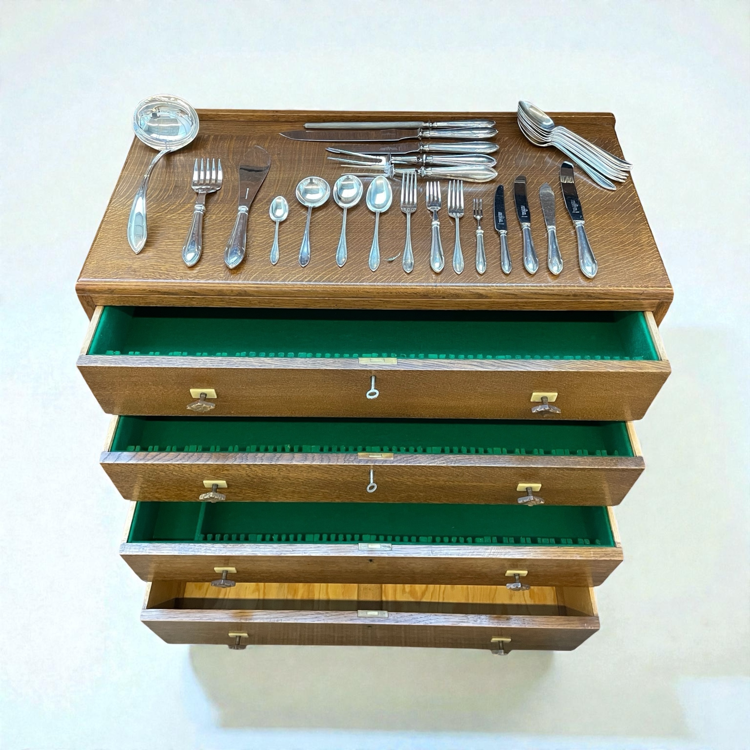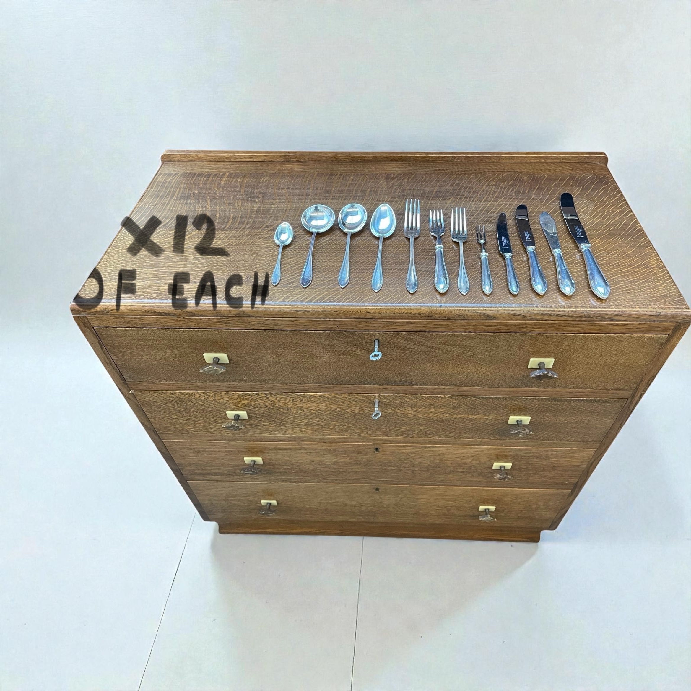 An Art Deco 158 piece canteen of silver plate cutlery housed in its four drawer free standing cabinet. A 12 place set, each consisting of twelve pieces, accompanied by a large ladle, a serving knife and fork, 6 serving spoons, 2 meat forks, 2 meat knives and a knife sharpener. Made by the highly regarded company, Joseph Rodgers and Sons, the holder of five Royal Warrants.