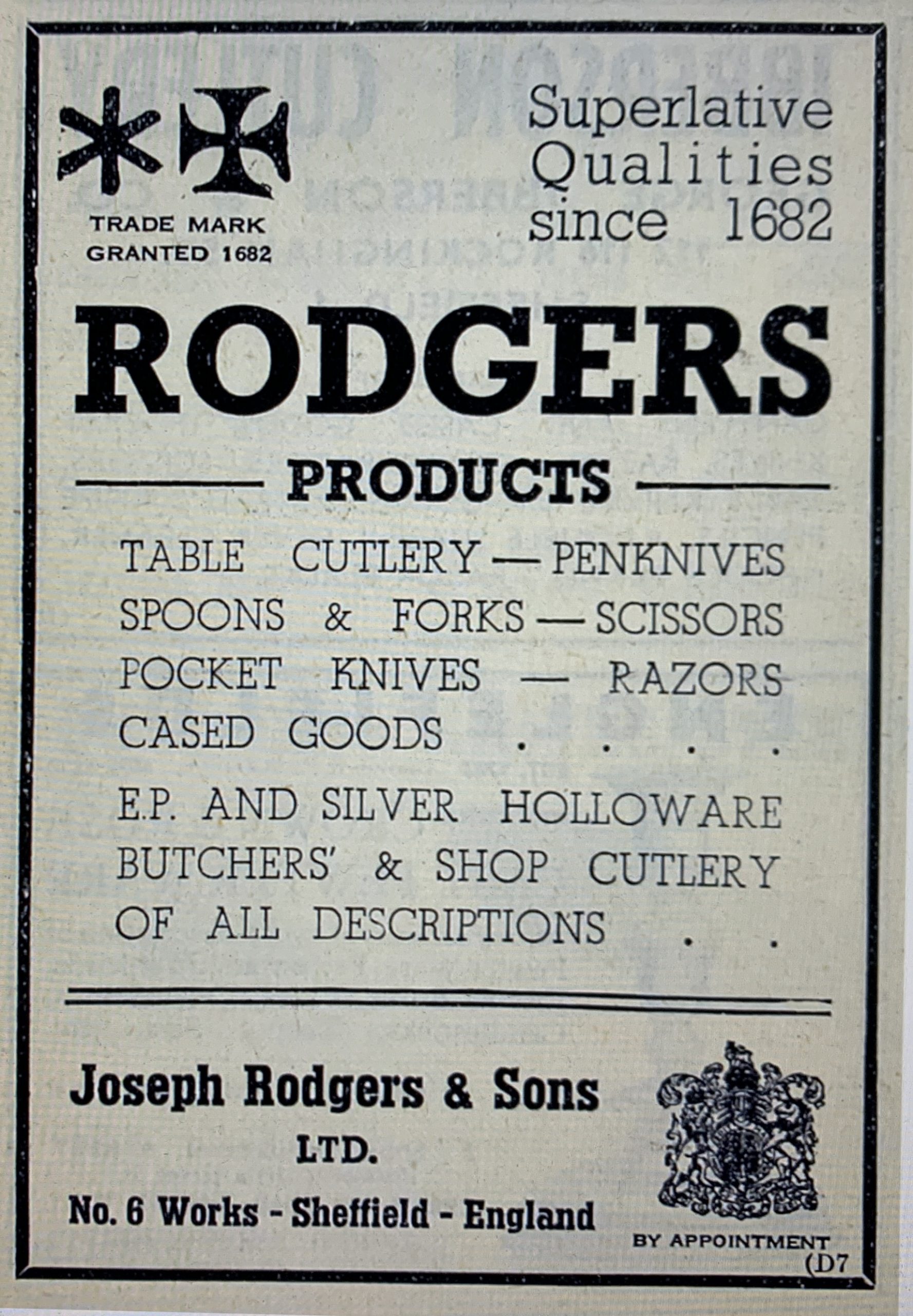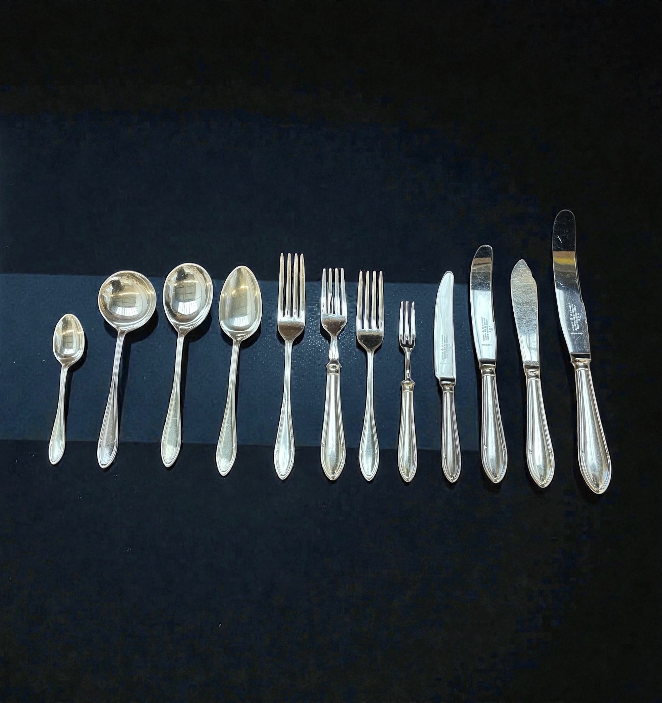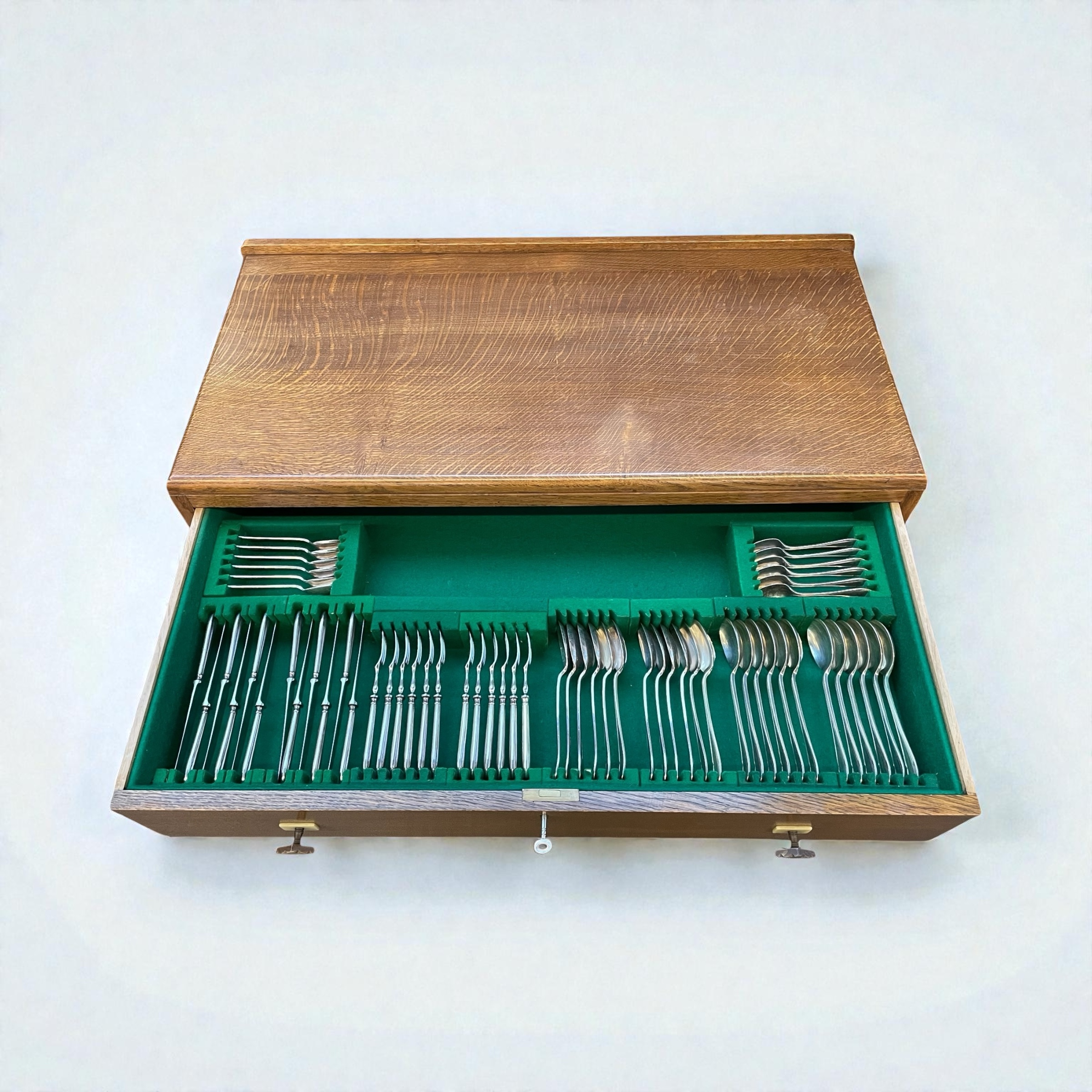 An Art Deco 158 piece canteen of silver plate cutlery housed in its four drawer free standing cabinet. A 12 place set, each consisting of twelve pieces, accompanied by a large ladle, a serving knife and fork, 6 serving spoons, 2 meat forks, 2 meat knives and a knife sharpener. Made by the highly regarded company, Joseph Rodgers and Sons, the holder of five Royal Warrants.
