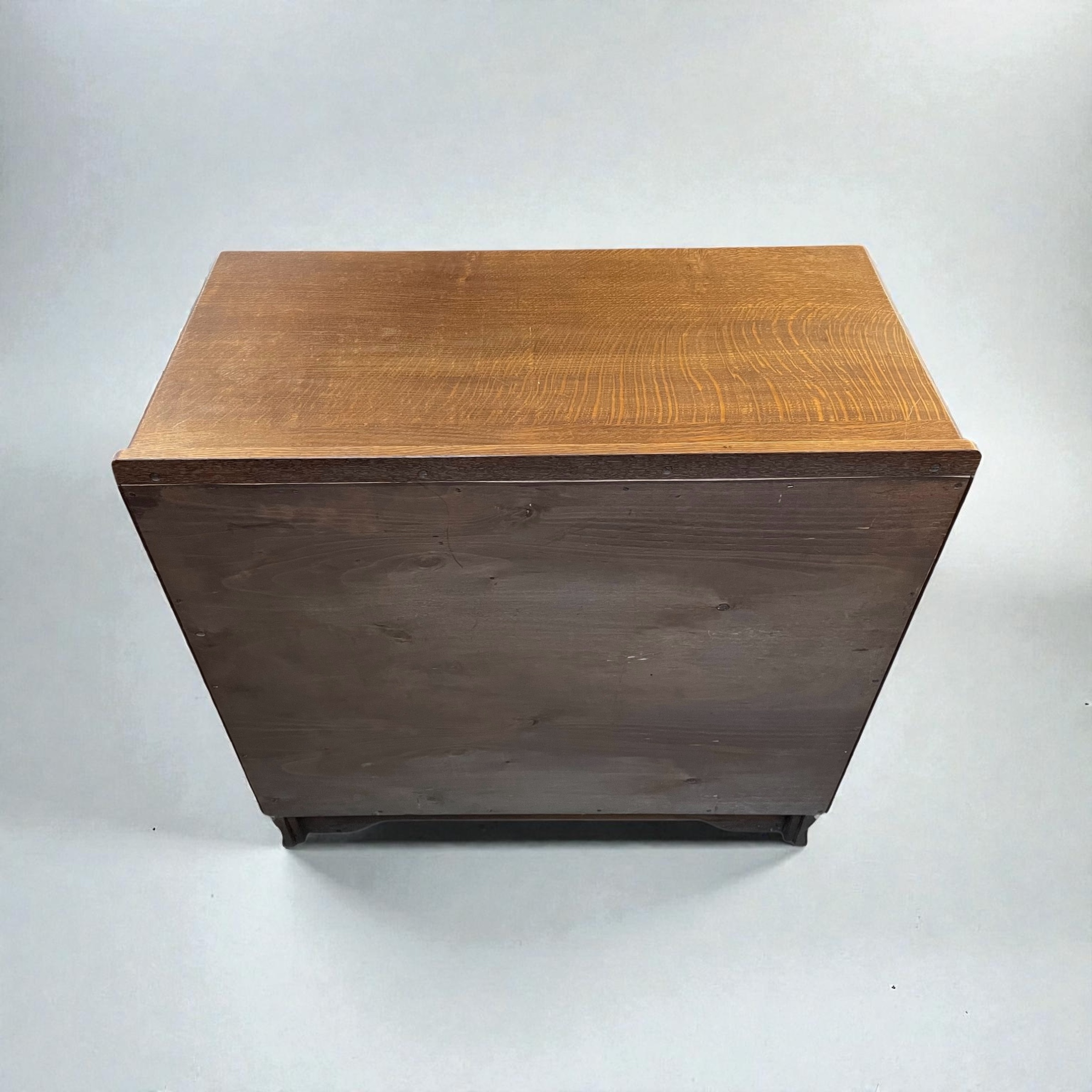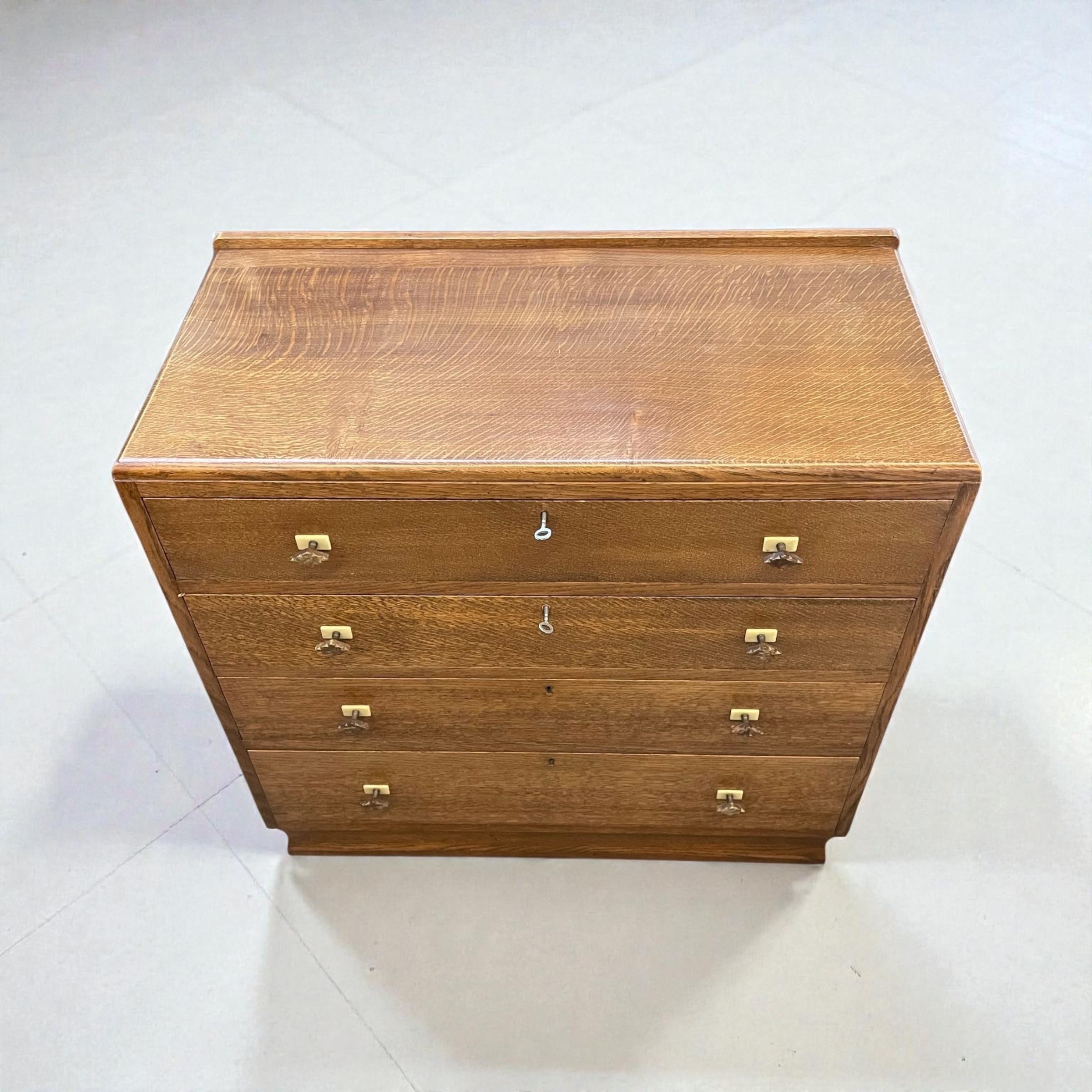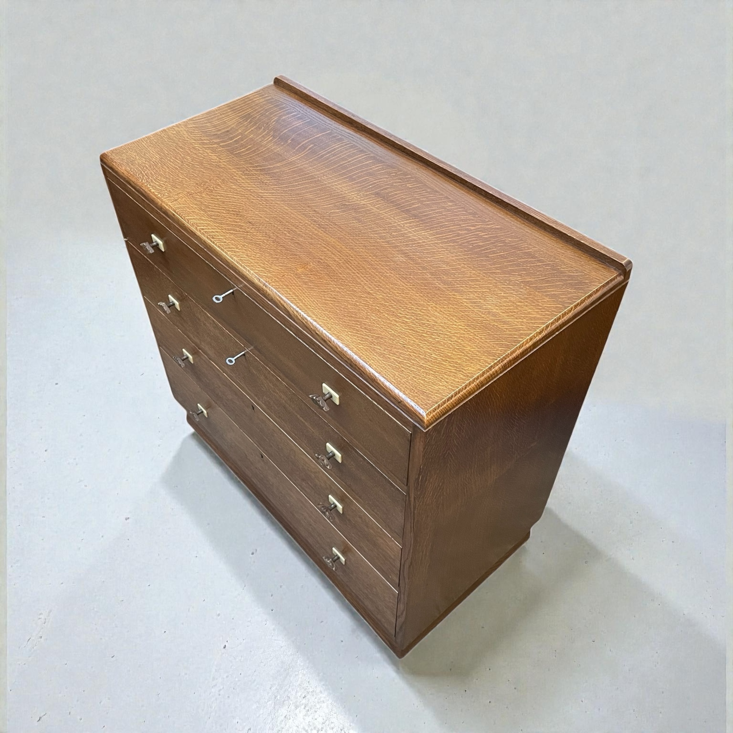 The cabinet in oak and each drawer with a pair of phenolic cream and brown diamond shape handles.