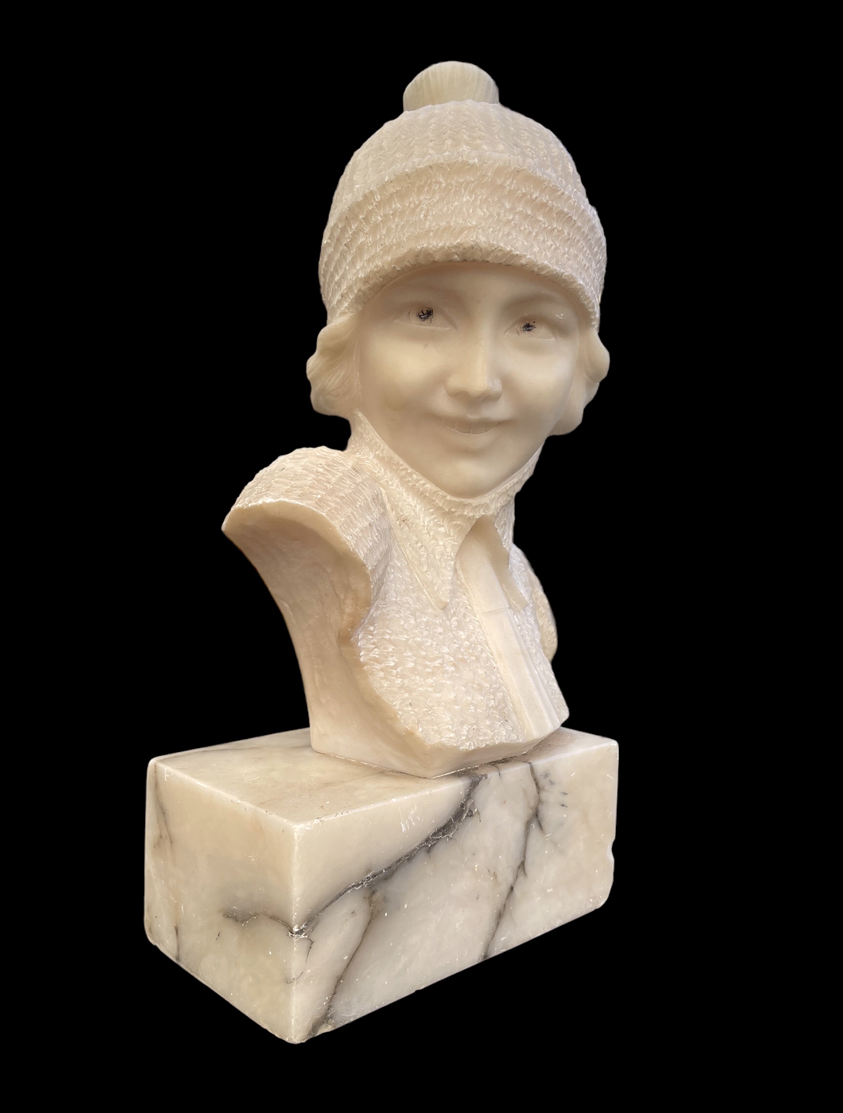 A beautifully executed alabaster sculpture of a girl during the 1930s. The woollen hat and knitted cardigan typical of this time. Signed to the reverse, ‘O. Guerrieri’. Mounted on a white and grey veined marble base. The bust without damage, the marble plinth with some nibbles to the right hand corner.