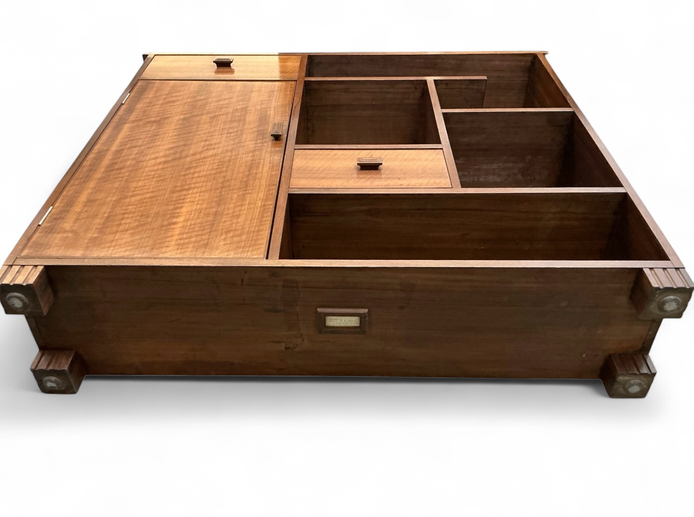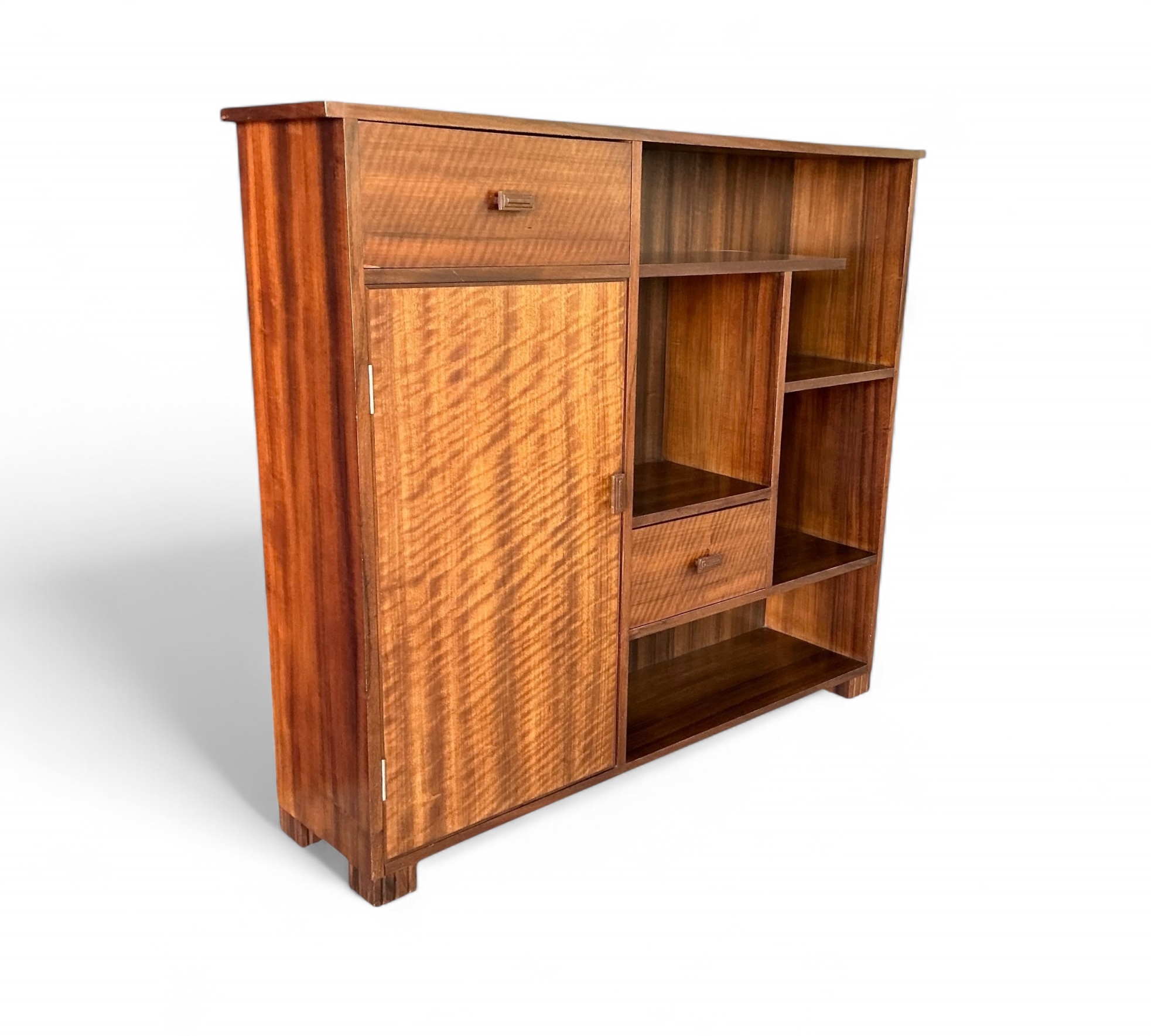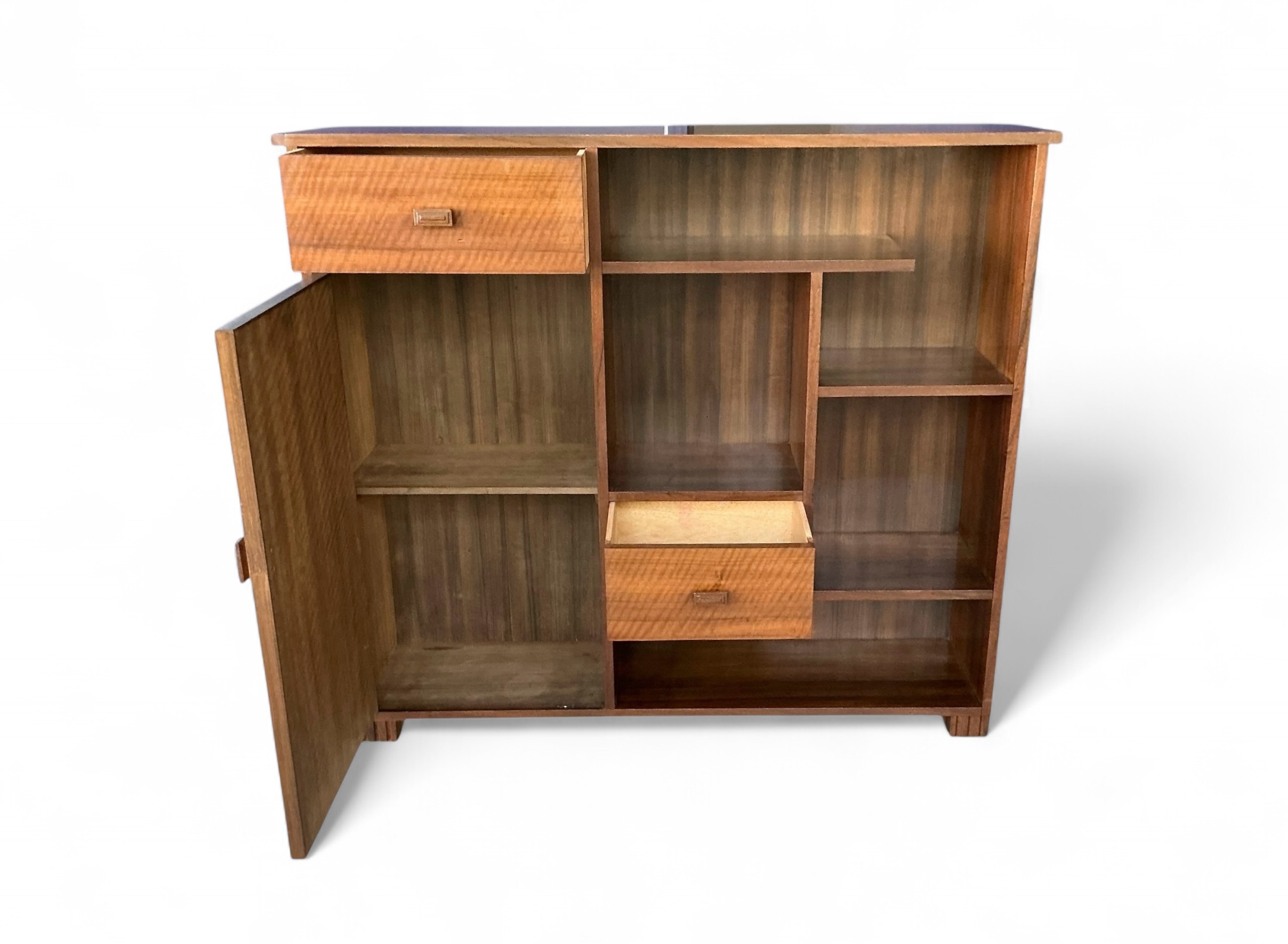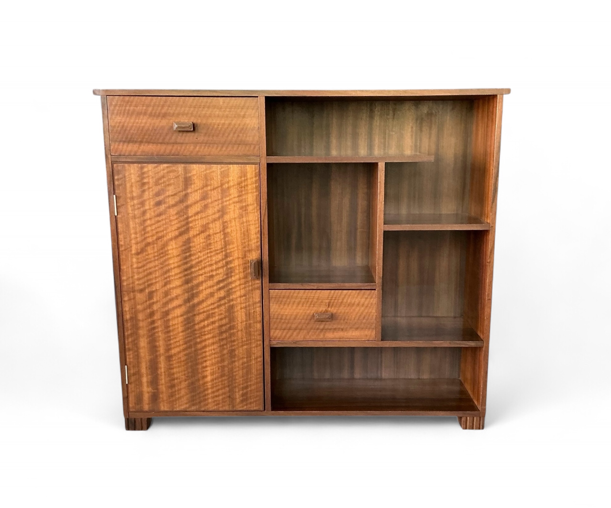 A Betty Joel, Australian Walnut, modernist bookcase/display cabinet with two drawers and an enclosed cupboard with stepped Walnut rectangular handles, with an assymetrical shelving arrangement, over reeded block feet. The drawers have the signature ball bearing closure catch to their bases, designed and manufactured by Betty Joel, paper label under glass on the base, signed by both the maker, G E Ashley and designer, Betty Joel at the Token Works Portsmouth, 1933.