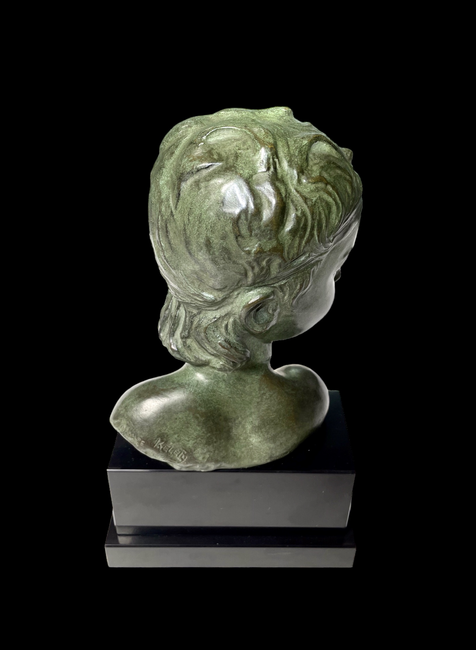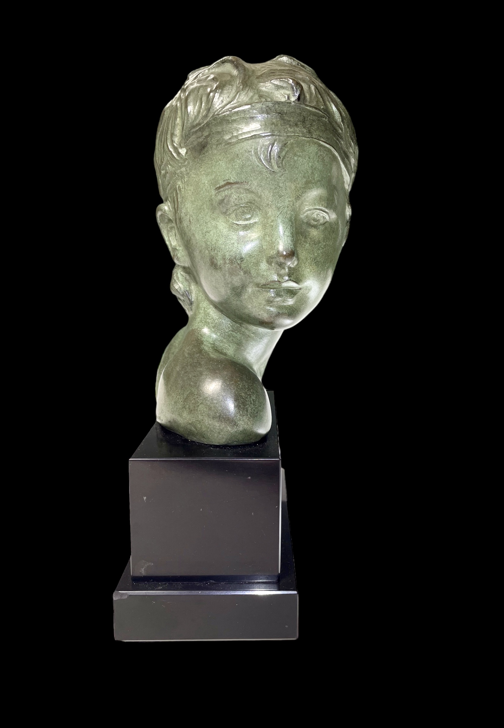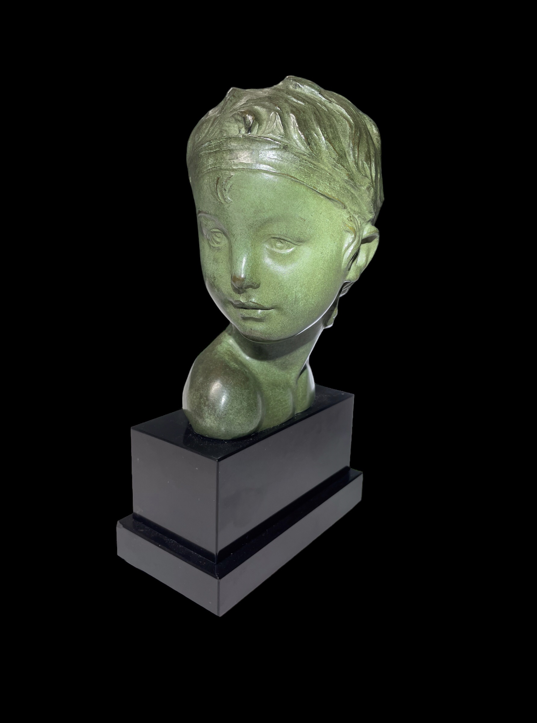 Bronze bust of a youth beautifully modelled by the sculptor Alexandre Kéléty (1918 – 42) and raised on a black stepped rectangular plinth. The bronze marked ‘Bronze’ and ‘ Kélety’.