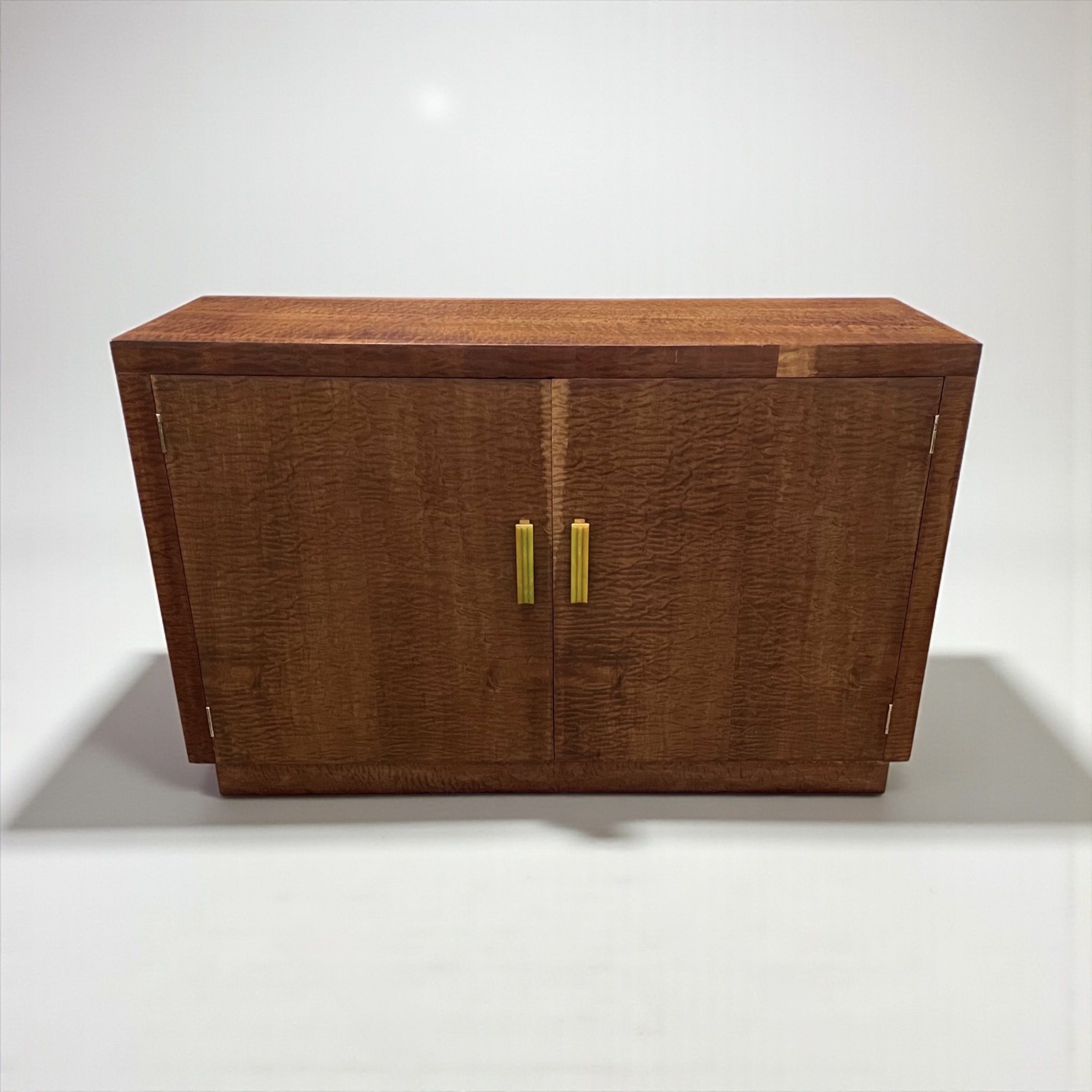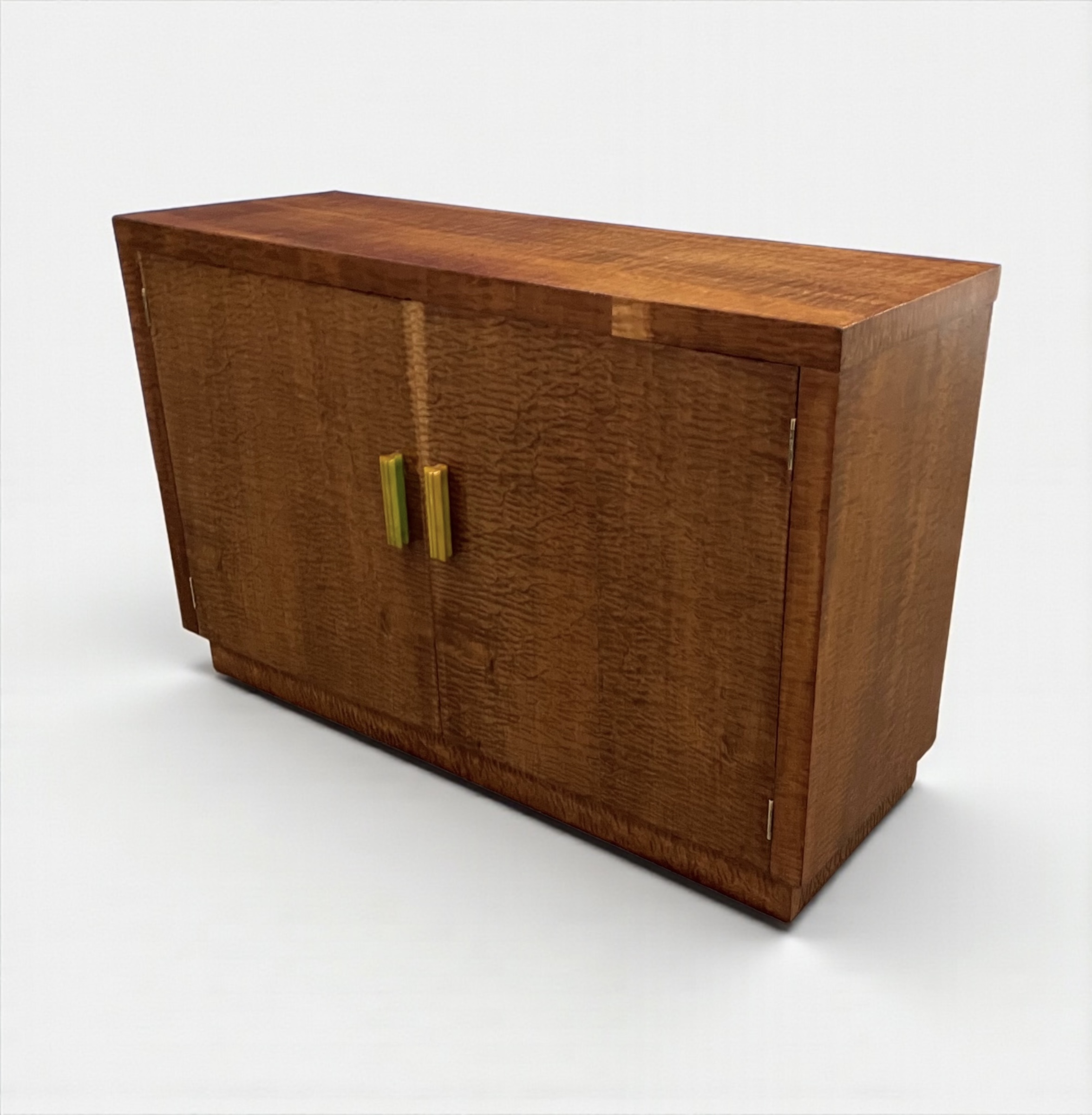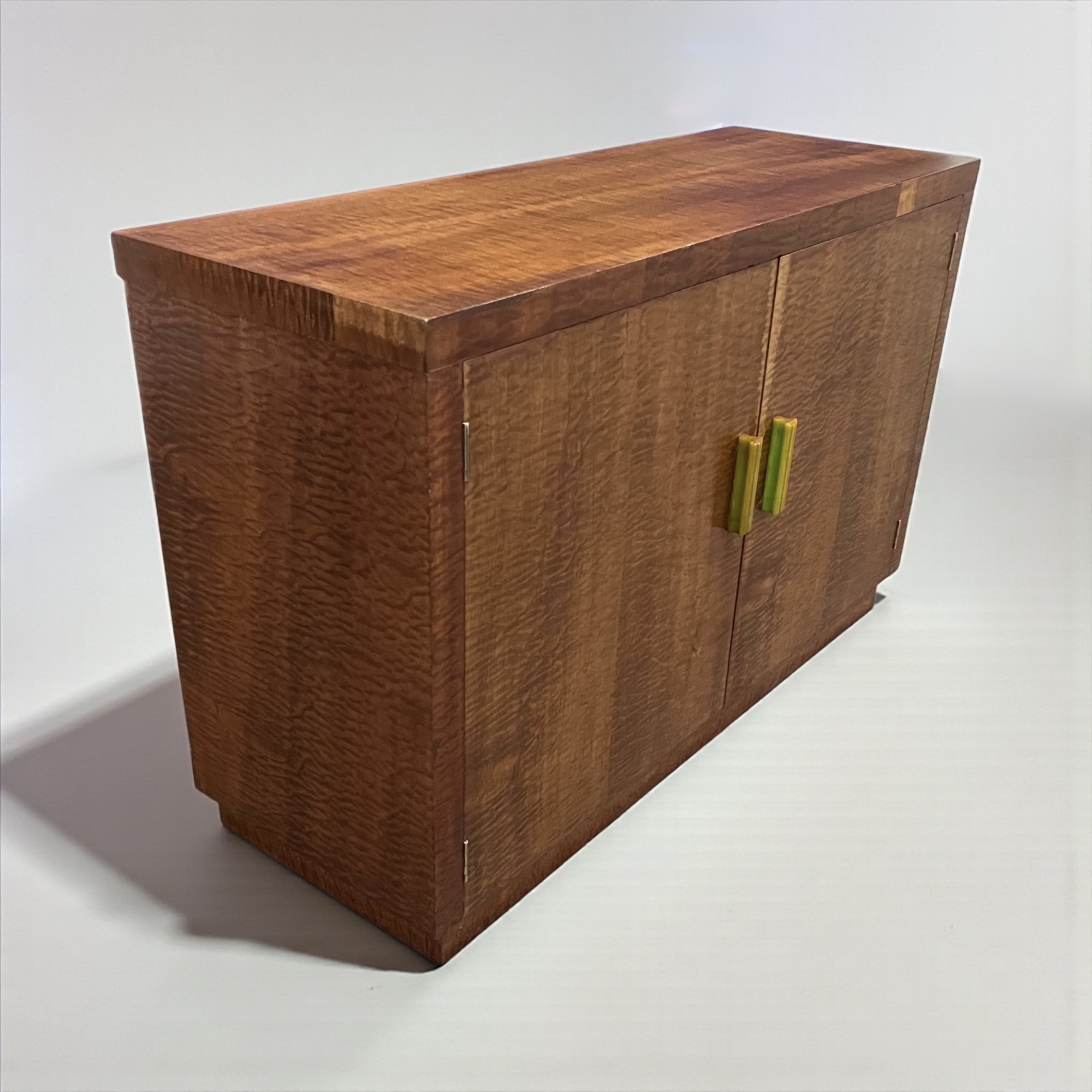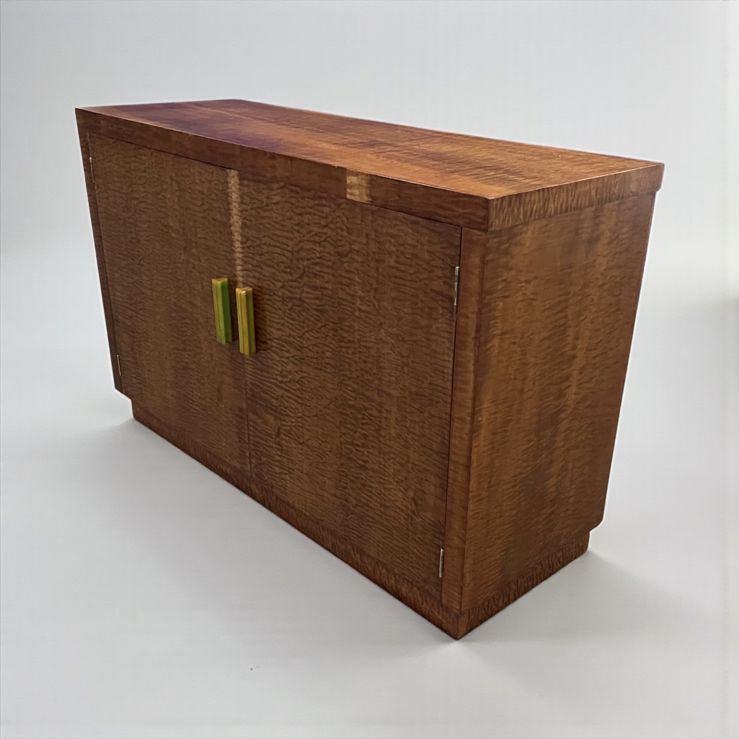 Art Deco Cabinet in quilted maple, with two doors and attractive green phenolic handles. The cabinet with two shelves.