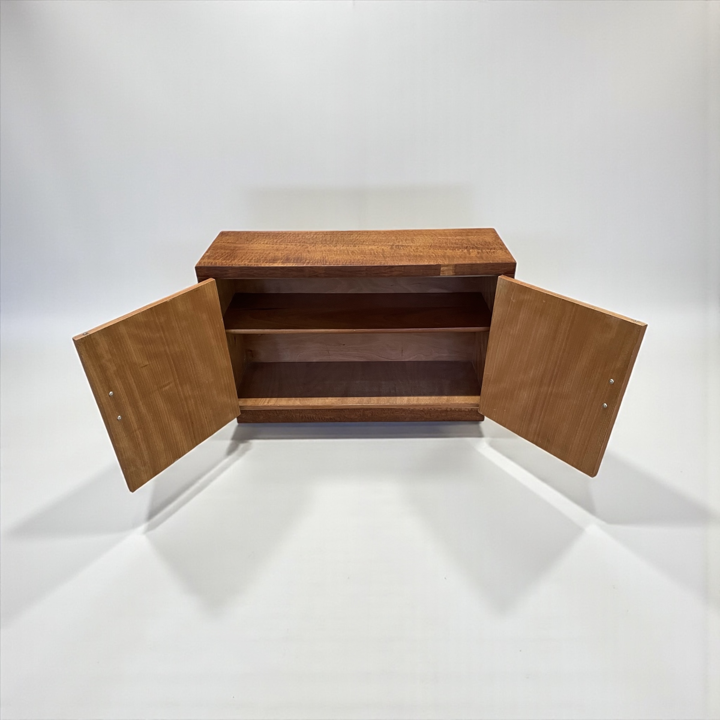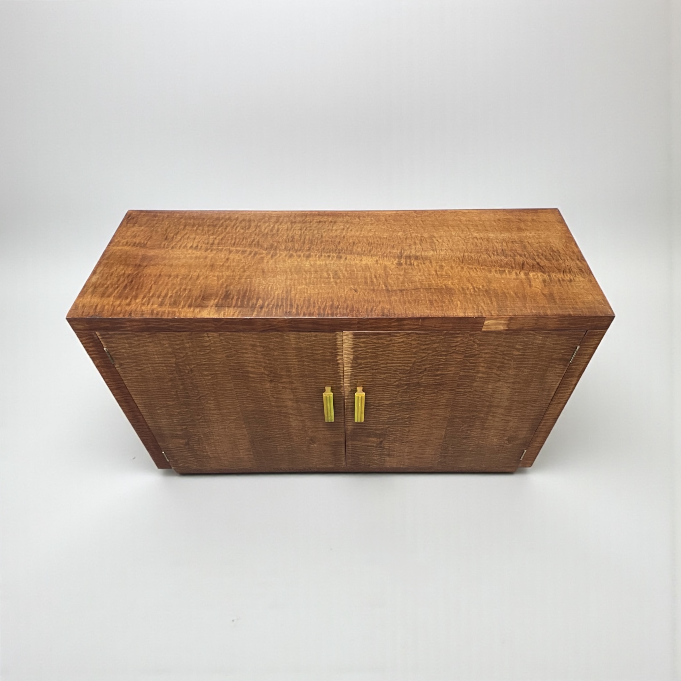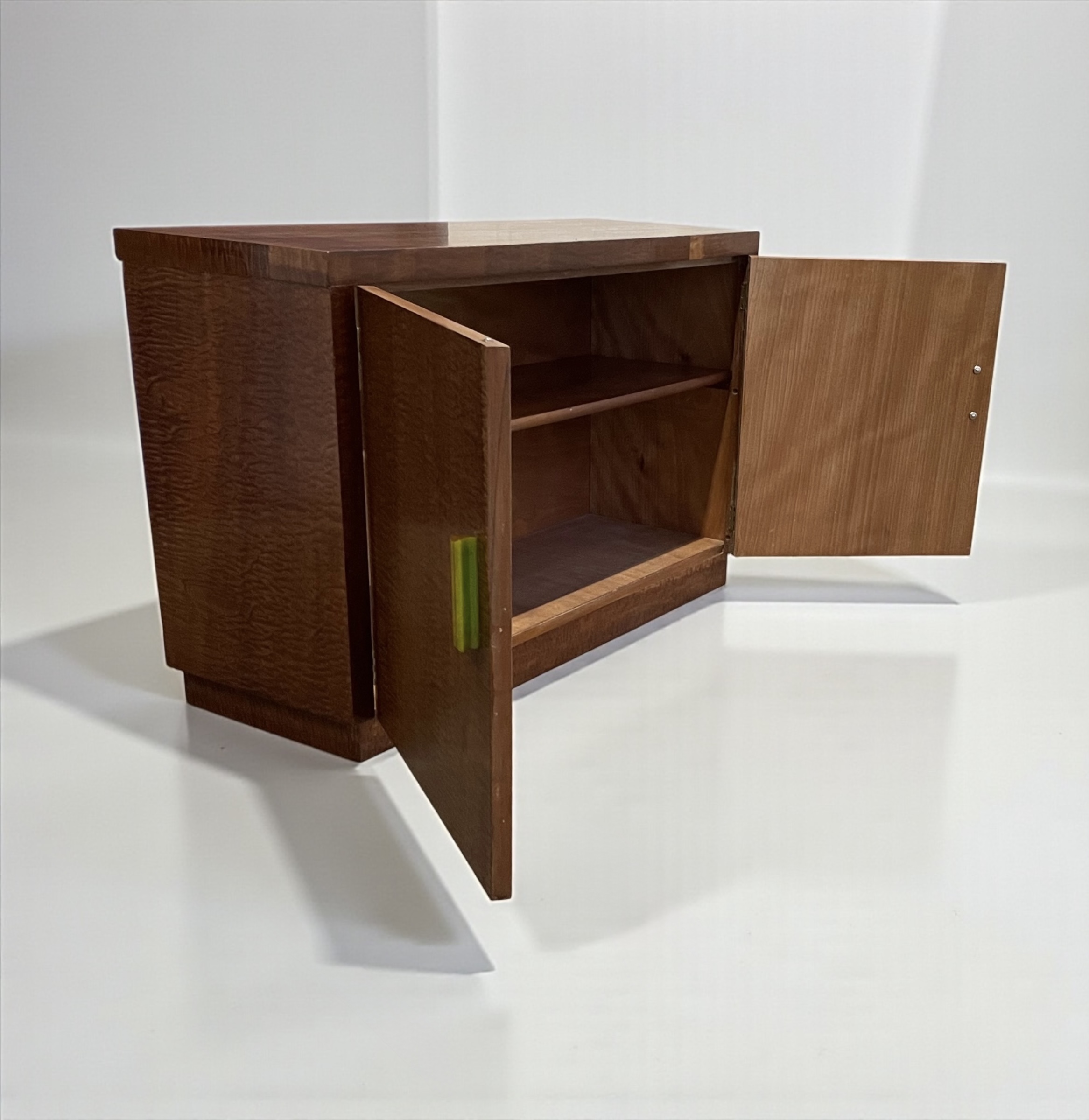 Art Deco Cabinet in quilted maple, with two doors and attractive green phenolic handles. The cabinet with two shelves.