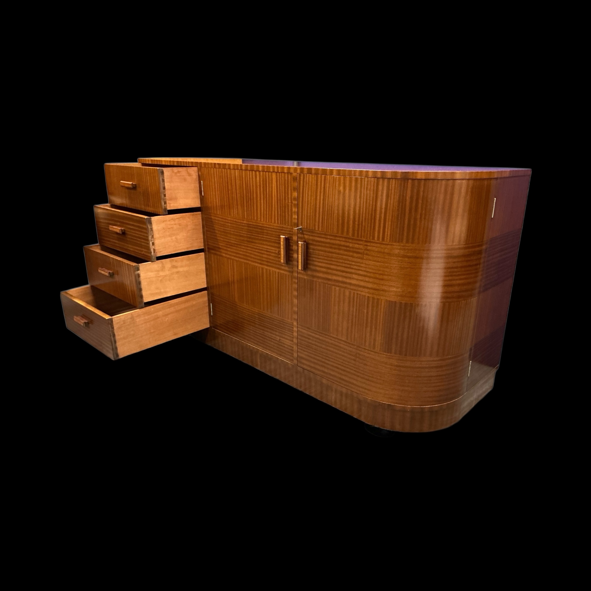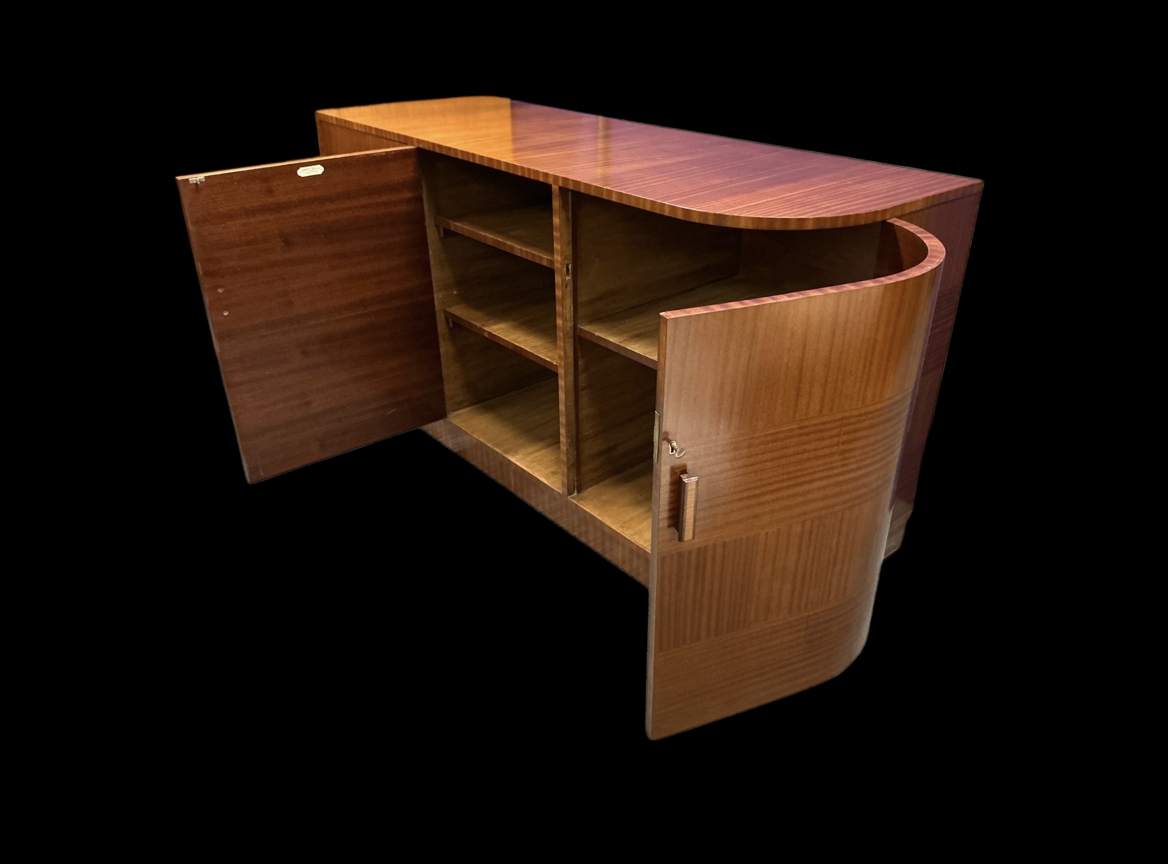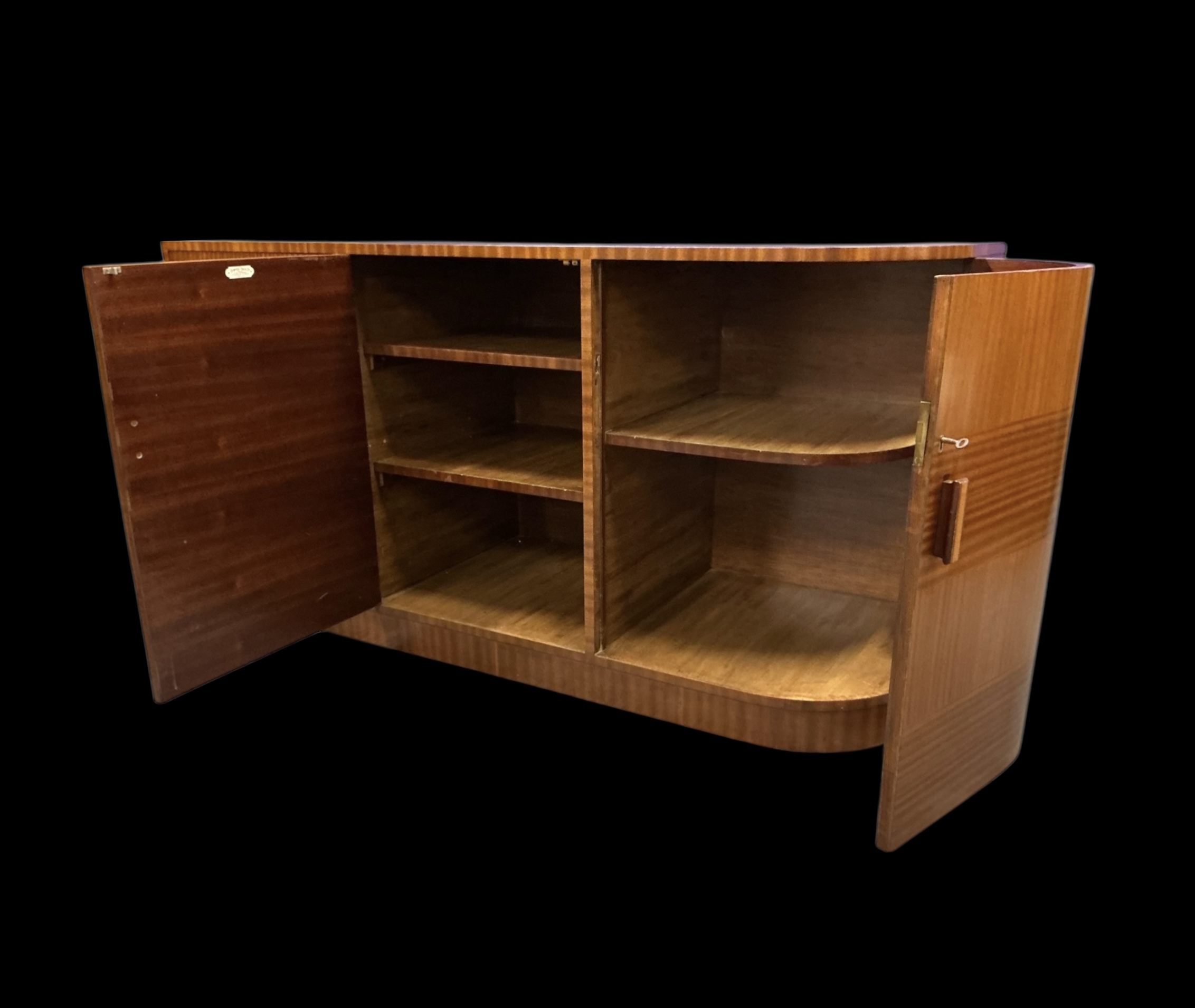 Art Deco Cabinet by the Bowman Brothers who retailed in Camden Town. Three drawers to the left, a three shelf cupboard to the centre, with the makers ivorine label to the door. A curved cupboard to the right with two shelves. The curved cupboard with its working lock and key.