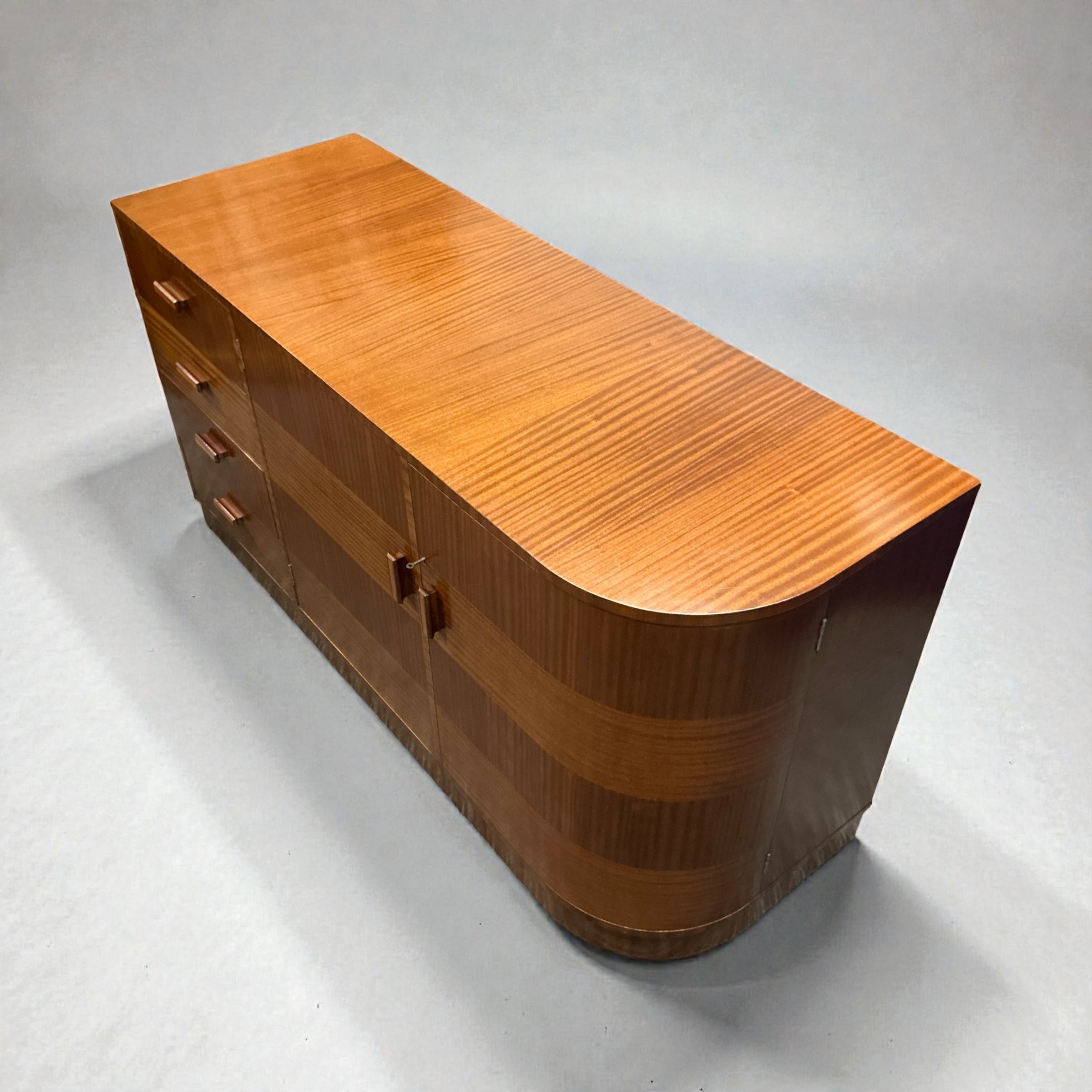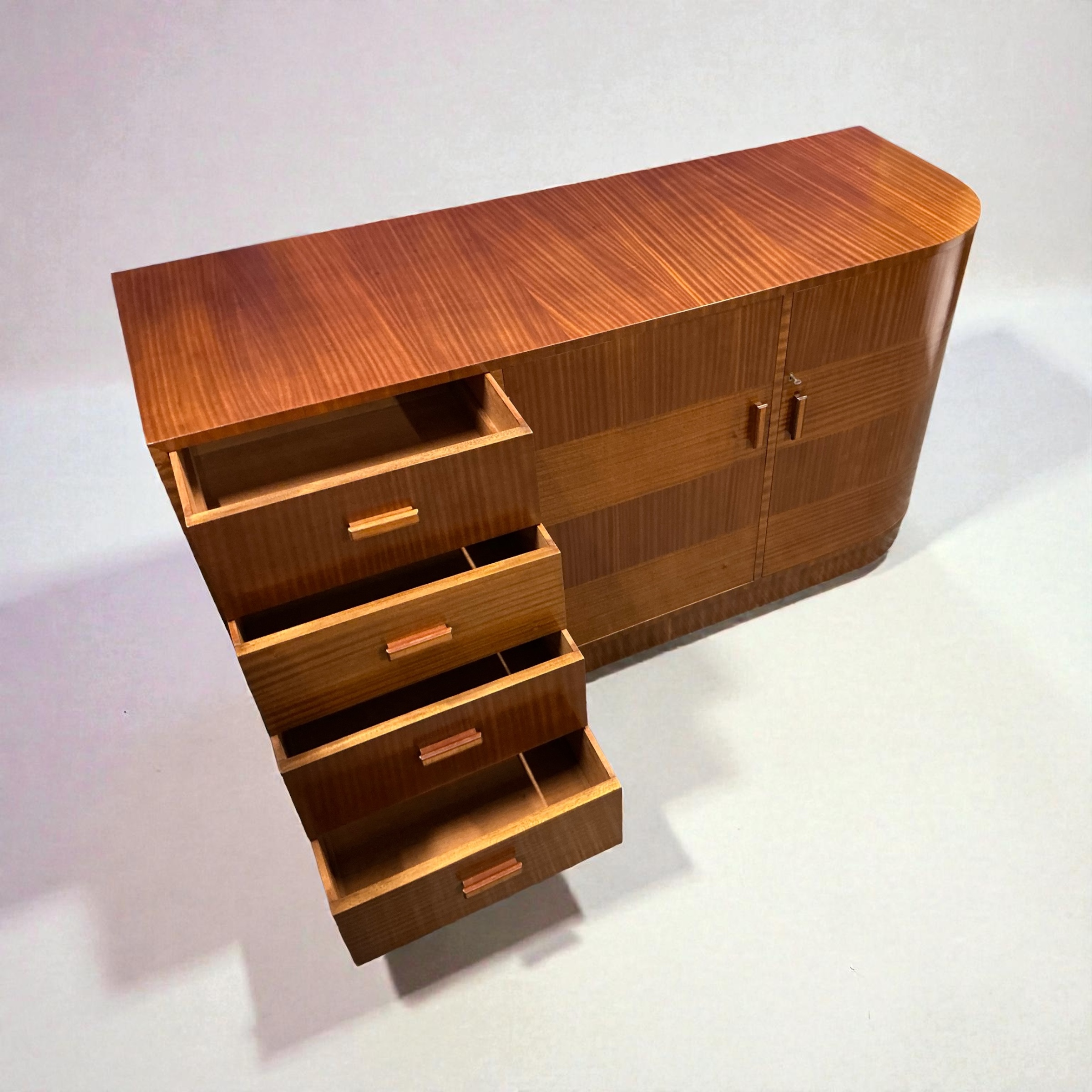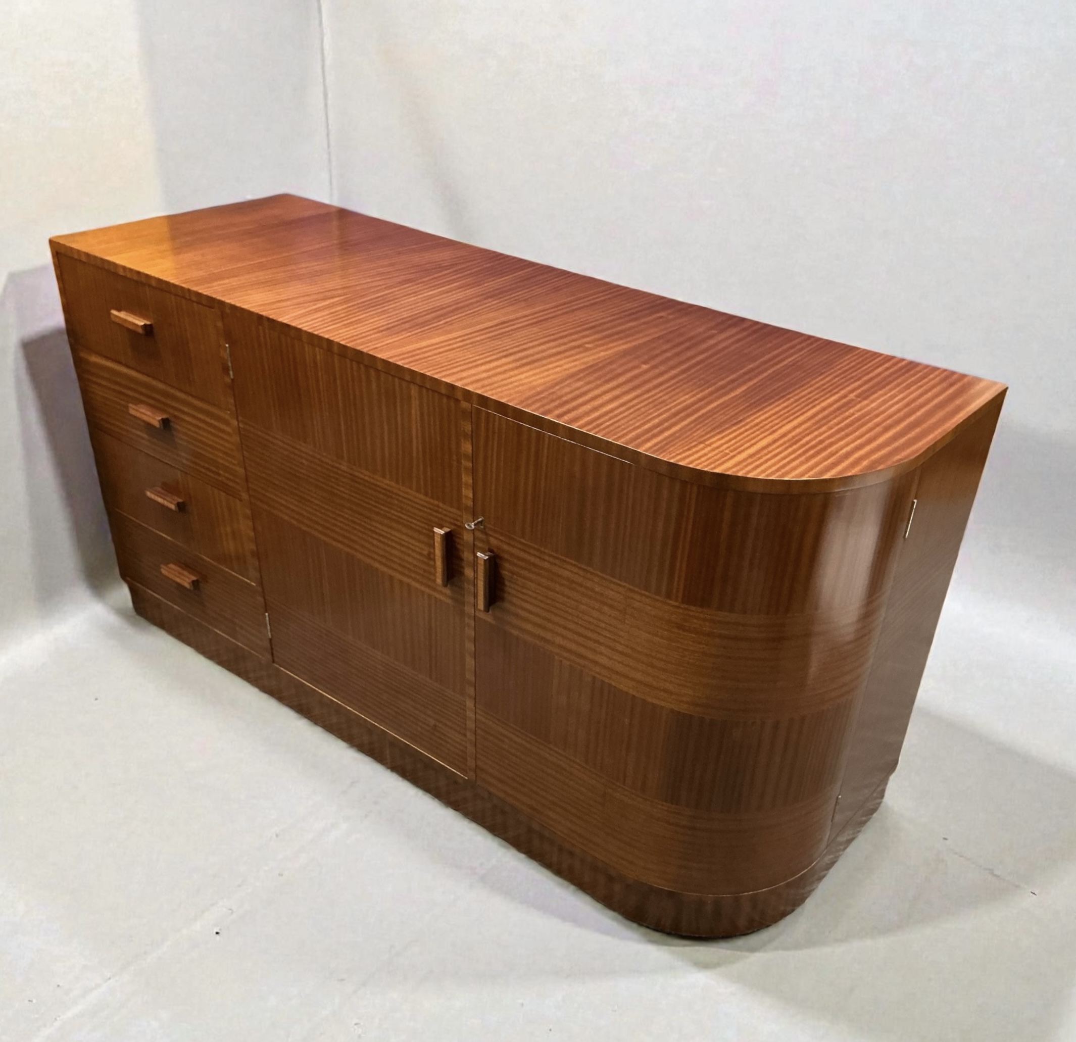 Art Deco Cabinet by the Bowman Brothers who retailed in Camden Town. Three drawers to the left, a three shelf cupboard to the centre, with the makers ivorine label to the door. A curved cupboard to the right with two shelves. The curved cupboard with its working lock and key.