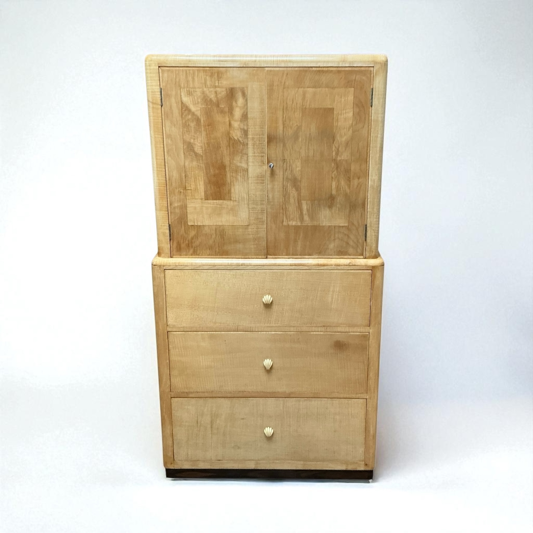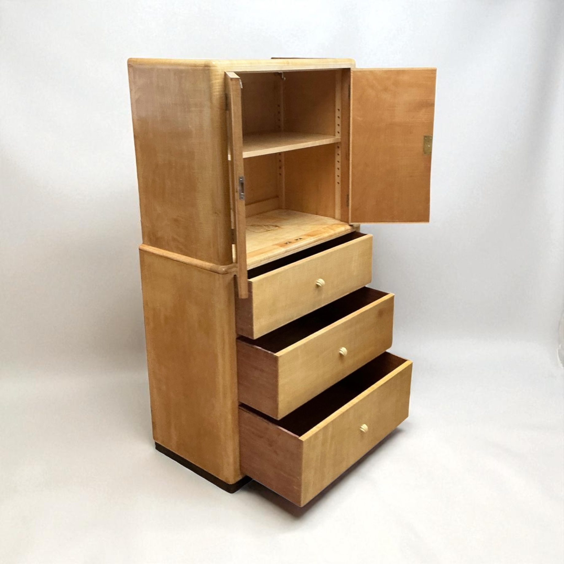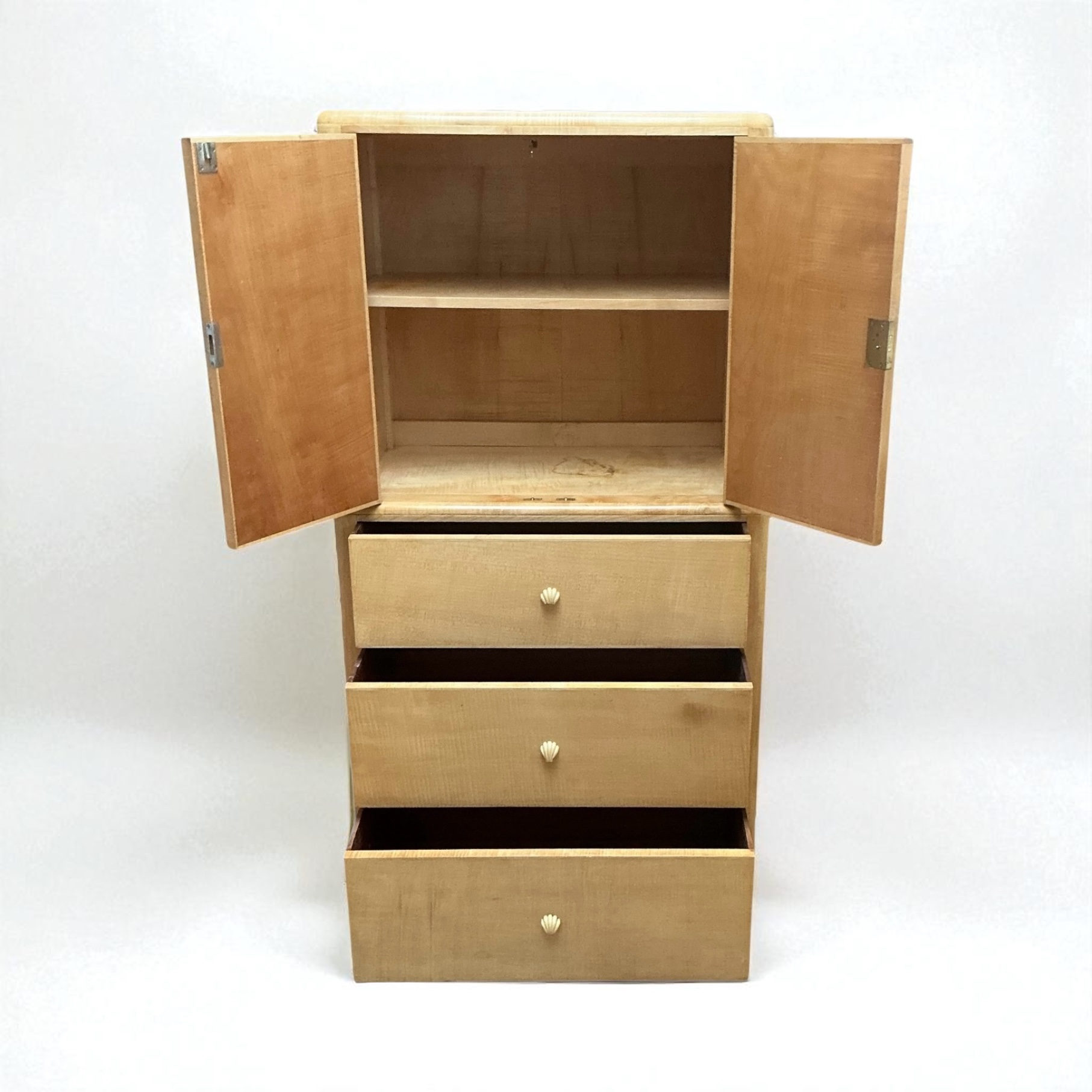 Art Deco cabinet on chest by Betty Joel in maple. The cabinet with two shelves and three drawers below. With the ivorine shell handles and ball bearings to each drawer, are features associated with Betty Joel’s work. The Betty Joel signed label, dated 1936 found to the back.