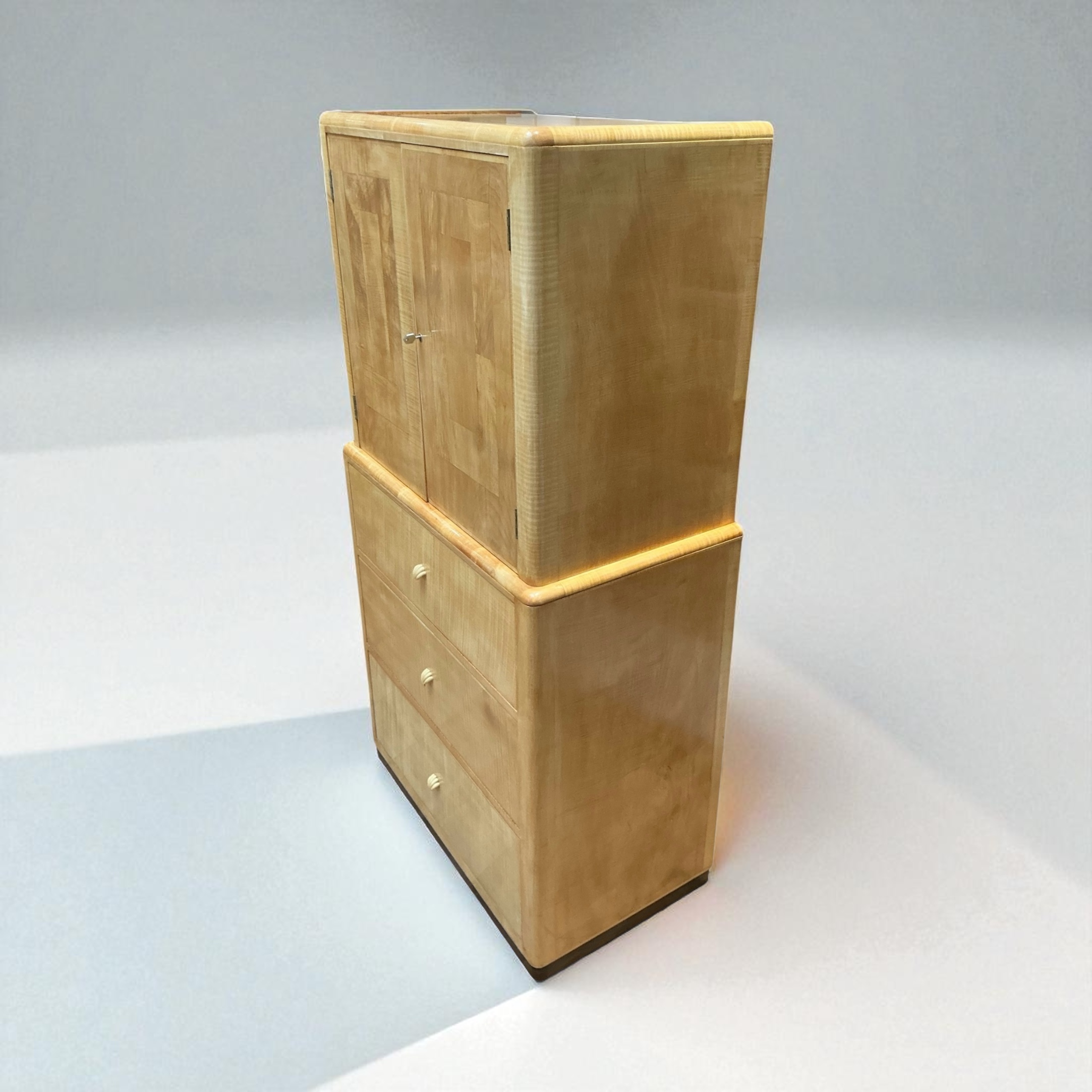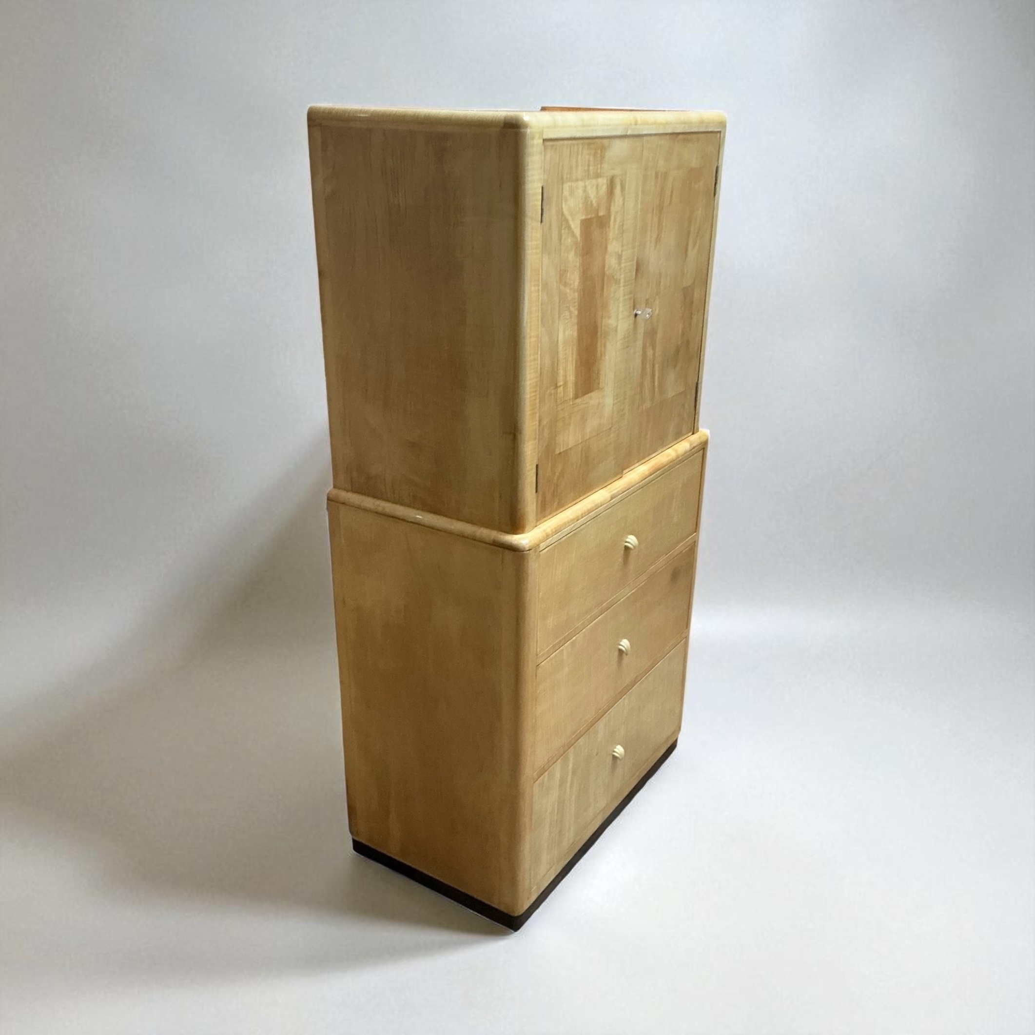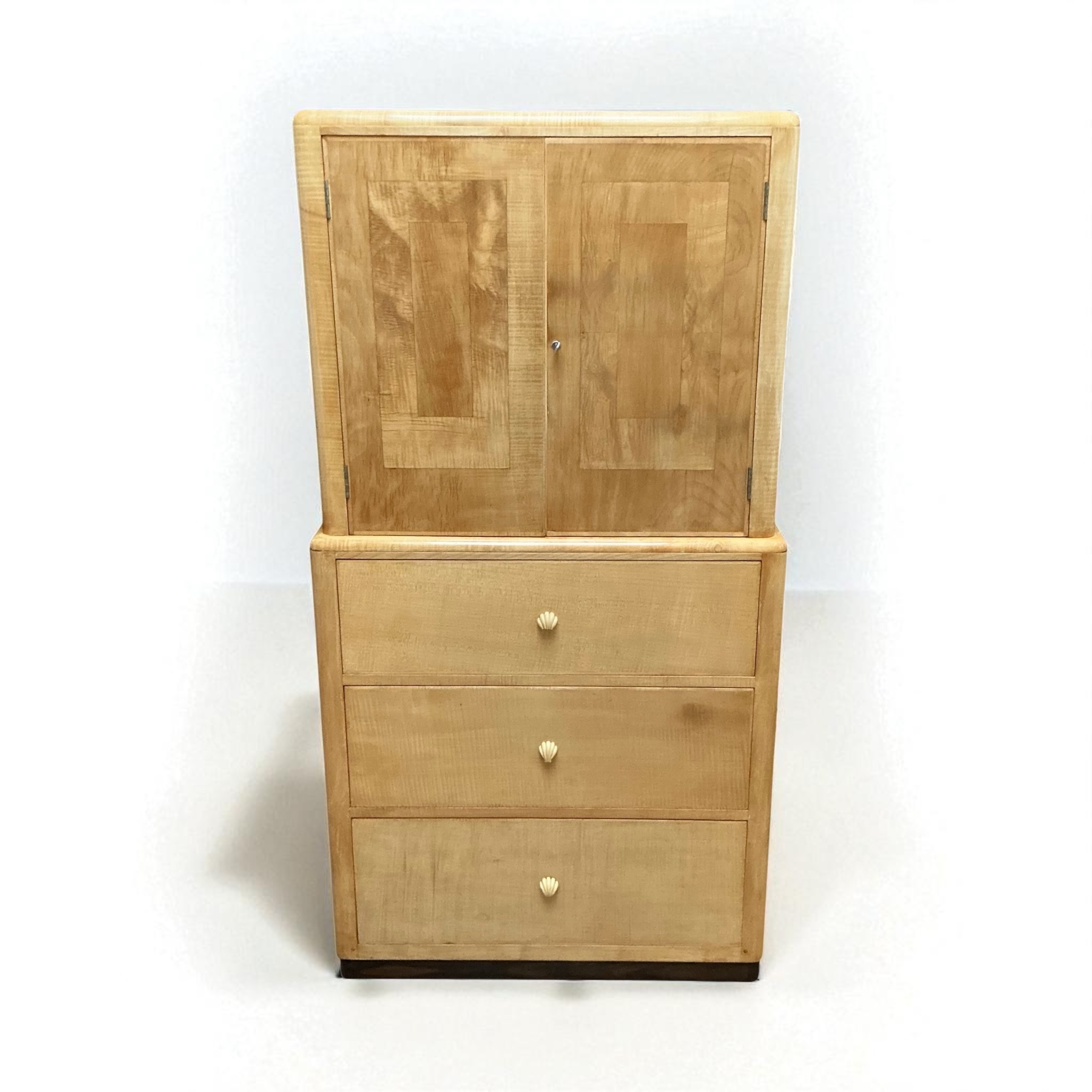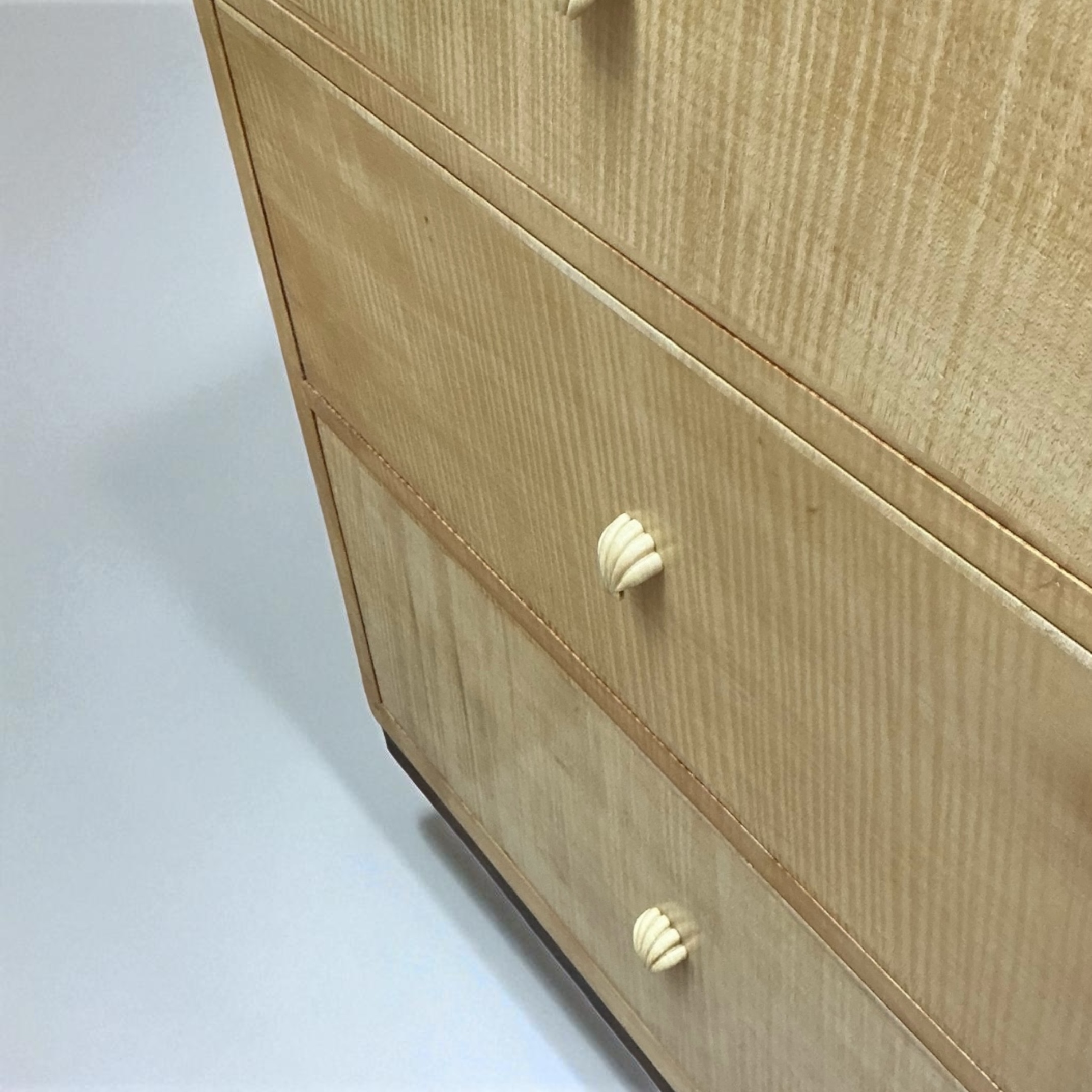 Art Deco cabinet on chest by Betty Joel in maple. The cabinet with two shelves and three drawers below. With the ivorine shell handles and ball bearings to each drawer, are features associated with Betty Joel’s work. The Betty Joel signed label, dated 1936 found to the back.