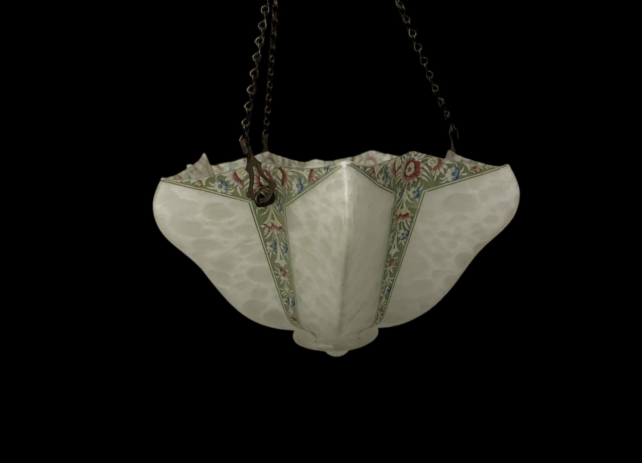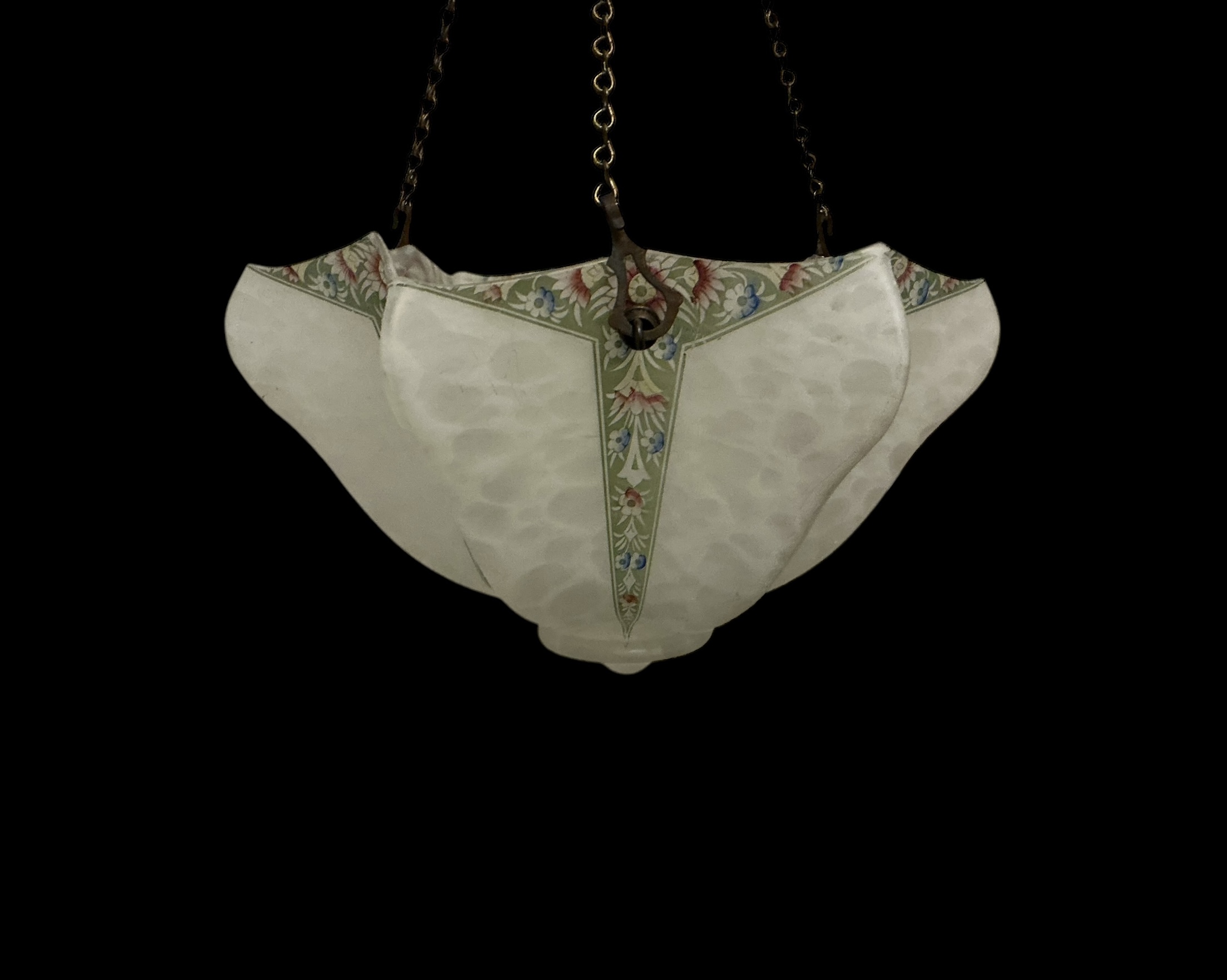 A very attractive and unusual shaped ceiling light, in white mottled glass with floral decoration in green, pink and blue. With its original brass fittings and hanging chains. This French ceiling light would sit well in both an Arts and Crafts and Art Deco interior.