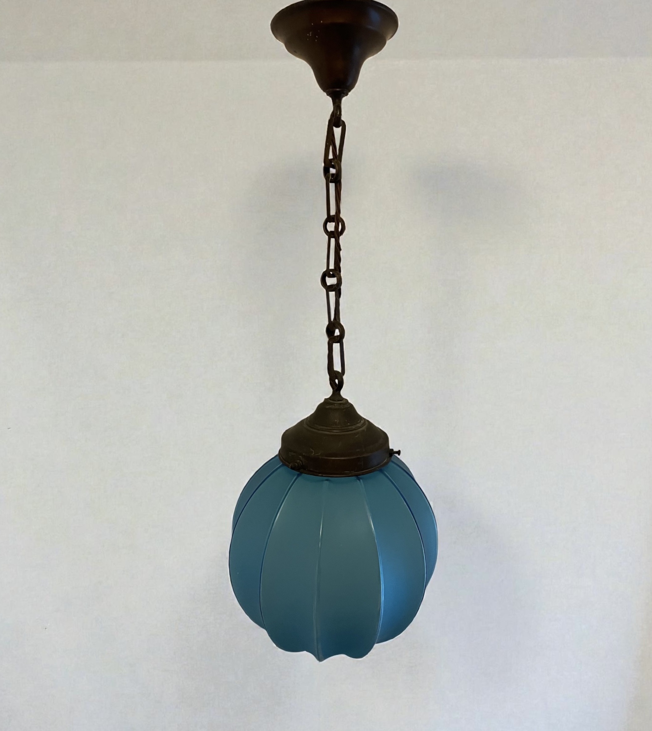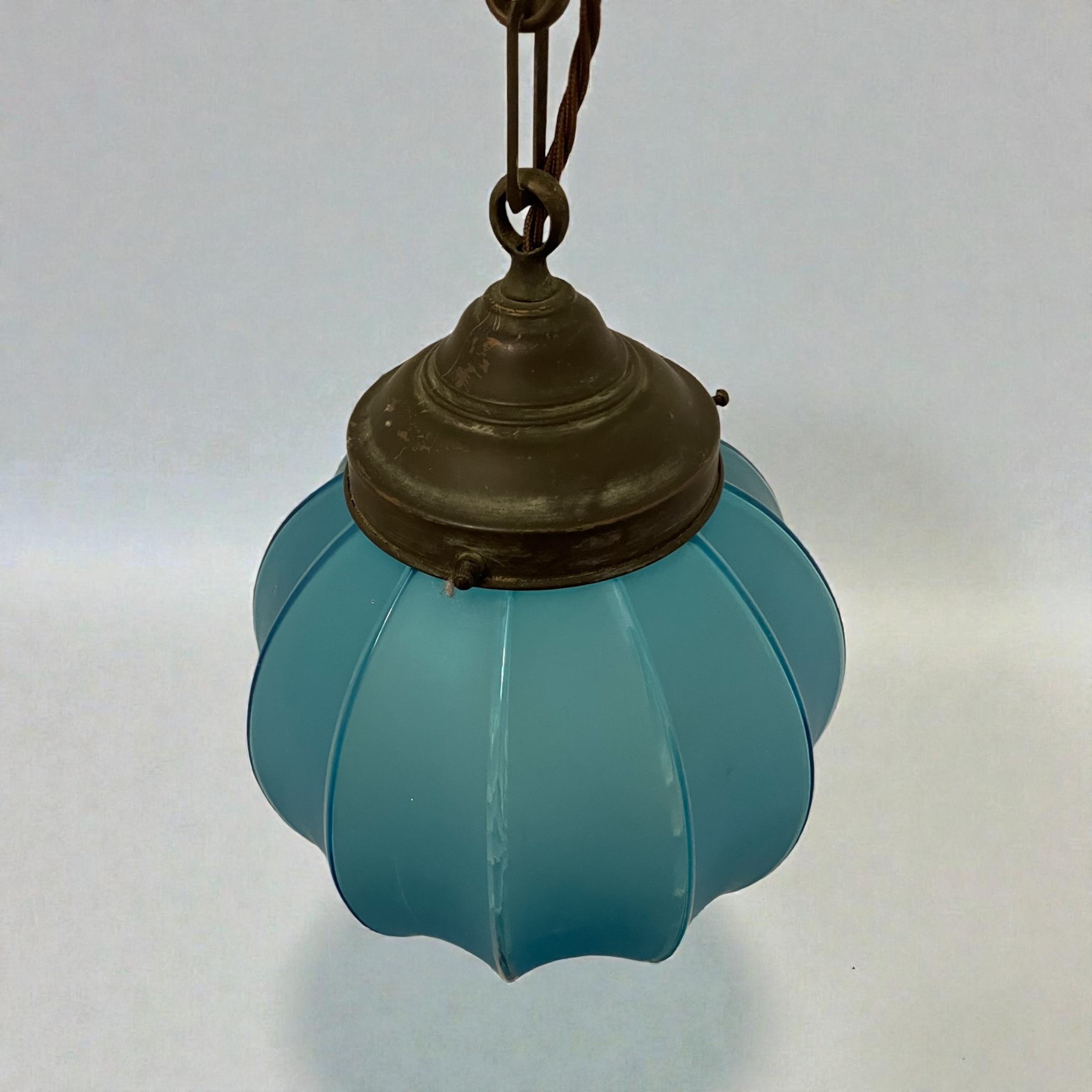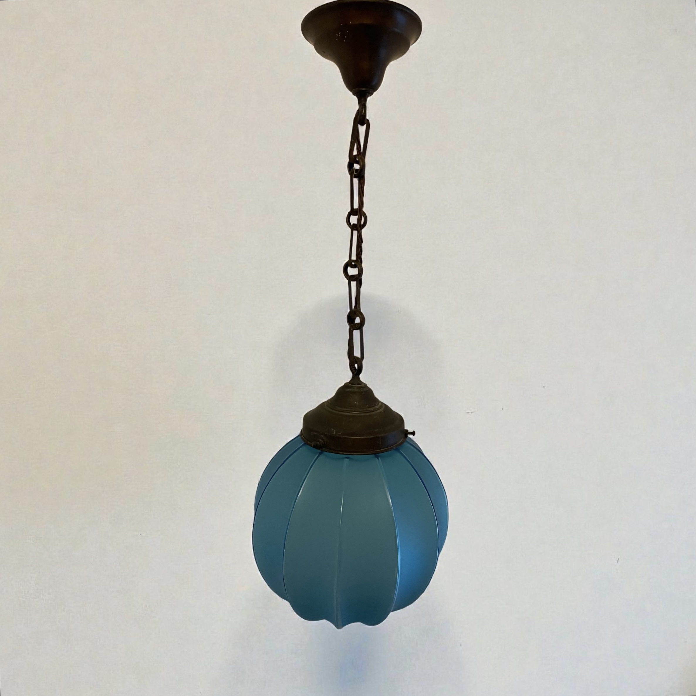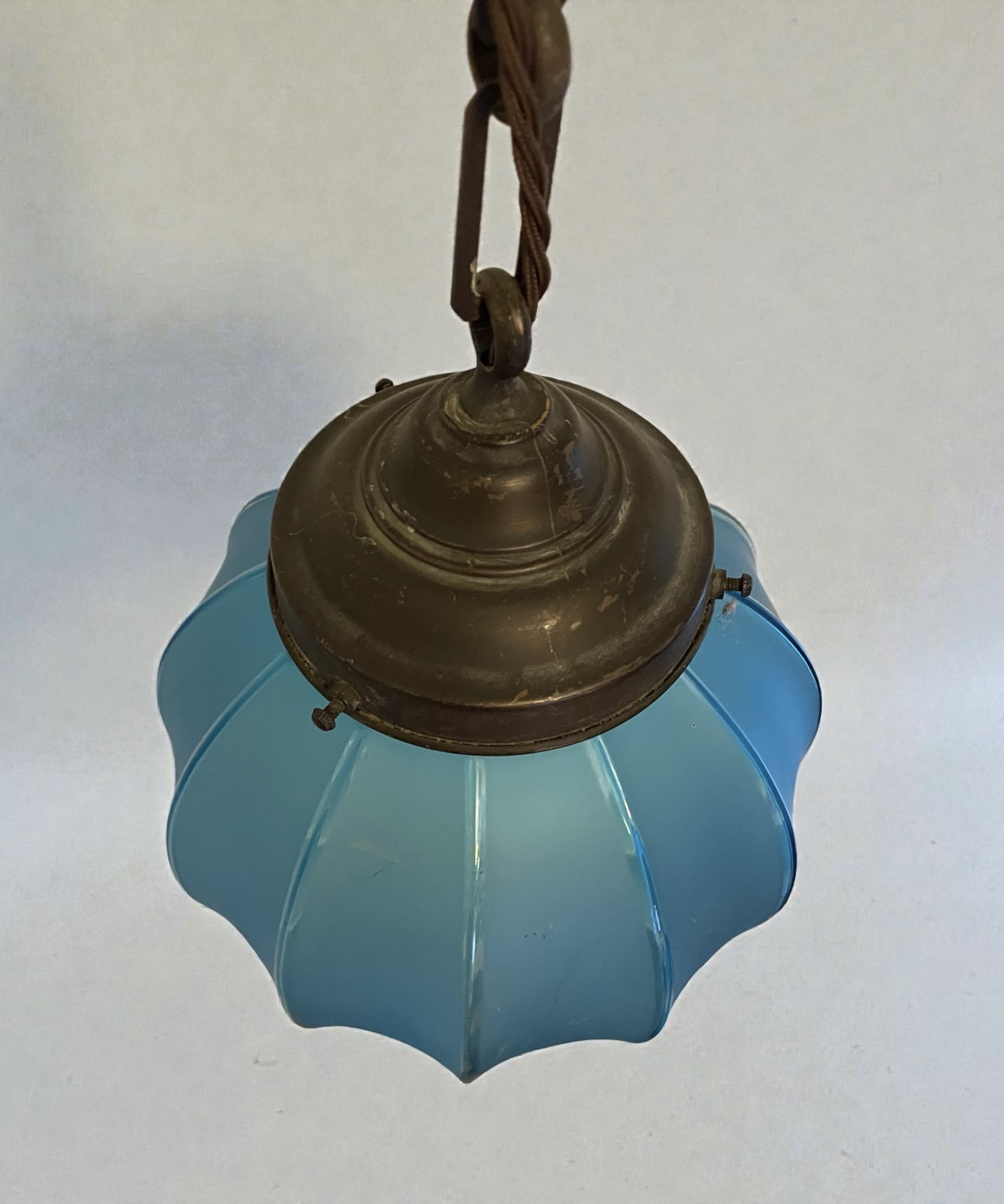 £245.00 Art Deco ceiling light, with a blue glass fluted shade, with a metal, bronze effect gallery, ceiling rose and rectangular and circular link chain. Just rewired and PAT tested. Dimensions Hanging drop: 55cm Shade diameter: 18cm Screenshot Categories: All Stock, Lighting