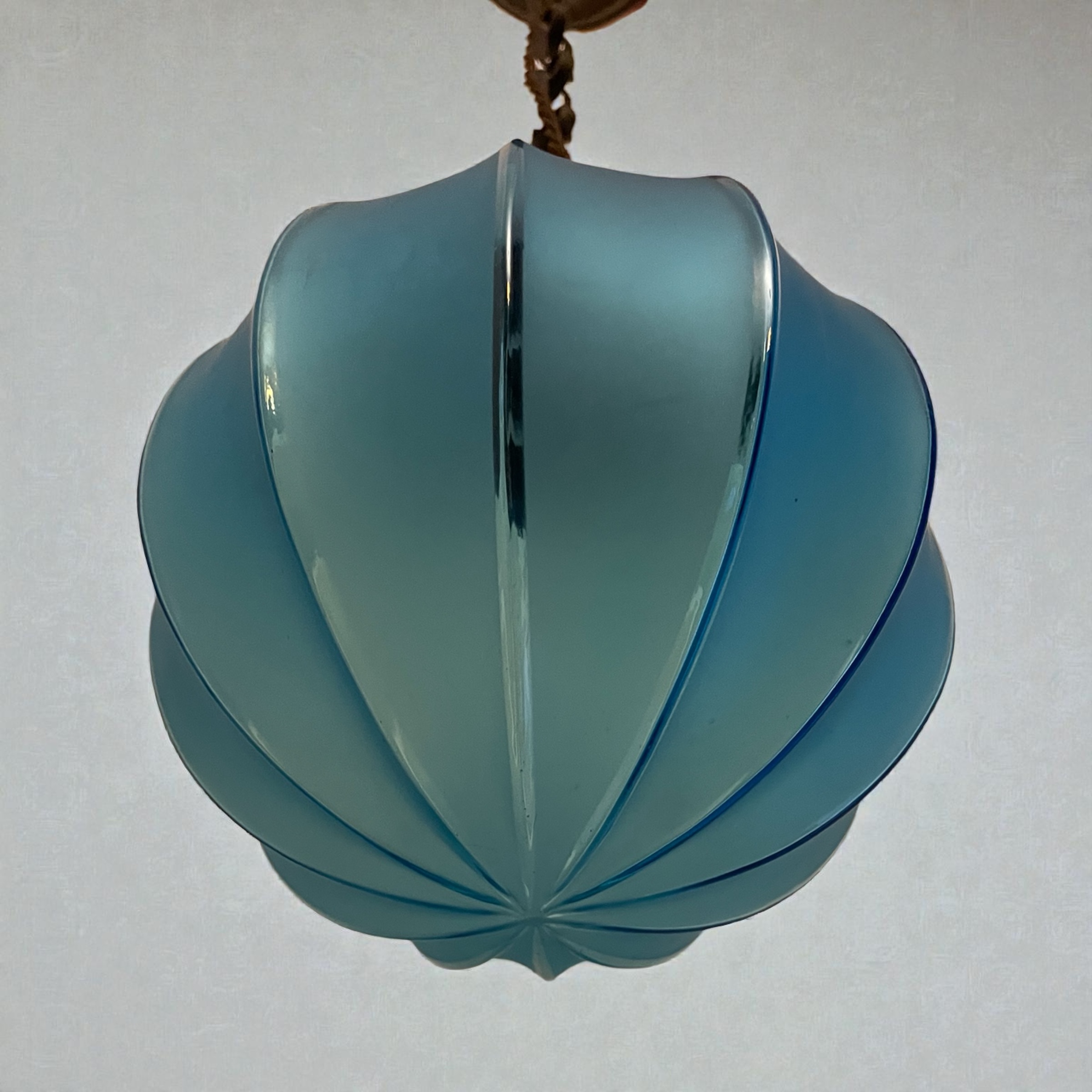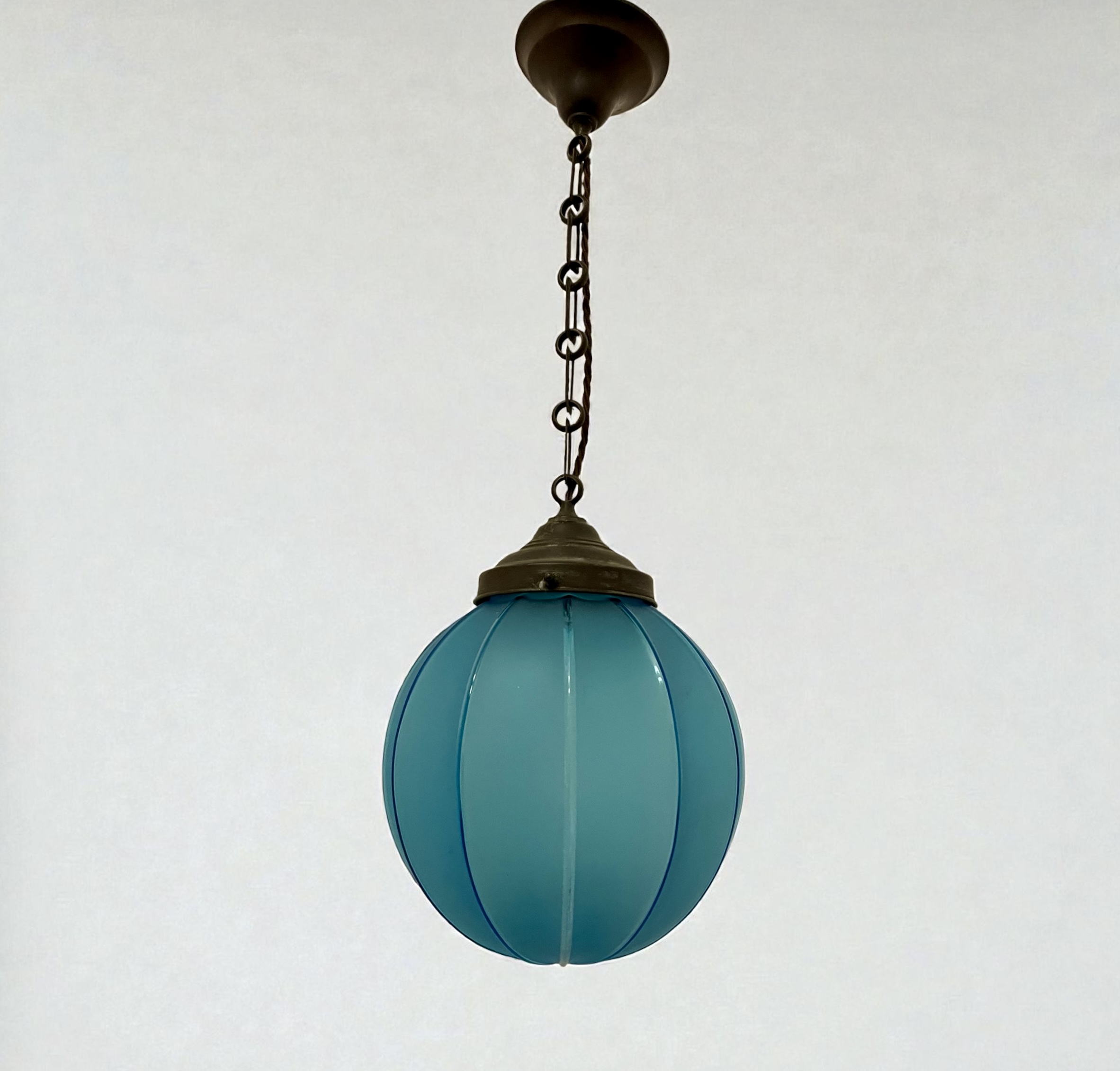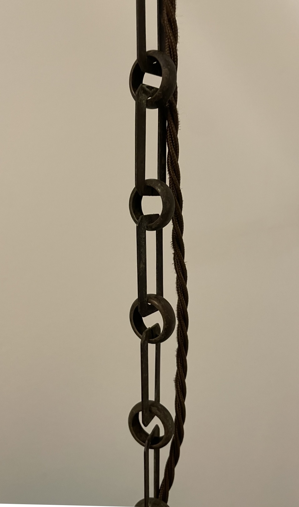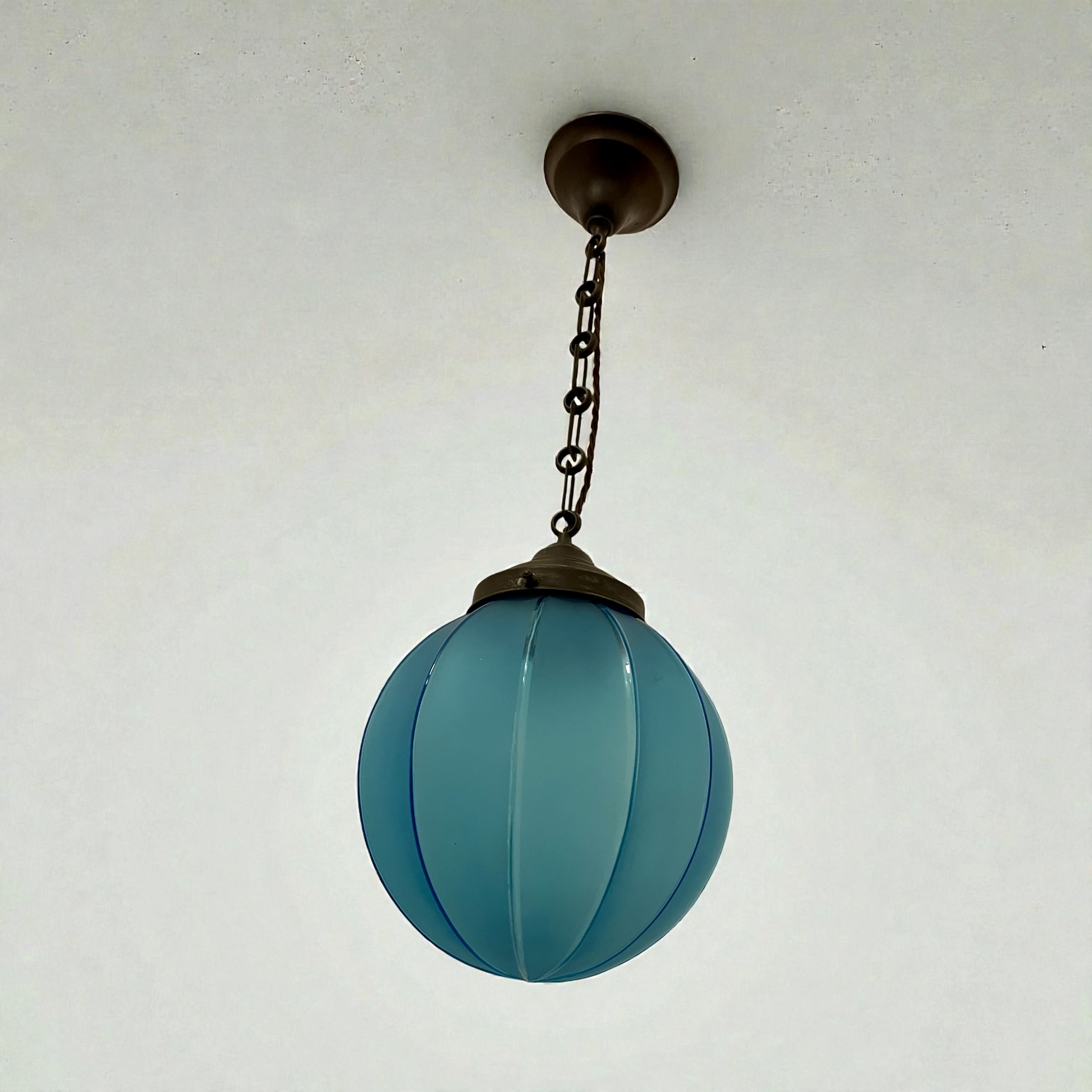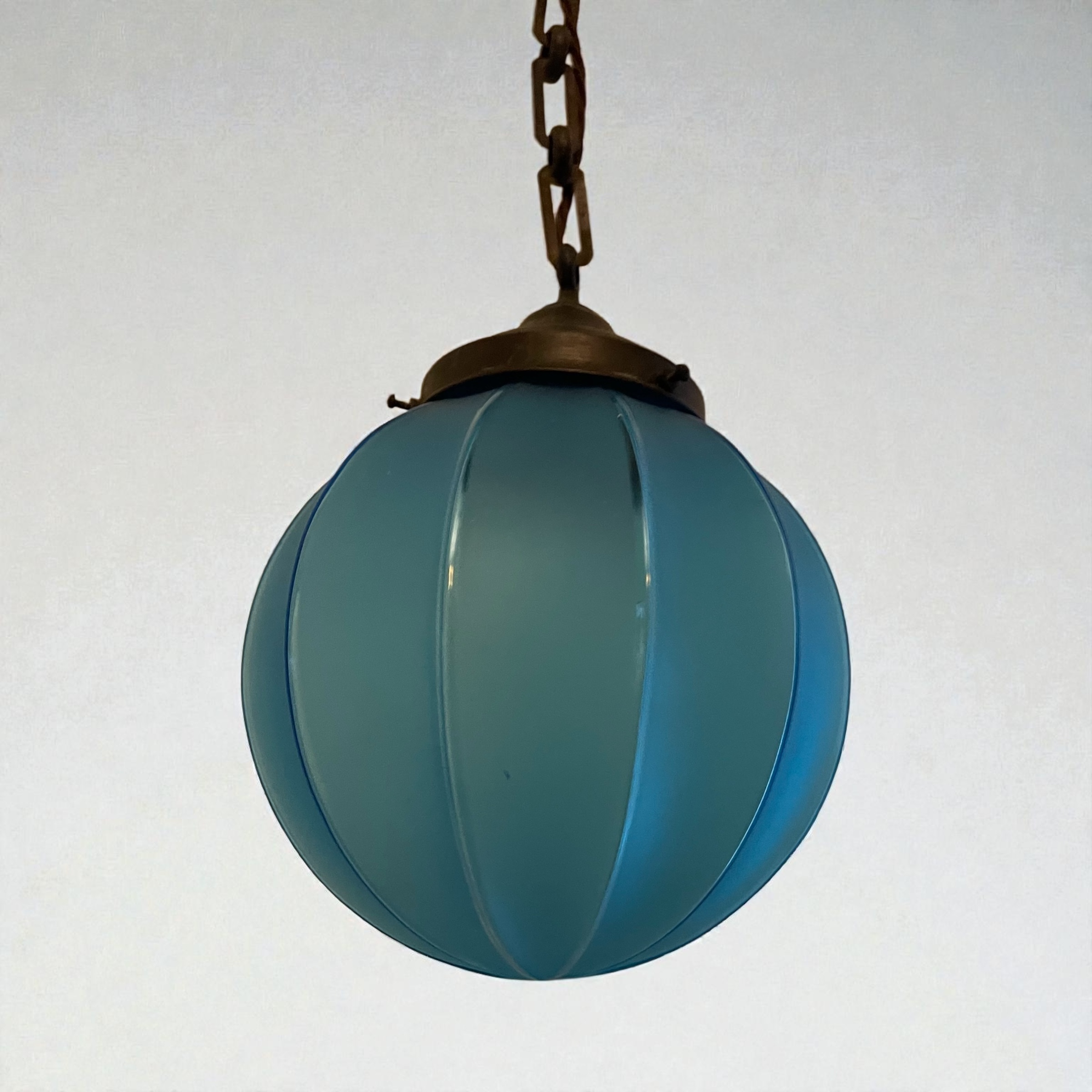 £245.00 Art Deco ceiling light, with a blue glass fluted shade, with a metal, bronze effect gallery, ceiling rose and rectangular and circular link chain. Just rewired and PAT tested. Dimensions Hanging drop: 55cm Shade diameter: 18cm Screenshot Categories: All Stock, Lighting