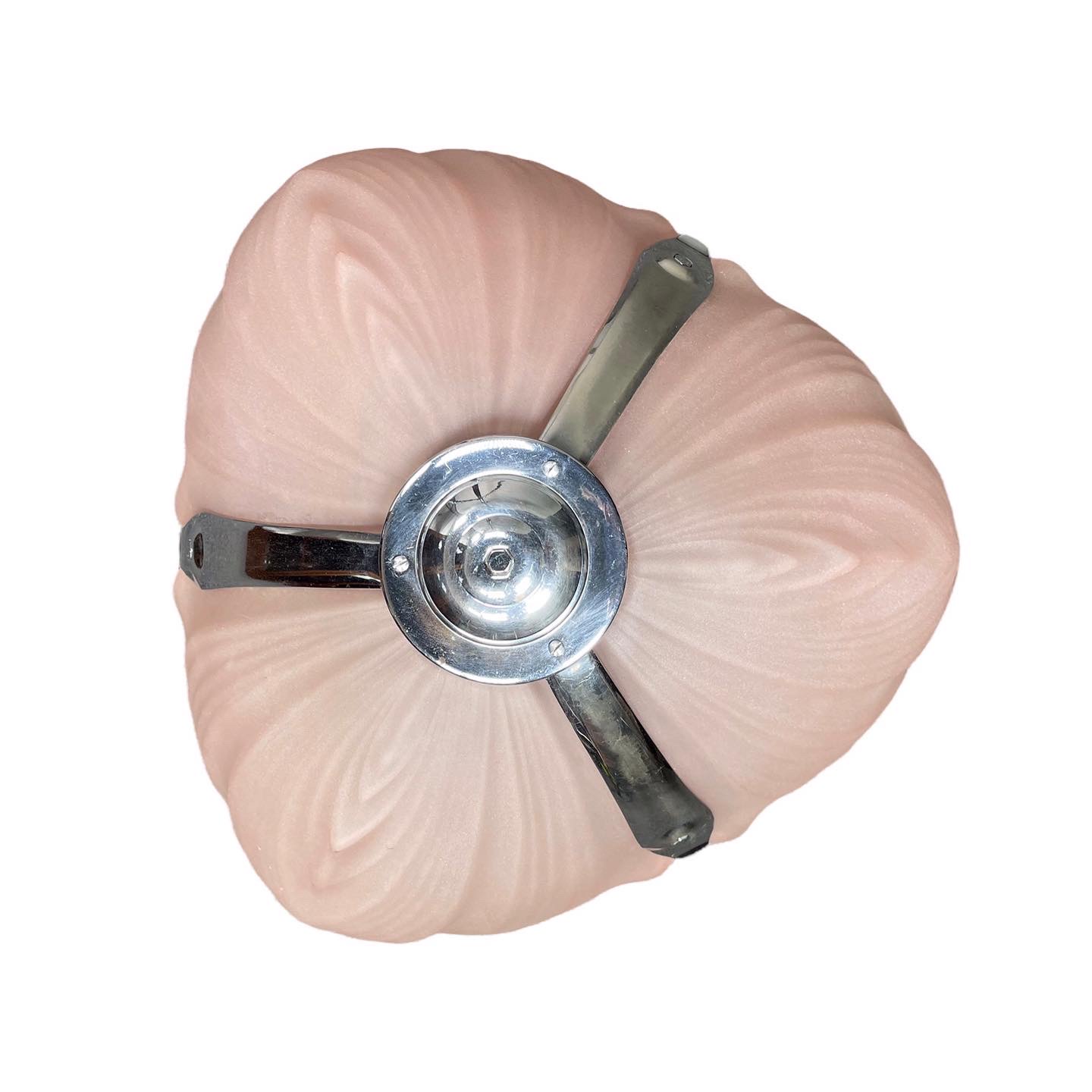 Art Deco ceiling light in frosted pale pink glass. The three scalloped shells secured by the chrome fitting. The chrome with some light wear in places. The light comes with the three chrome hanging chains.