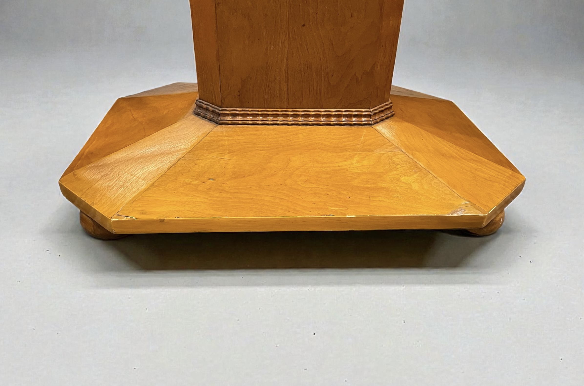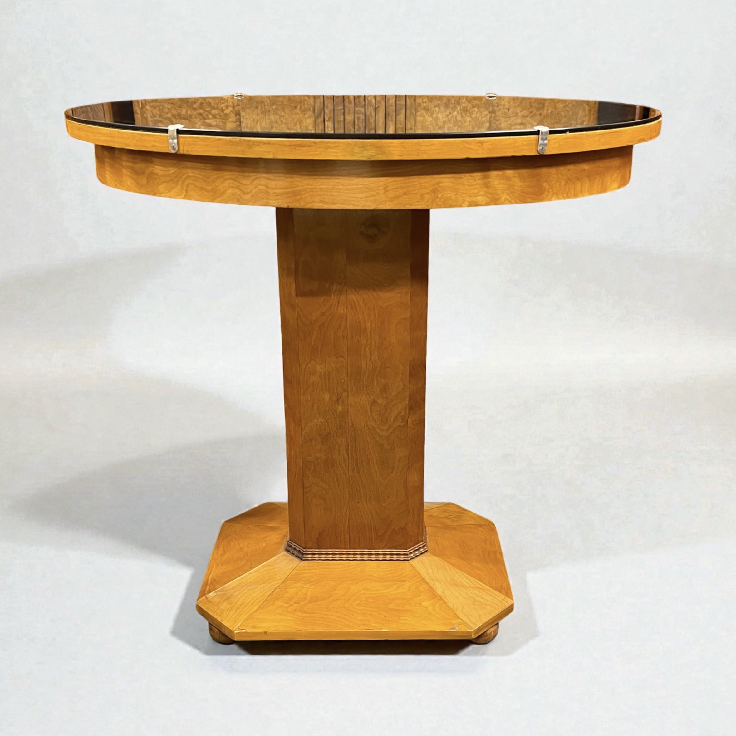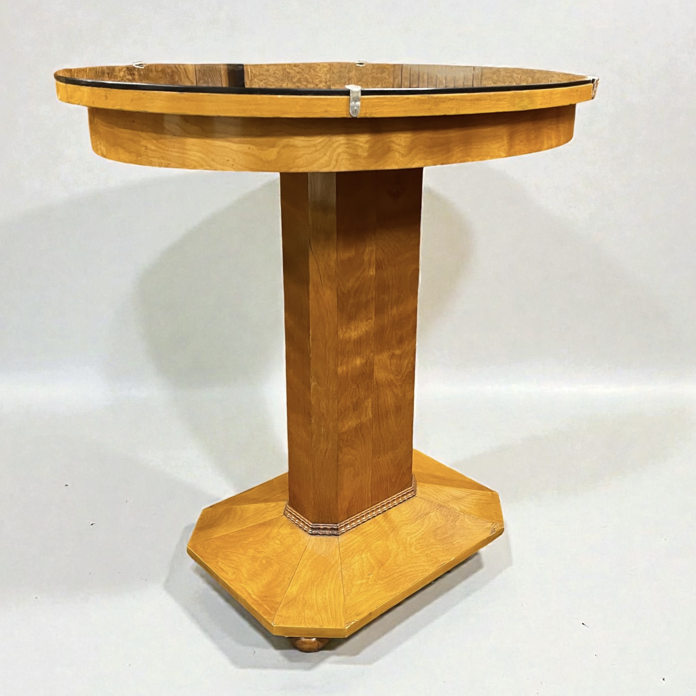 A Scandinavian centre table in elm. The oval top with a copper colour mirror and the pedestal and base with canted sides and raised on four small bun feet. All our furniture is professionally waxed and polished and restored where necessary. This table in very good condition.