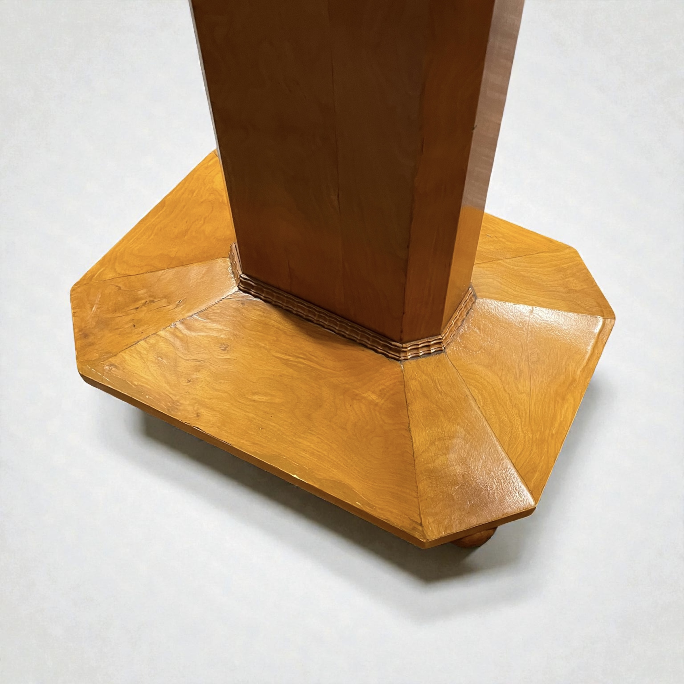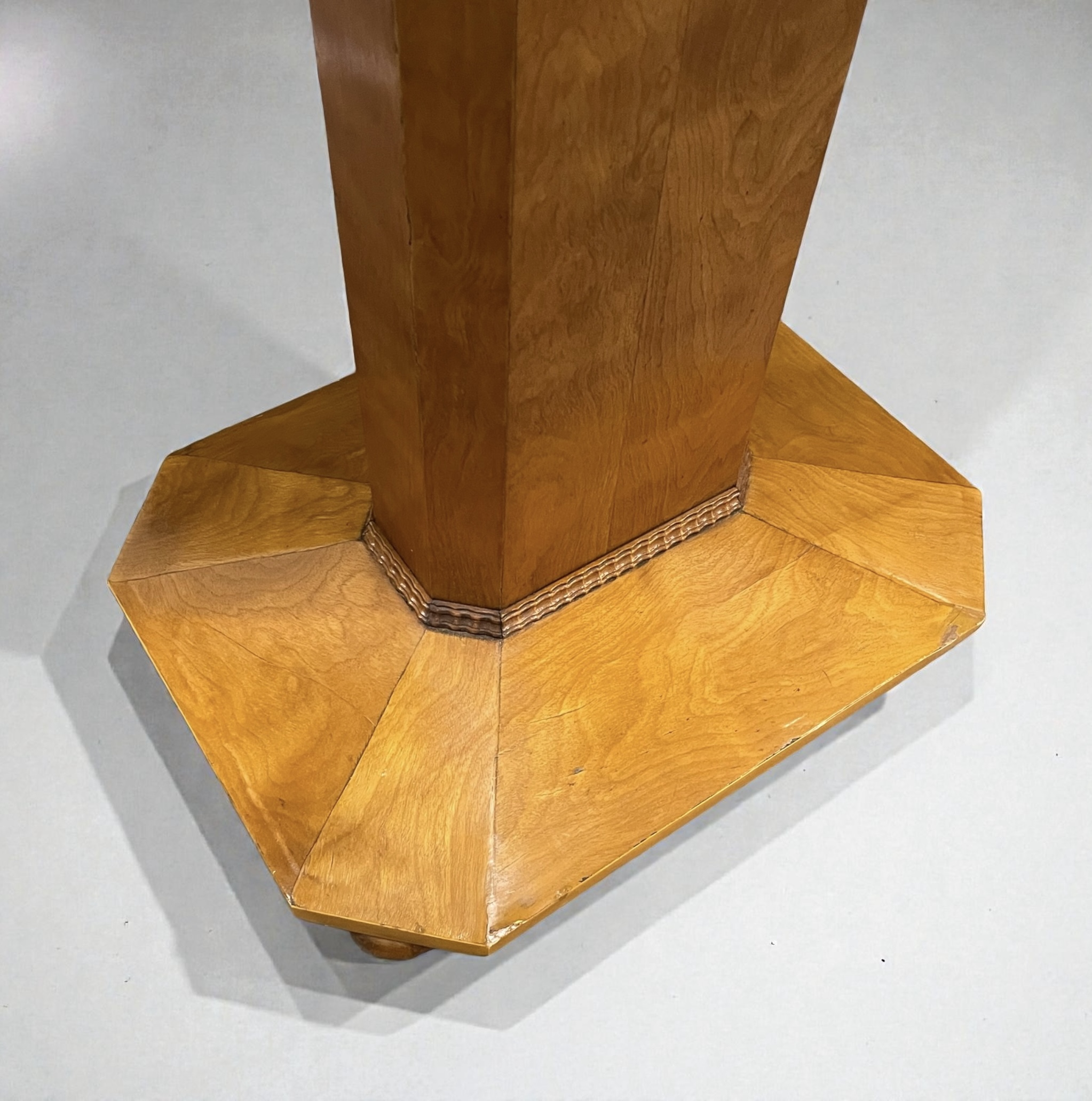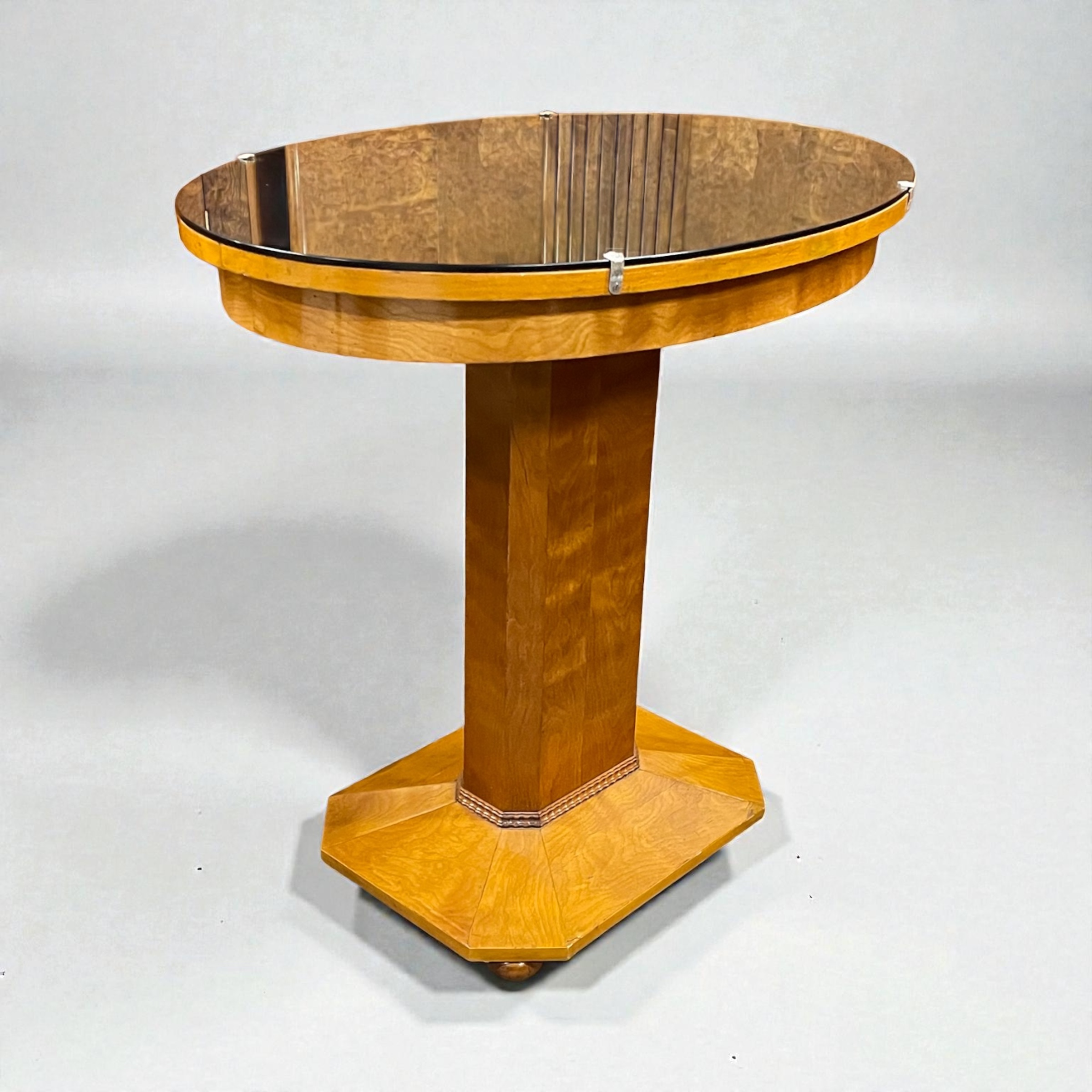 A Scandinavian centre table in elm. The oval top with a copper colour mirror and the pedestal and base with canted sides and raised on four small bun feet. All our furniture is professionally waxed and polished and restored where necessary. This table in very good condition.