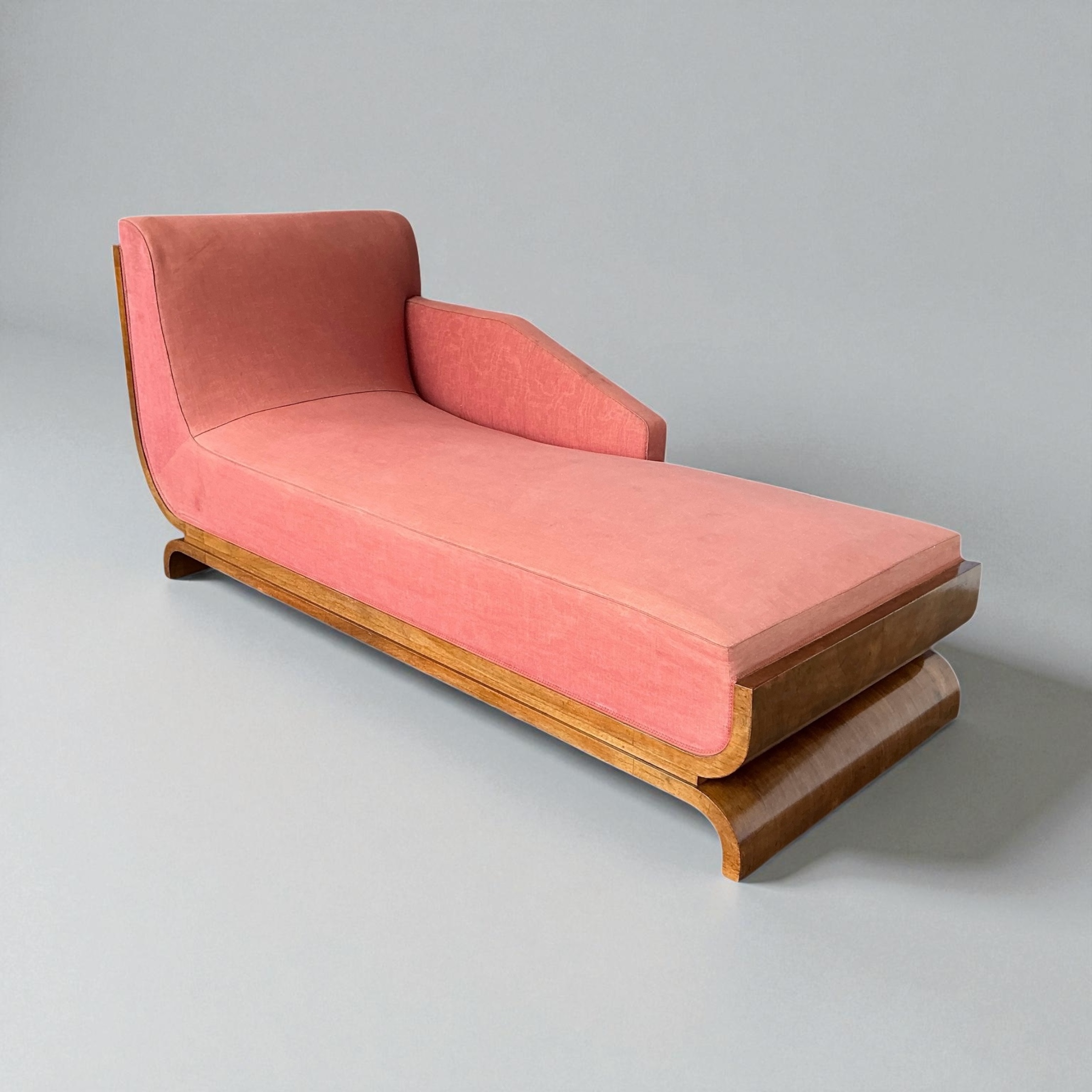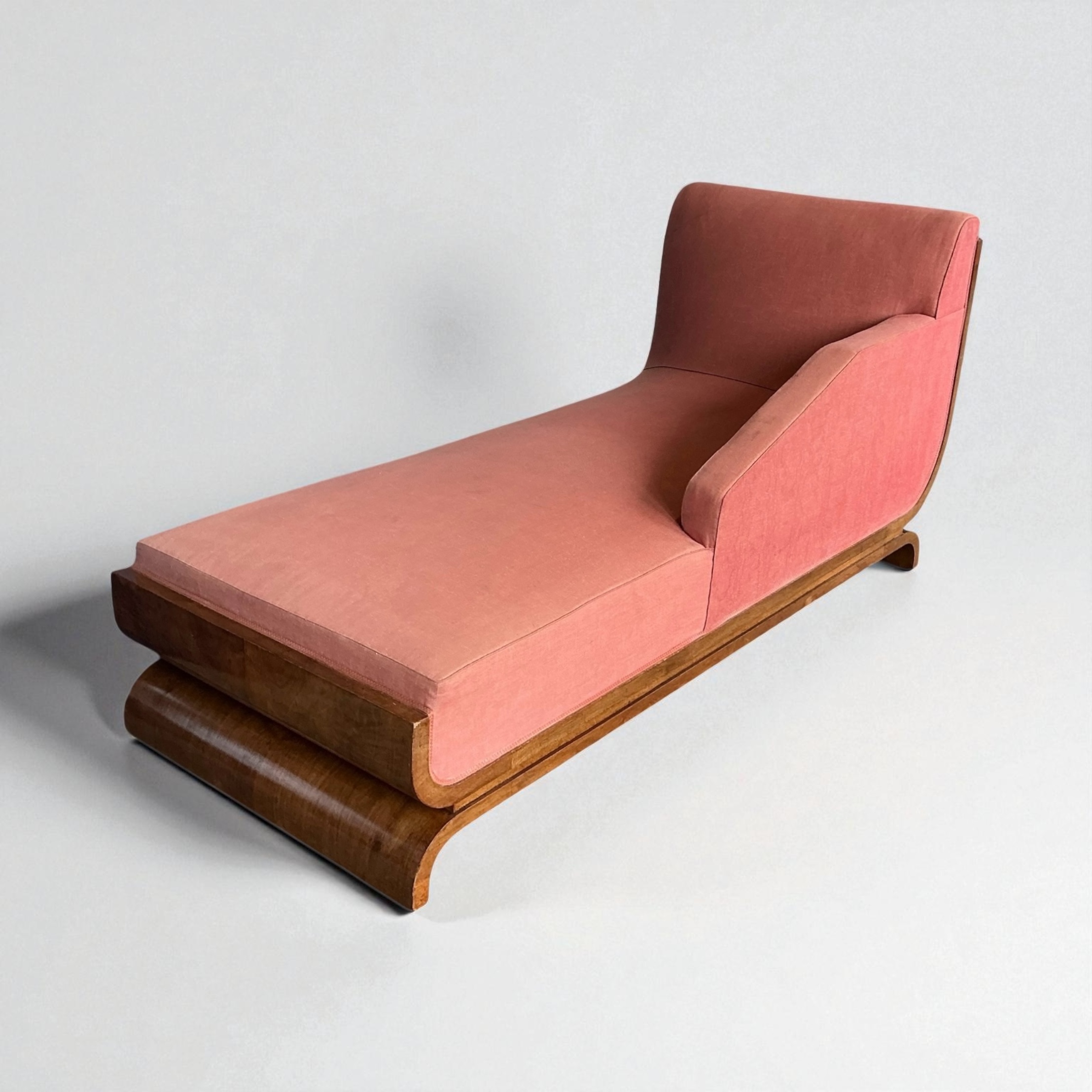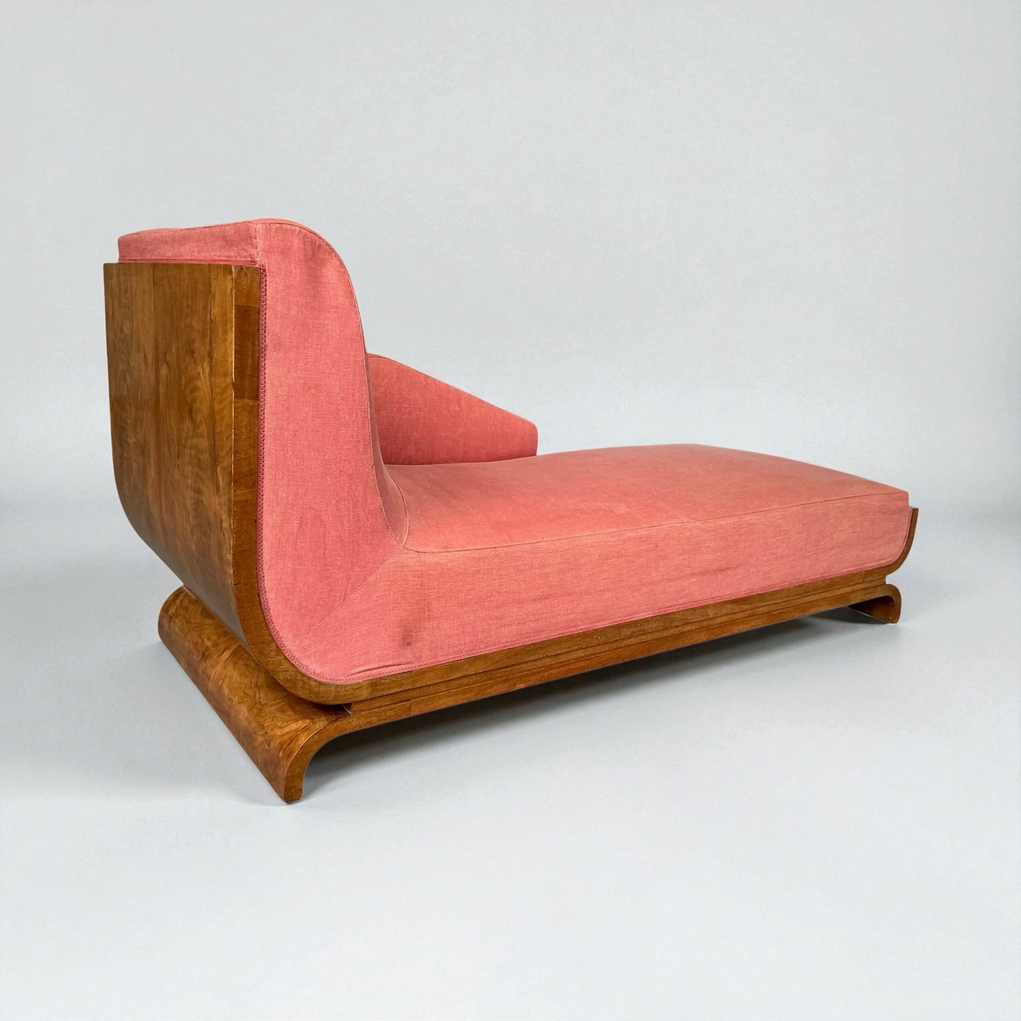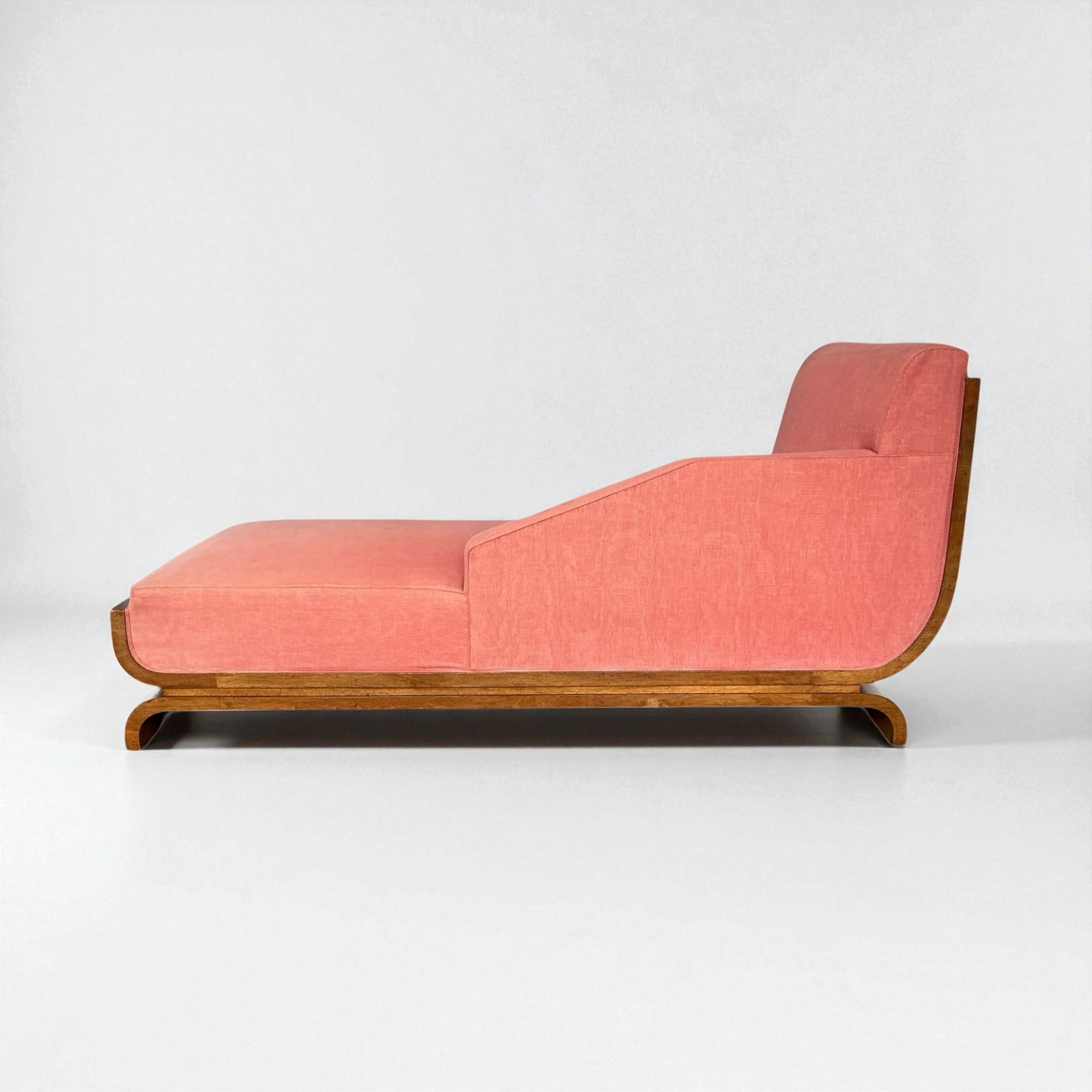 Superb Art Deco Chaise Lounge, with a curved walnut back, a walnut base and elegant curved legs. A very heavy piece with a well sprung base. Retaining its vintage upholstery allowing the purchaser to choose a fabric that will work best for them.