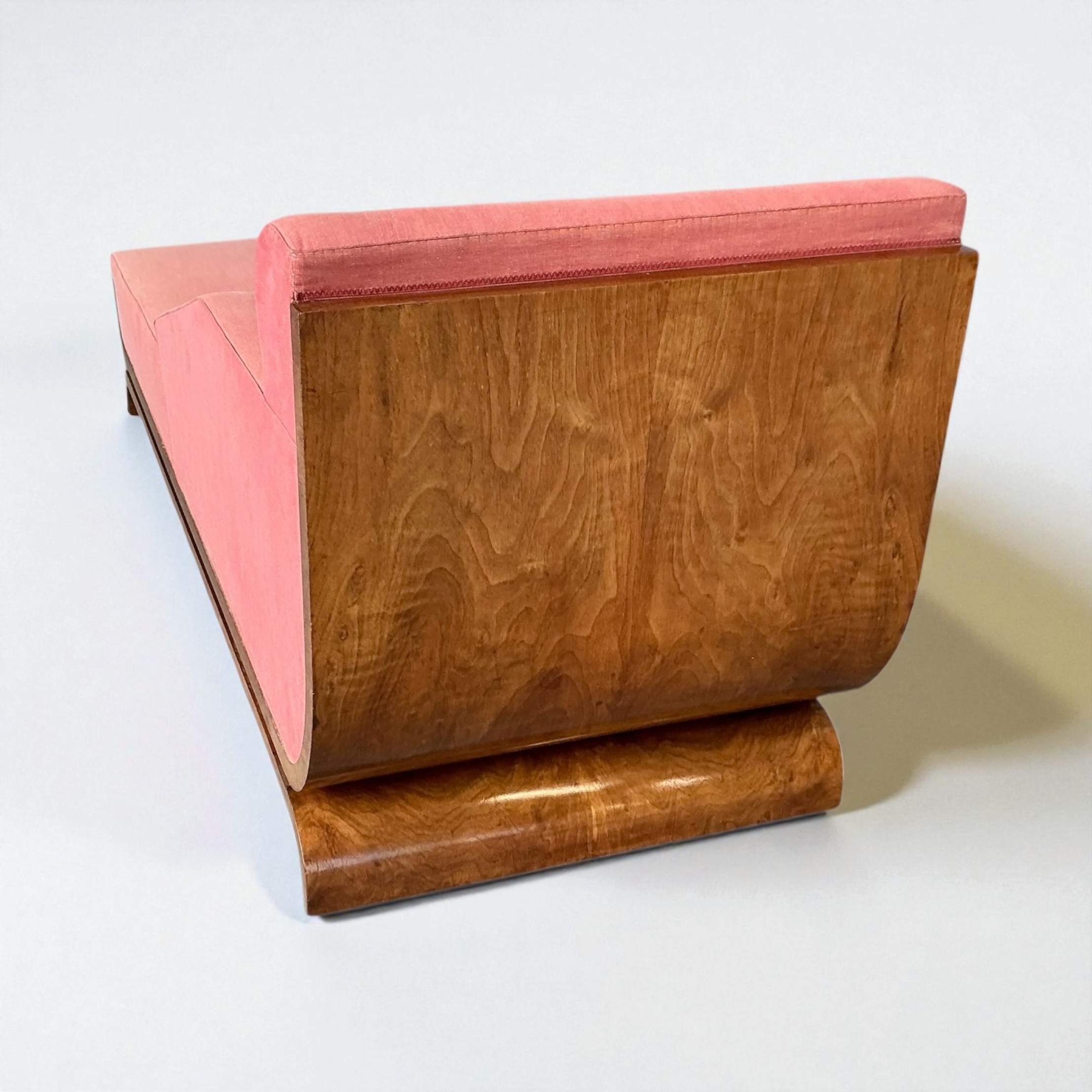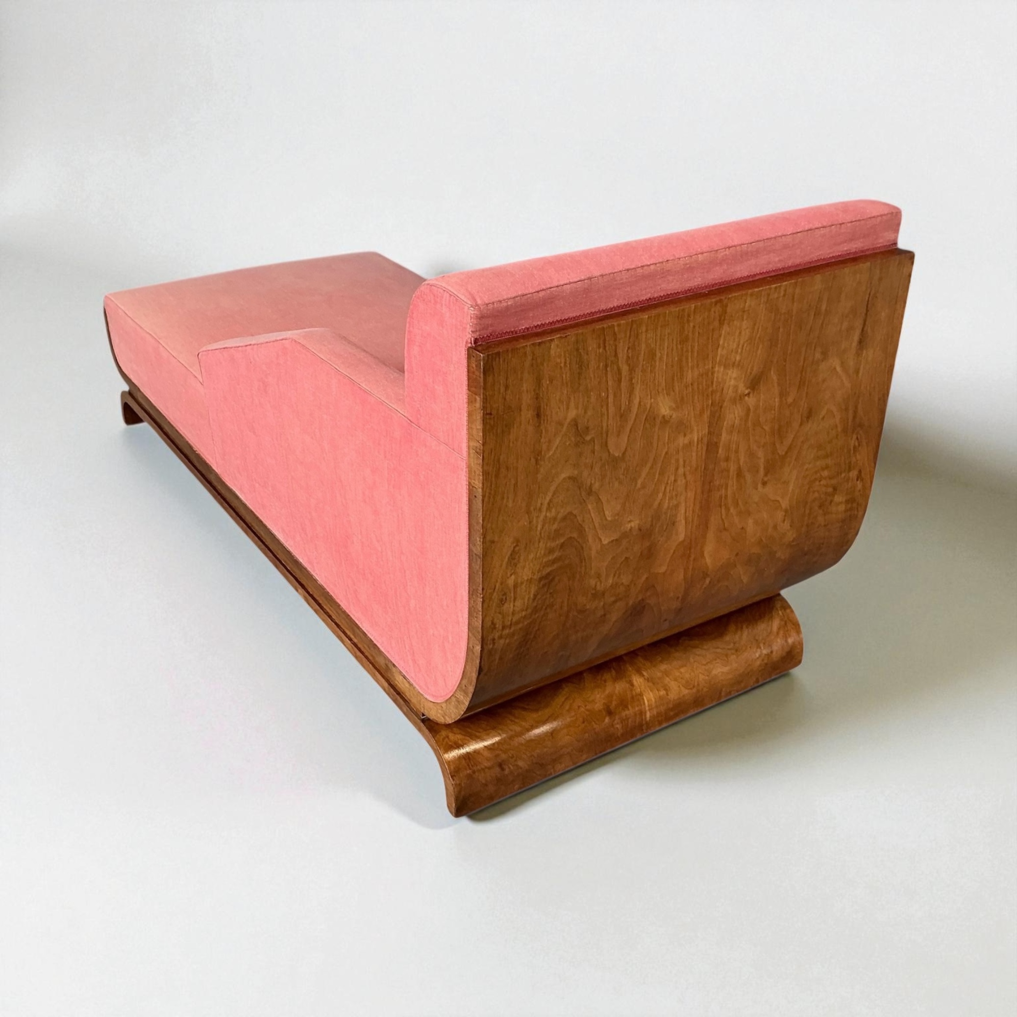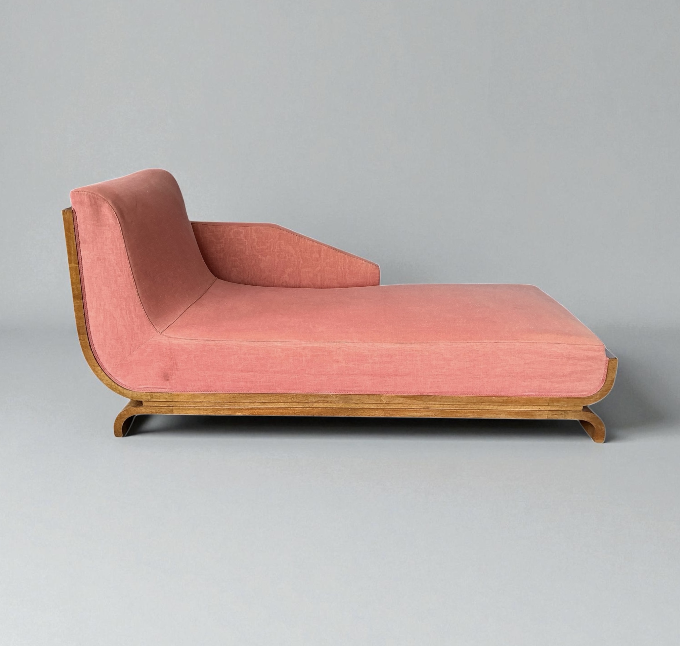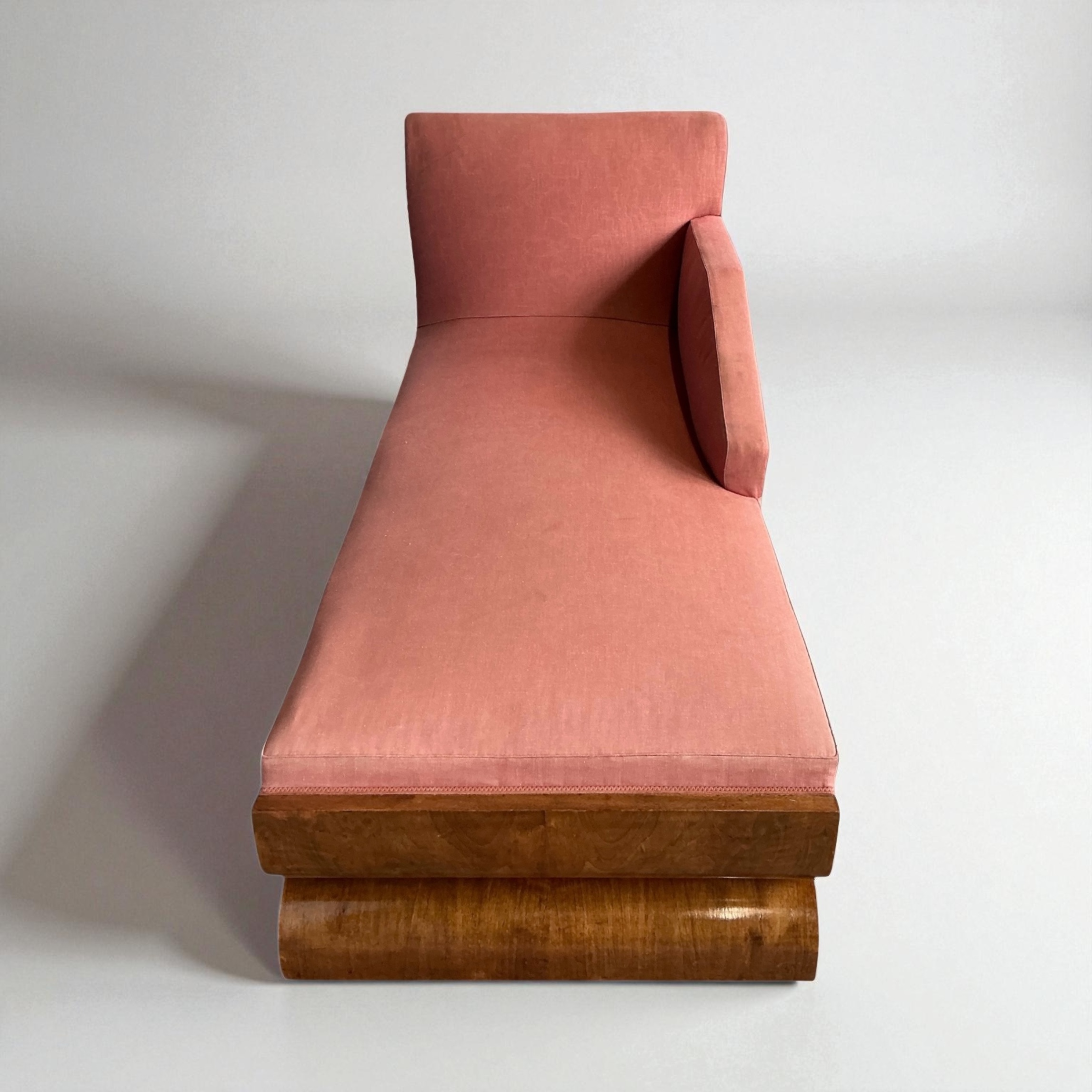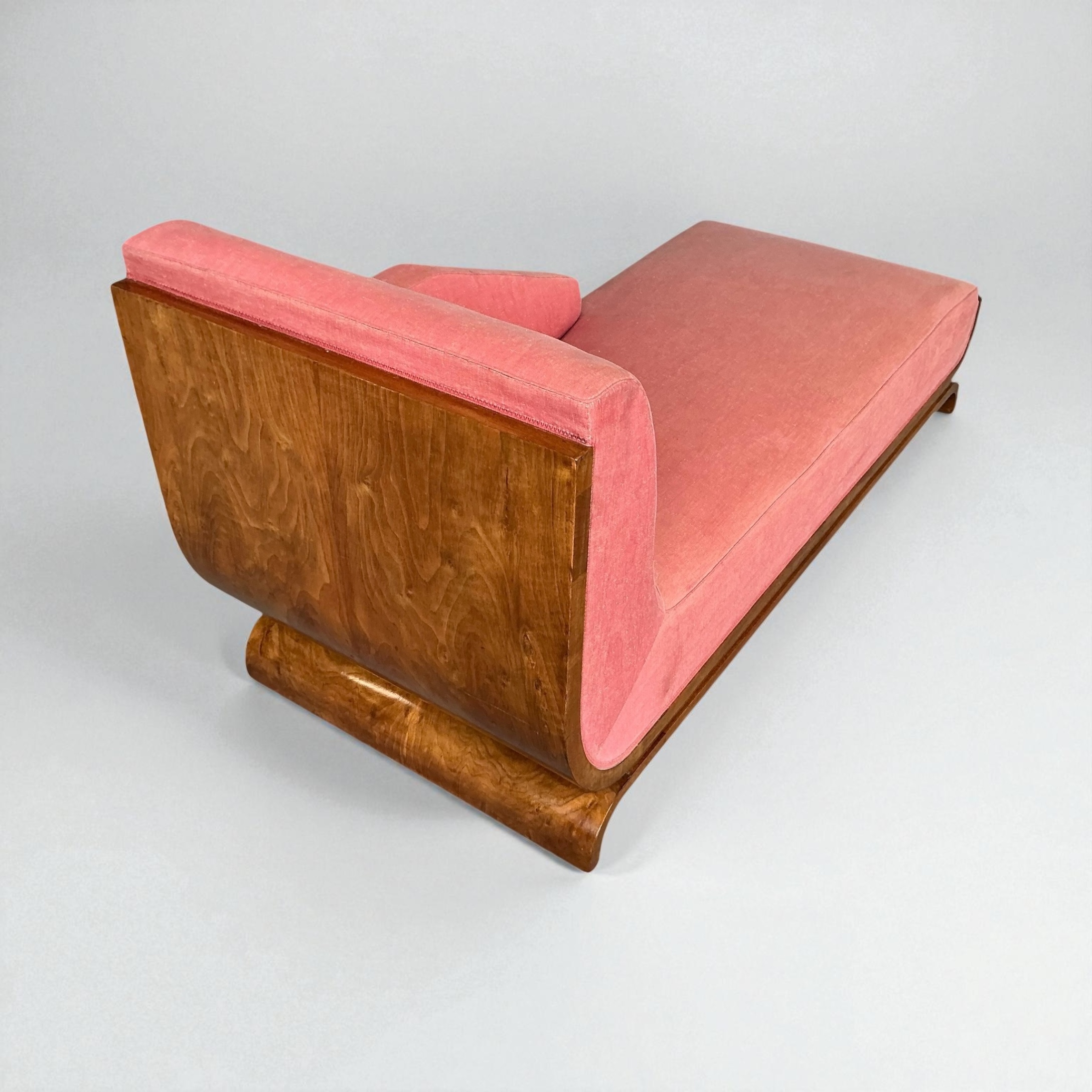 Superb Art Deco Chaise Lounge, with a curved walnut back, a walnut base and elegant curved legs. A very heavy piece with a well sprung base. Retaining its vintage upholstery allowing the purchaser to choose a fabric that will work best for them.