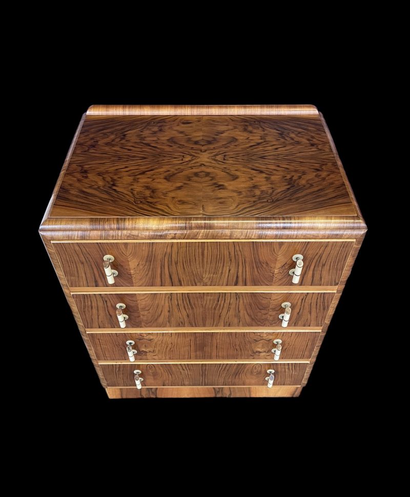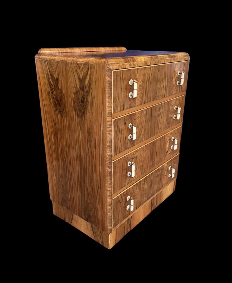 An Art Deco Chest of Drawers in walnut, with four drawers and superb designed cream and brown phenolic handles.
