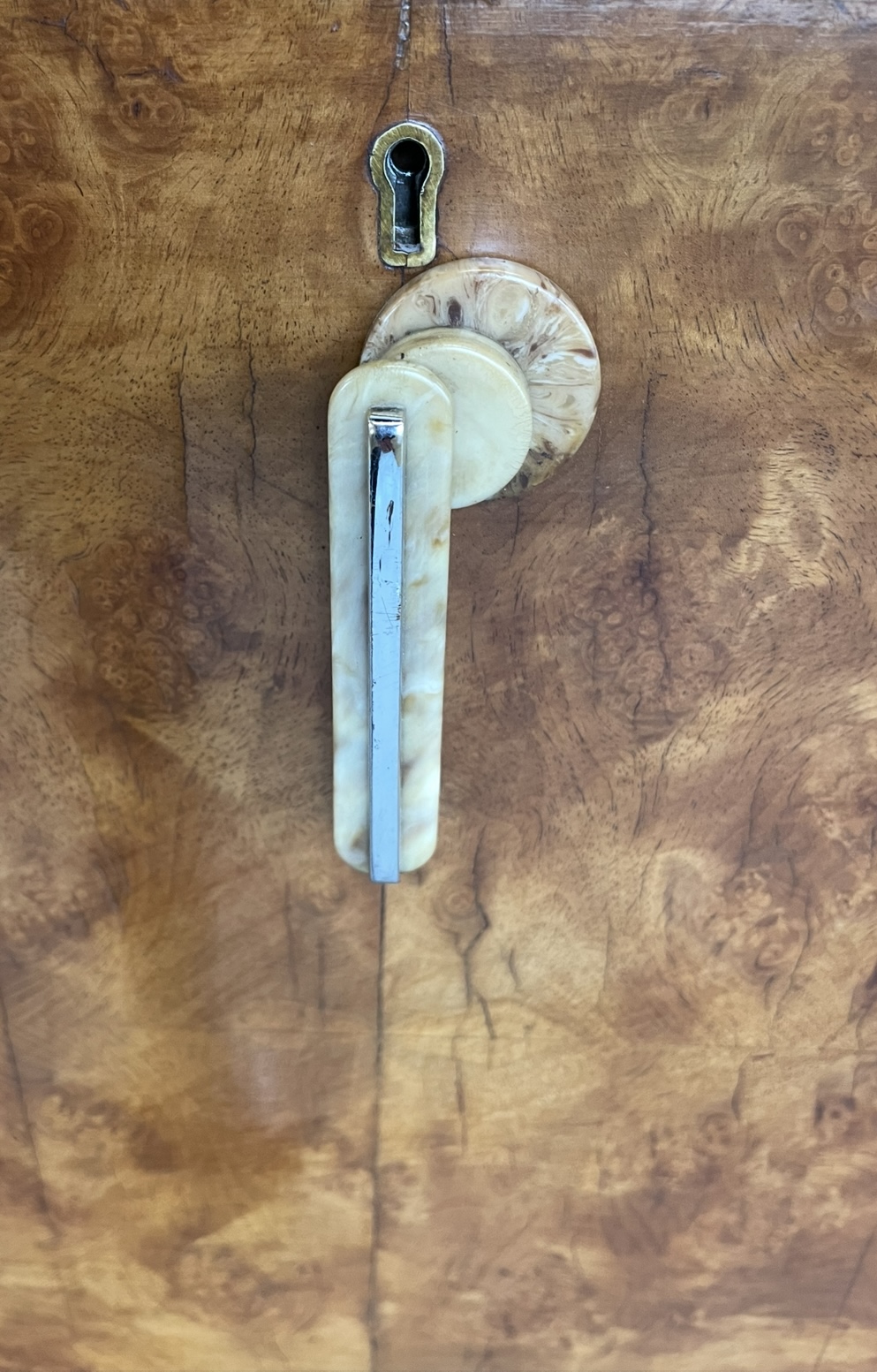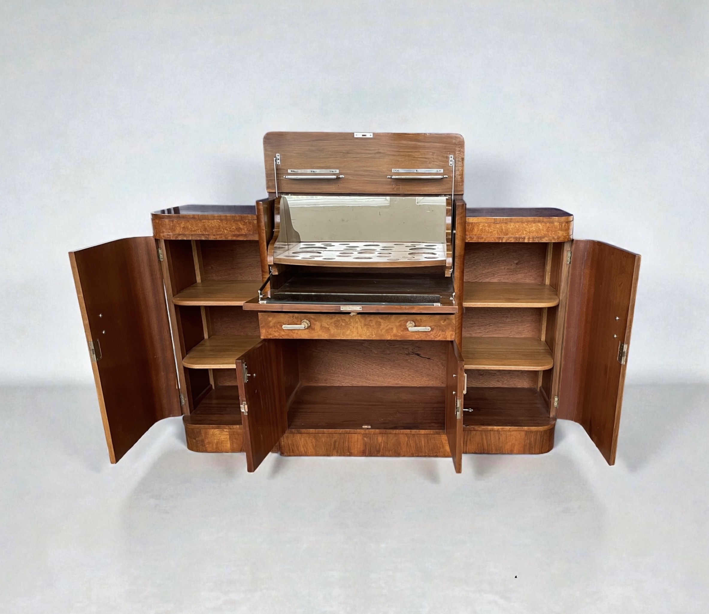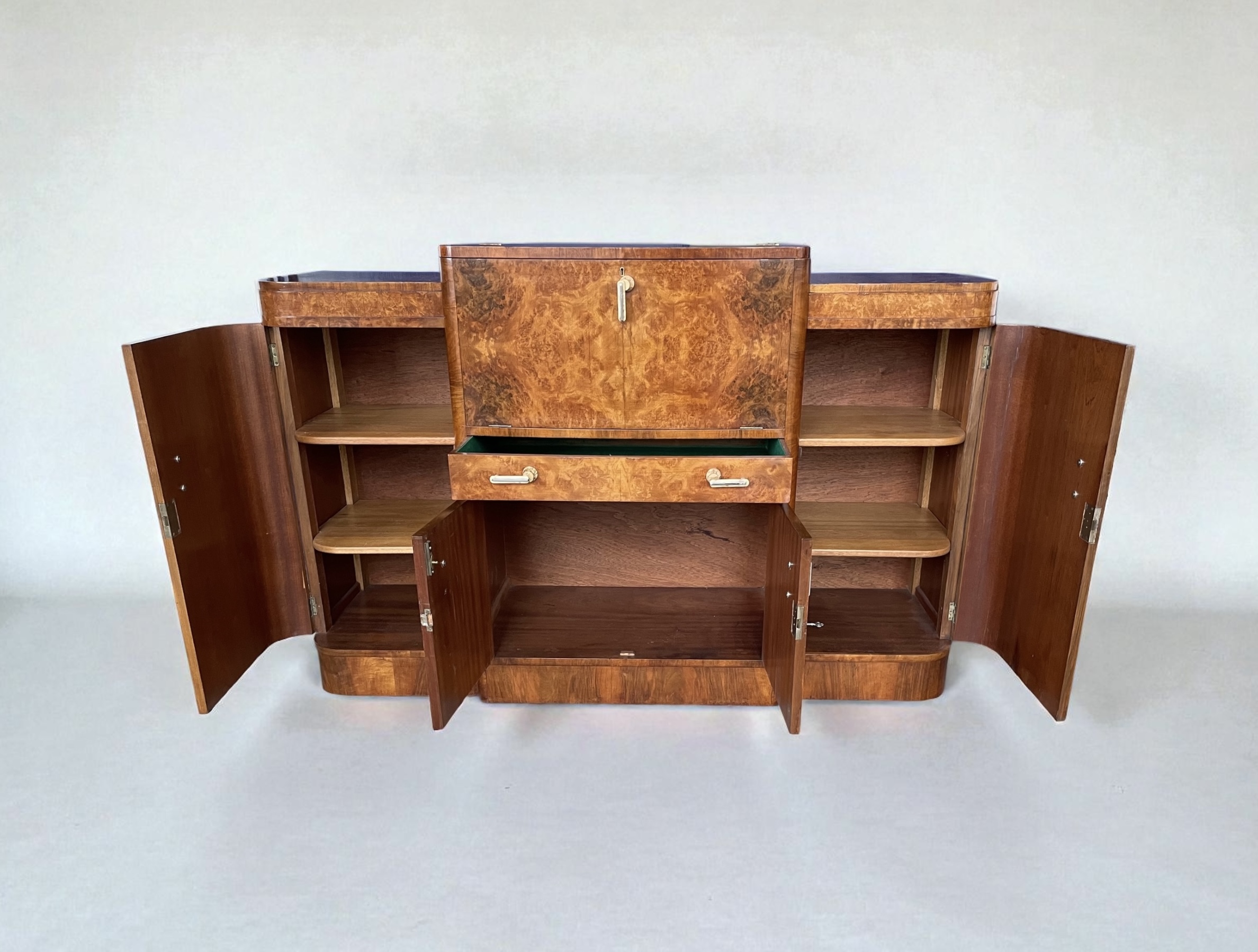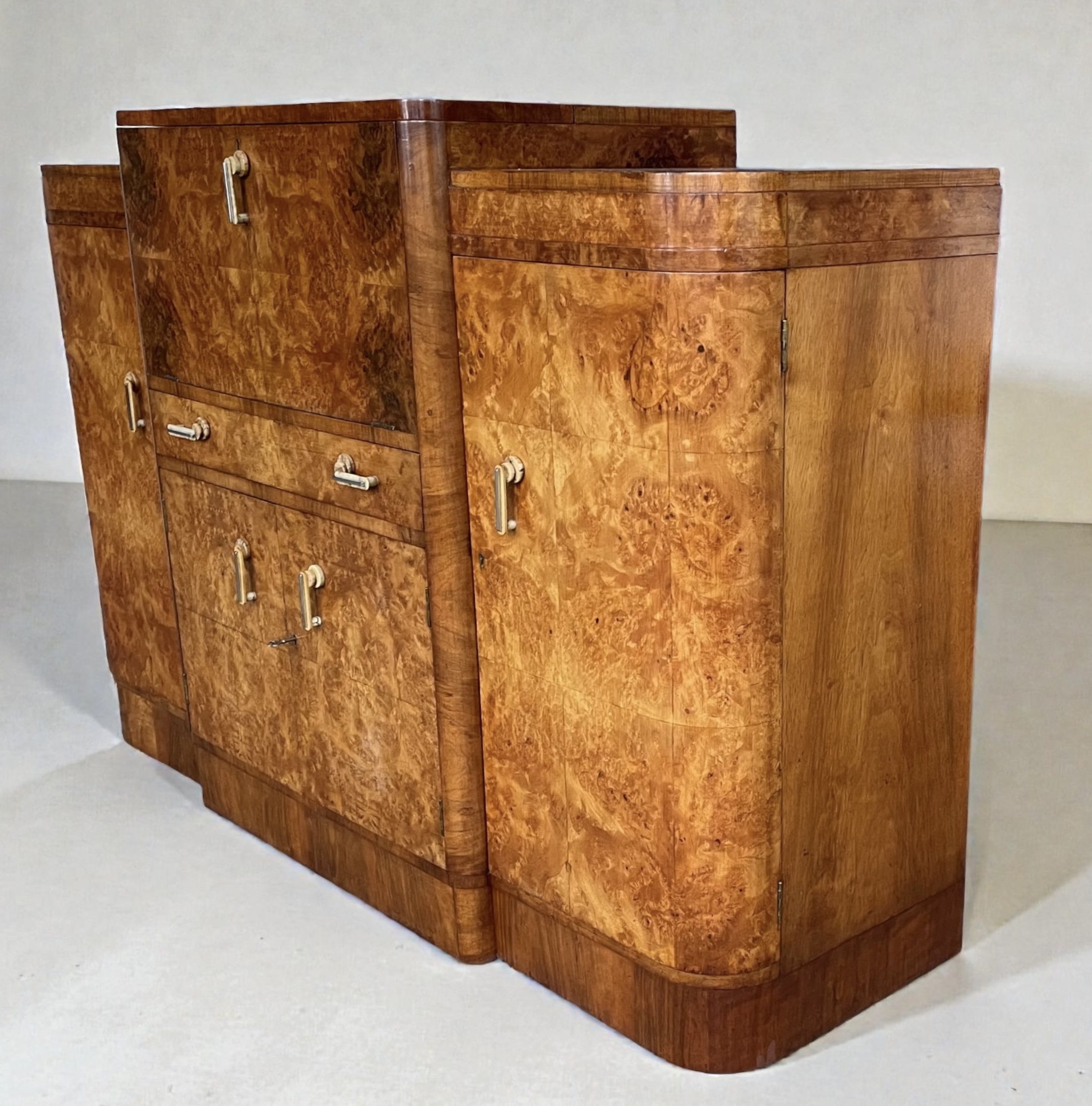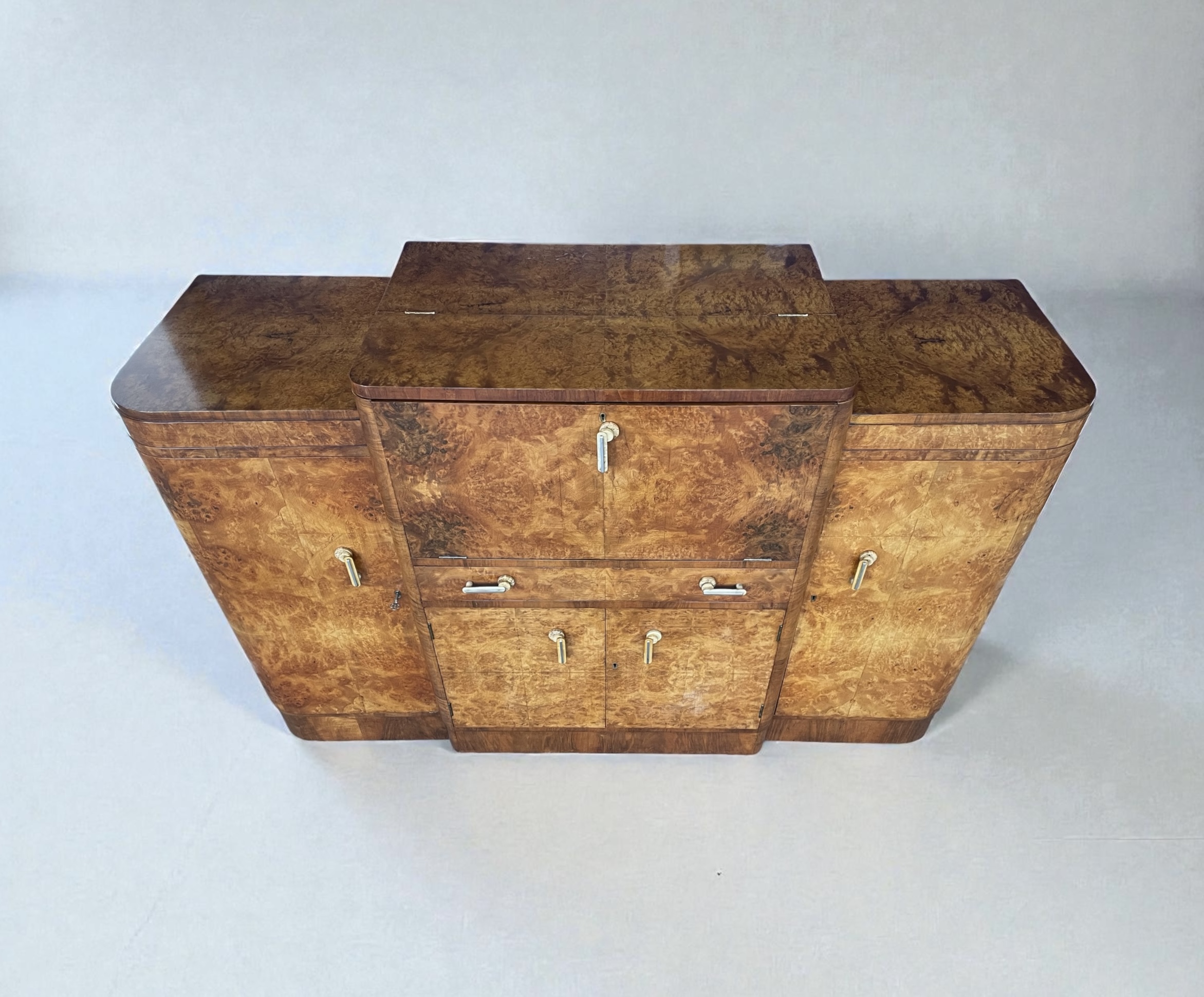 Fine Art Deco Sideboard/Cocktail Cabinet by Harry and Lou Epstein. In burr walnut with two cupboards to each side, each with three shelves. To the centre a pull down drinks area, with spaces for drinking glasses, cocktail sticks and glass to both the back and serving area. Below a drawer, just rebaized and a two door cupboard below. Attractive phenolic handles throughout.