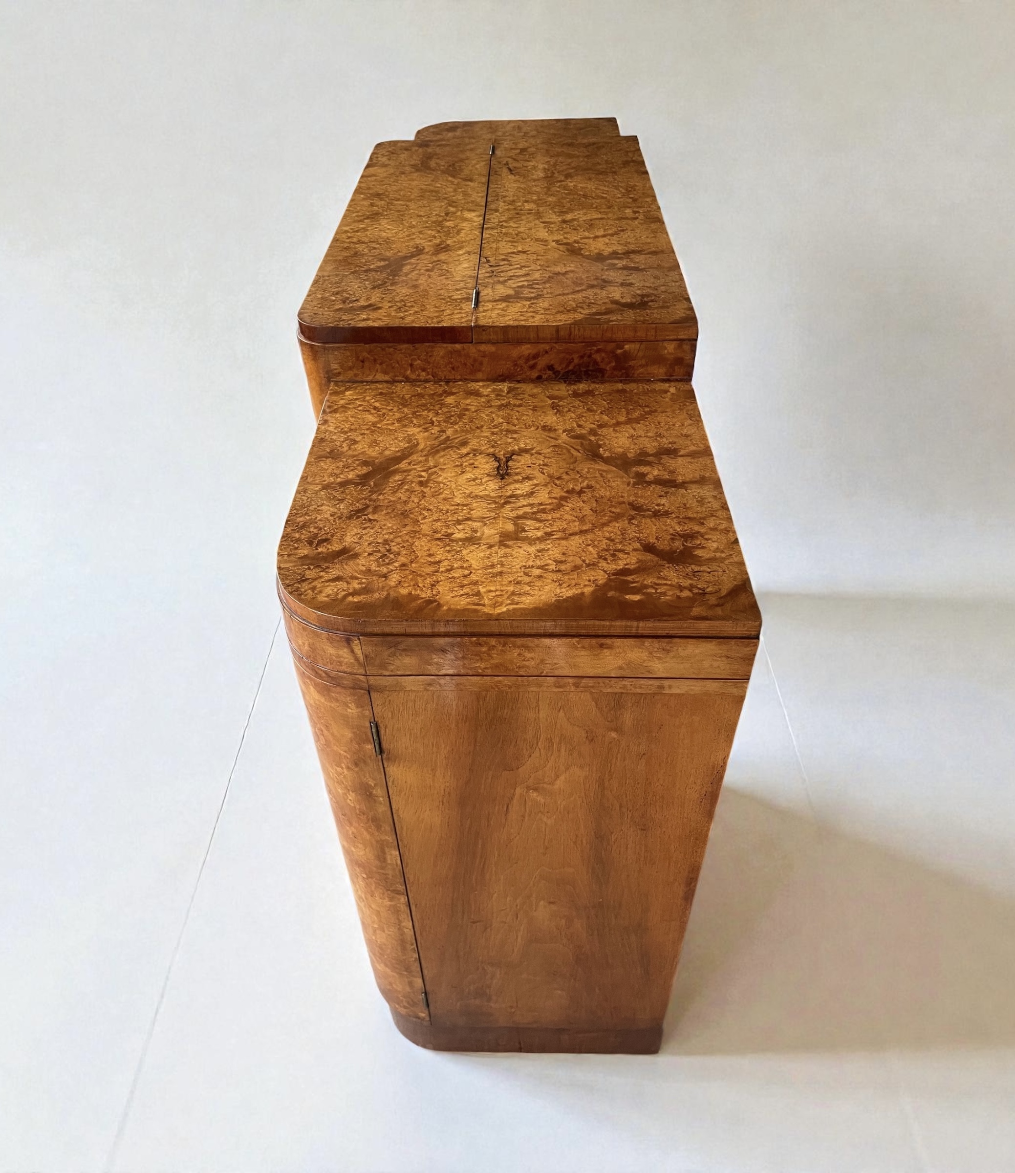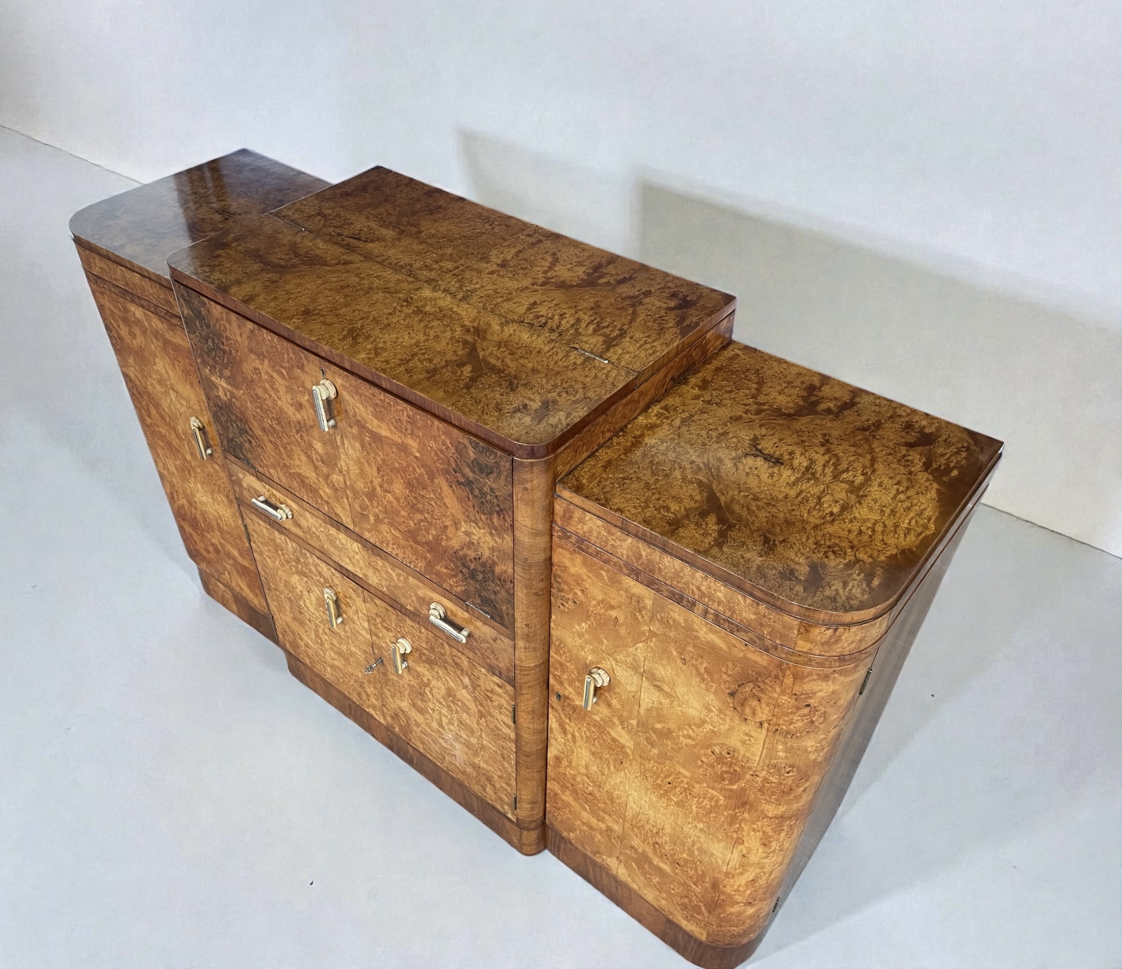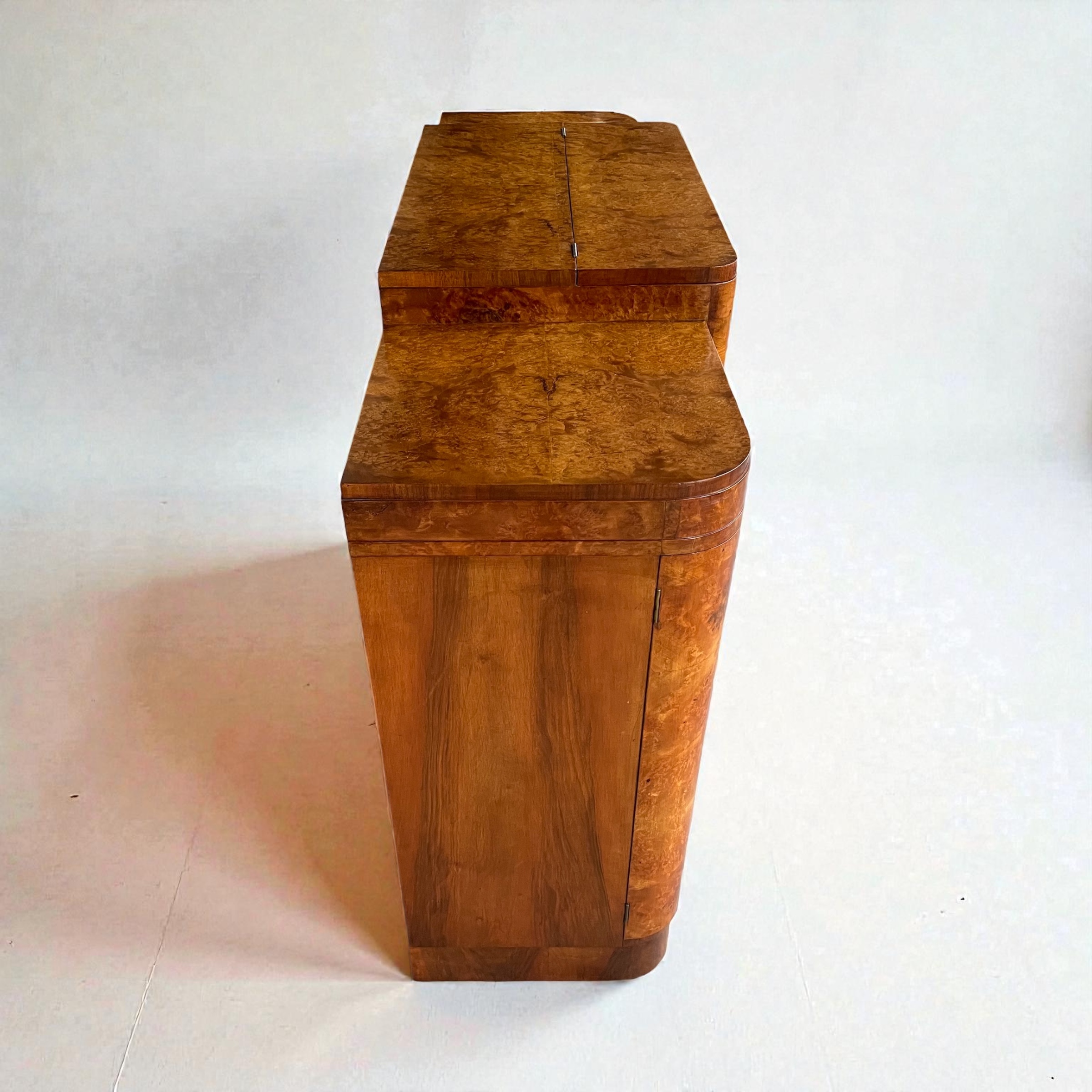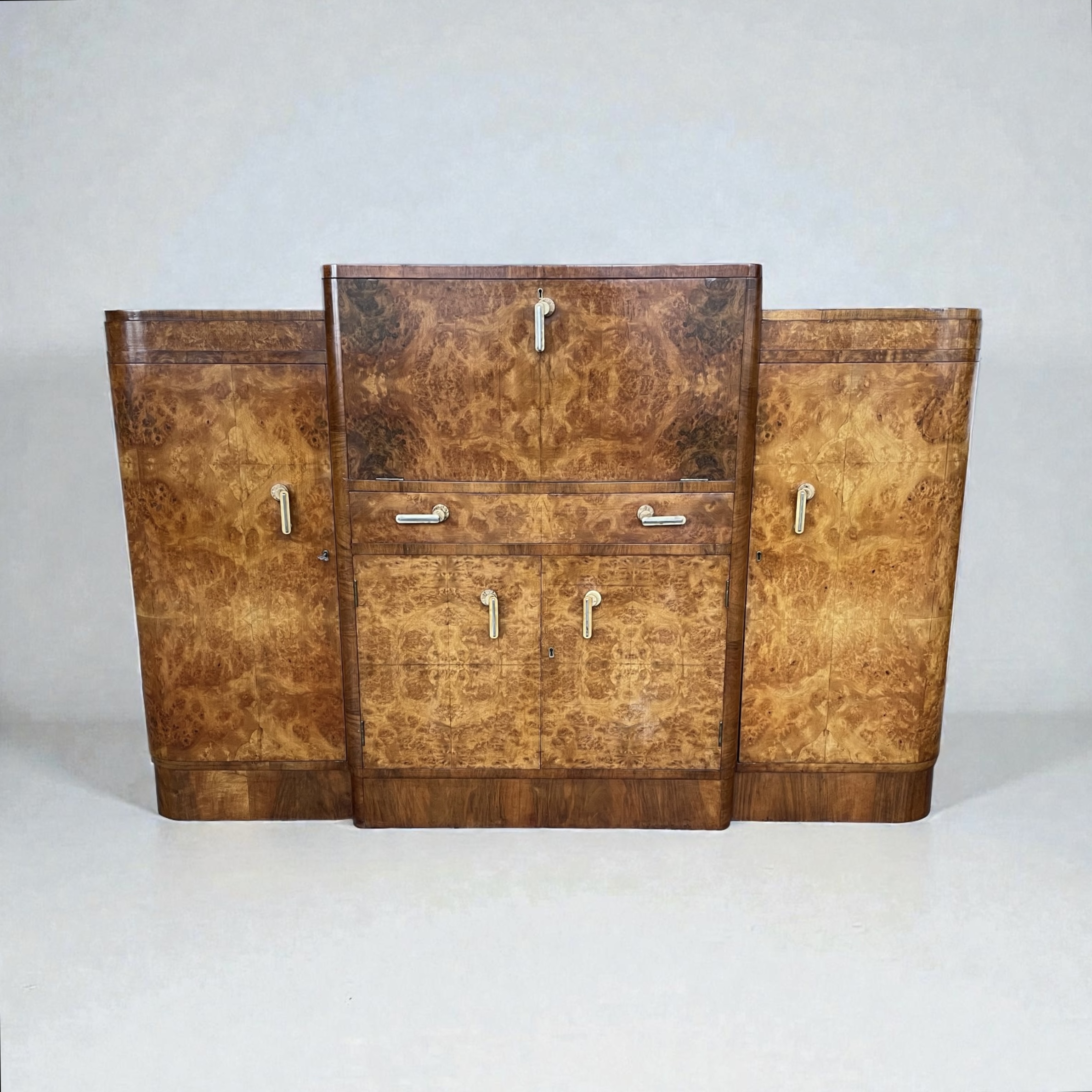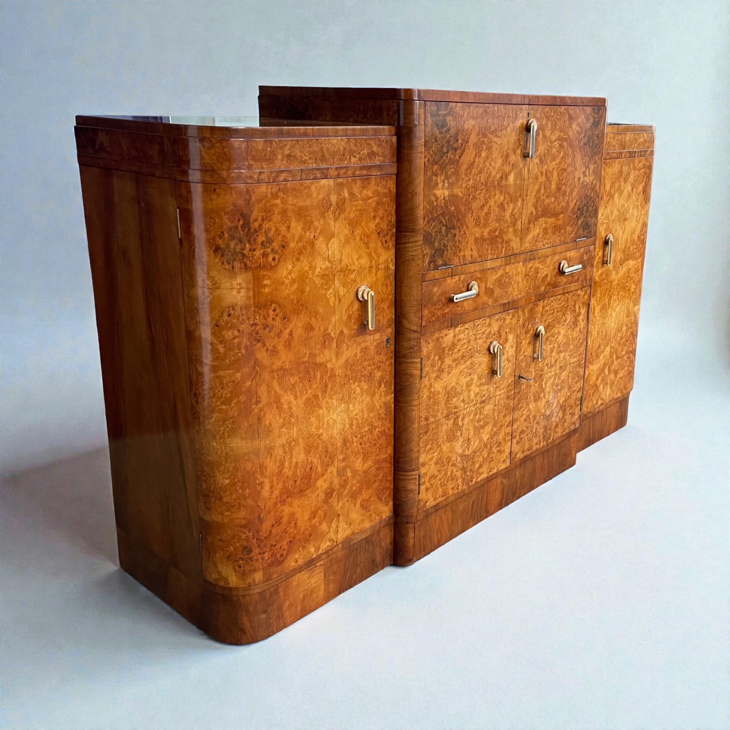 Fine Art Deco Sideboard/Cocktail Cabinet by Harry and Lou Epstein. In burr walnut with two cupboards to each side, each with three shelves. To the centre a pull down drinks area, with spaces for drinking glasses, cocktail sticks and glass to both the back and serving area. Below a drawer, just rebaized and a two door cupboard below. Attractive phenolic handles throughout.