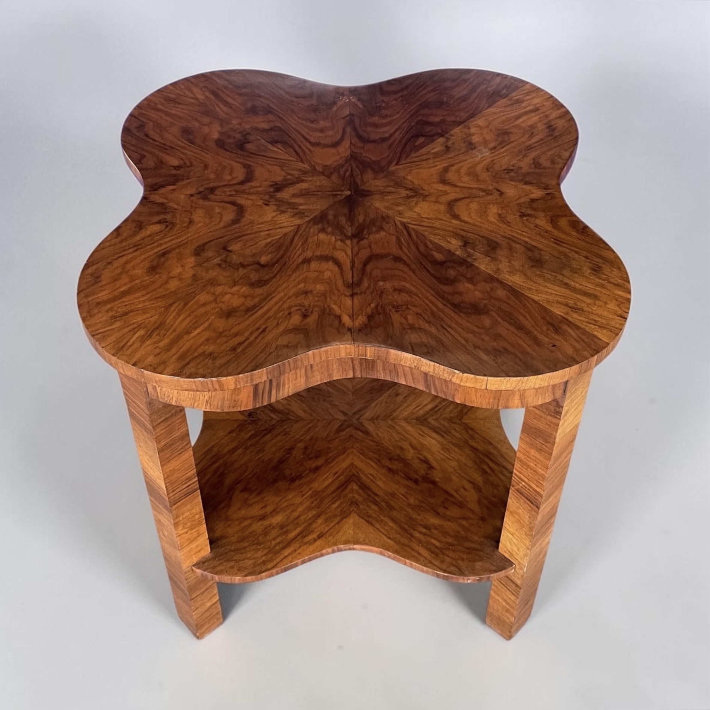An Art Deco quatrefoil shaped two tier coffee table in walnut.