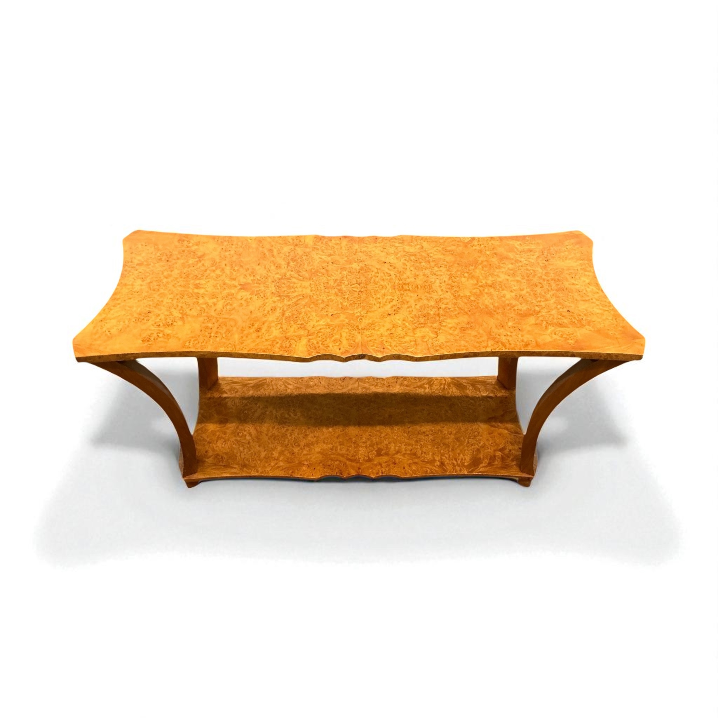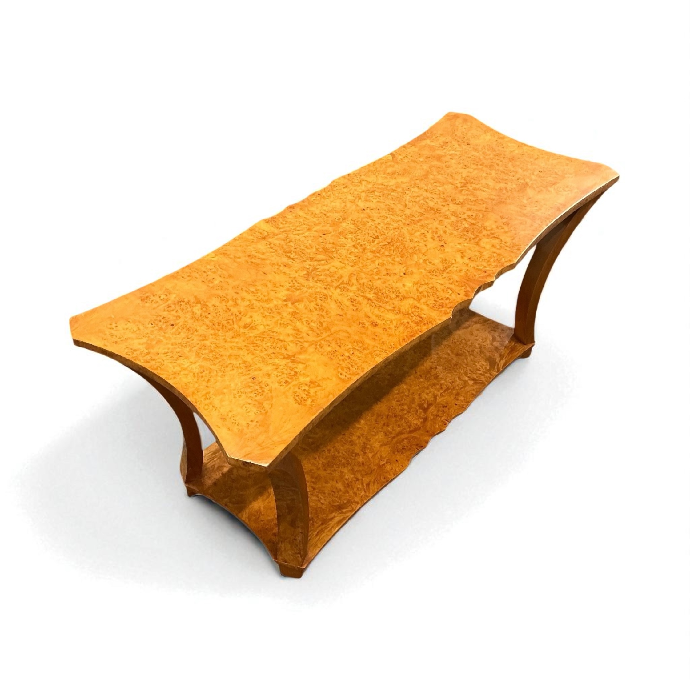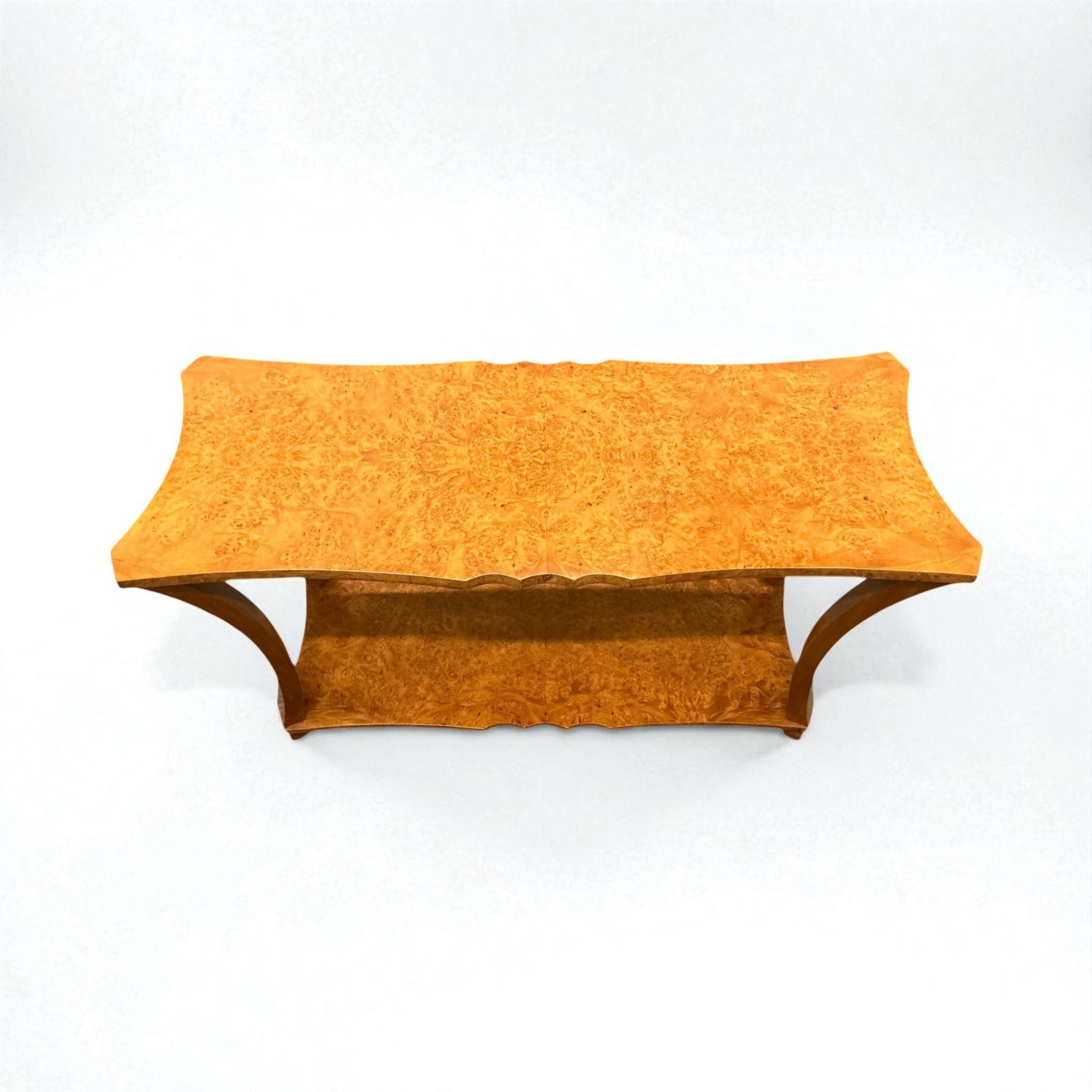 Art Deco burr maple coffee table, with fluted sides to both the top and bottom shelf and supported on four curved legs.