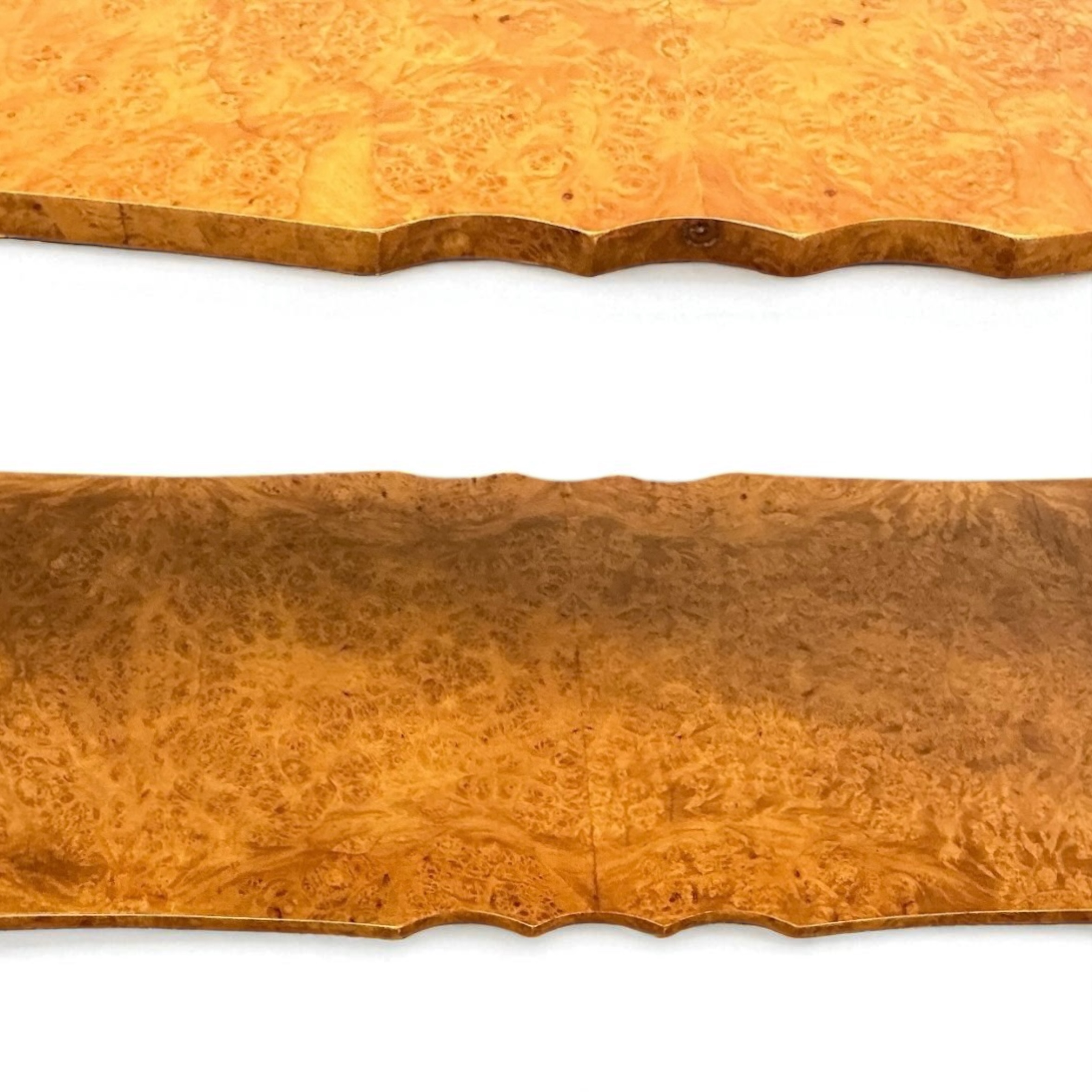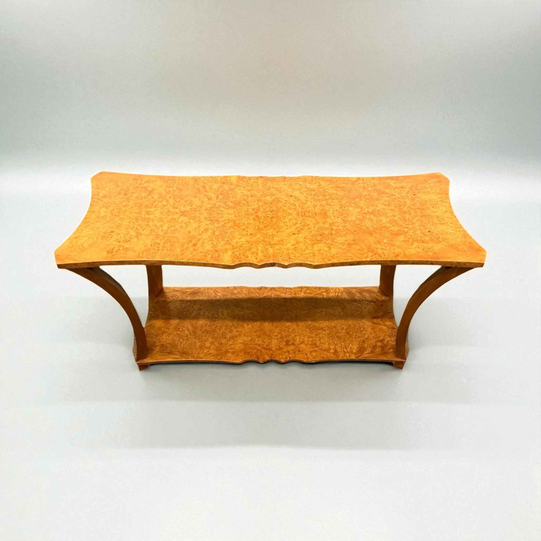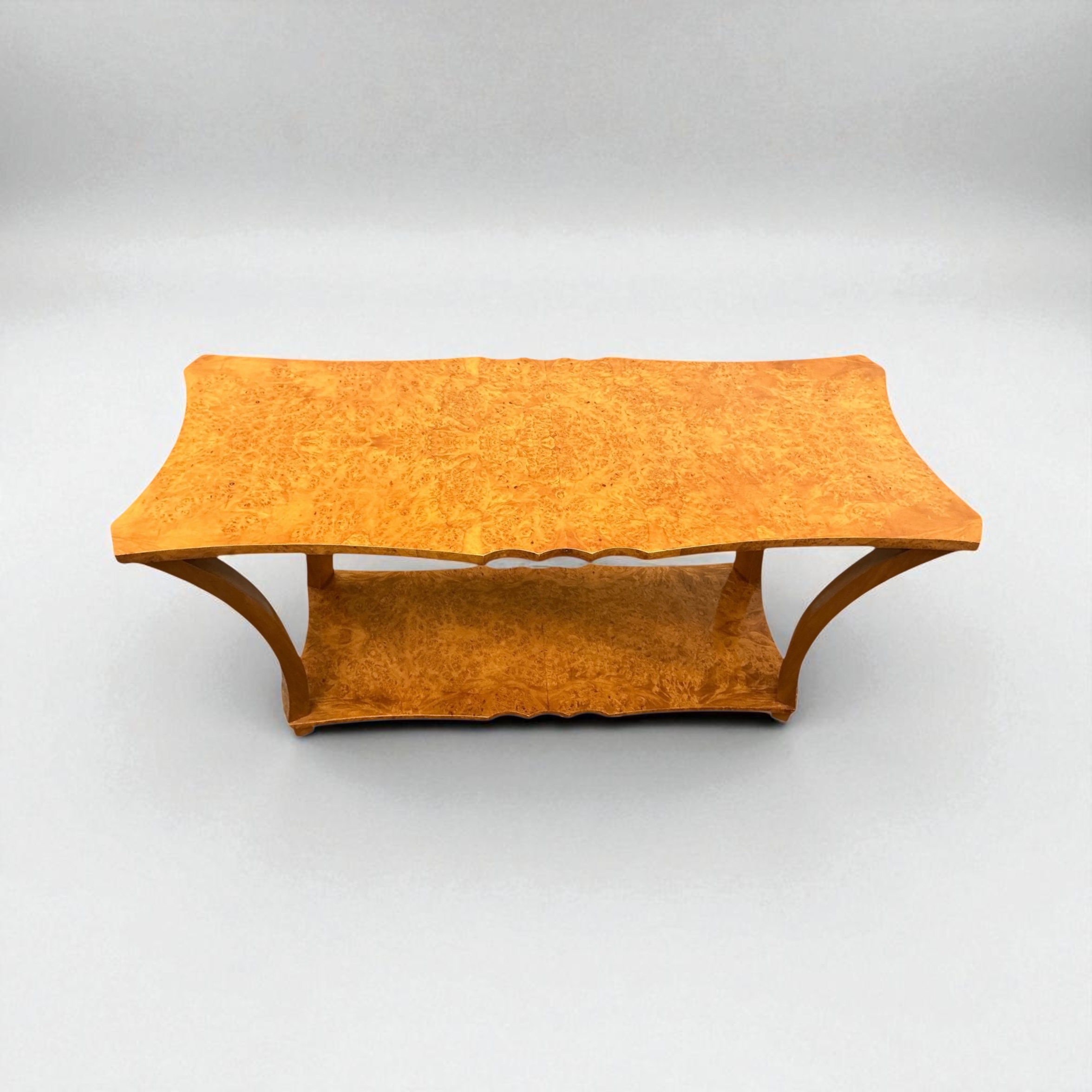 Art Deco burr maple coffee table, with fluted sides to both the top and bottom shelf and supported on four curved legs.