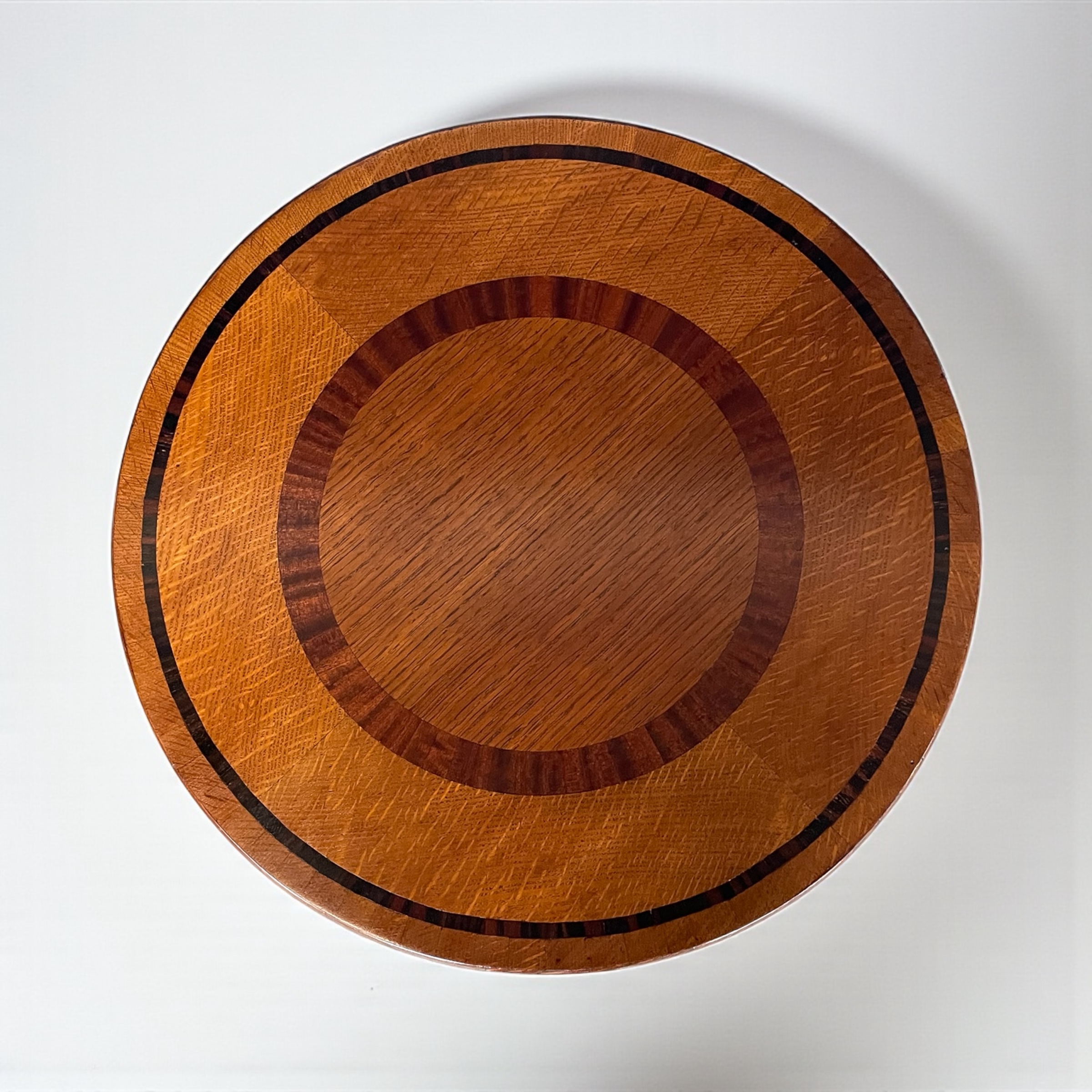 Art Deco circular coffee table. The top with a circular band of walnut to the centre and a macassar ebony band to the outer edge. The bottom shelf with attractive medullary rays to the oak.