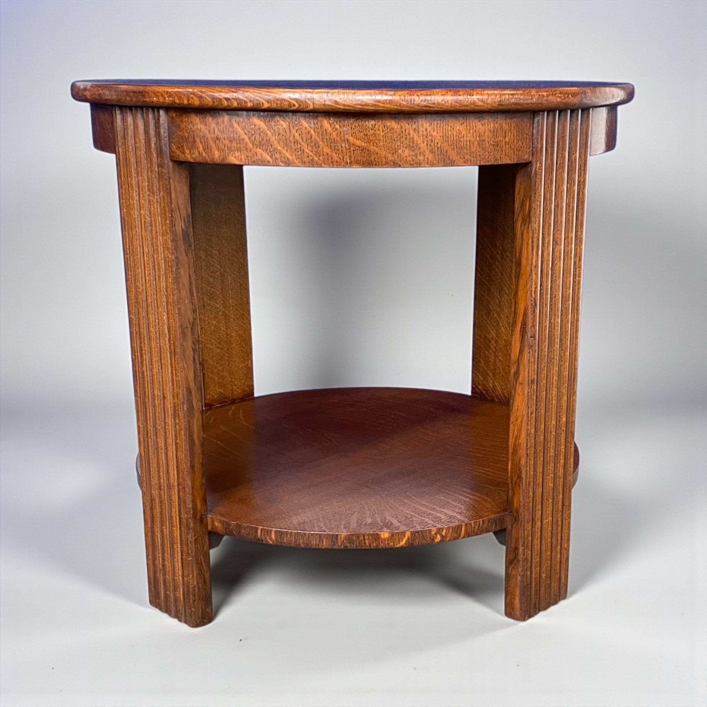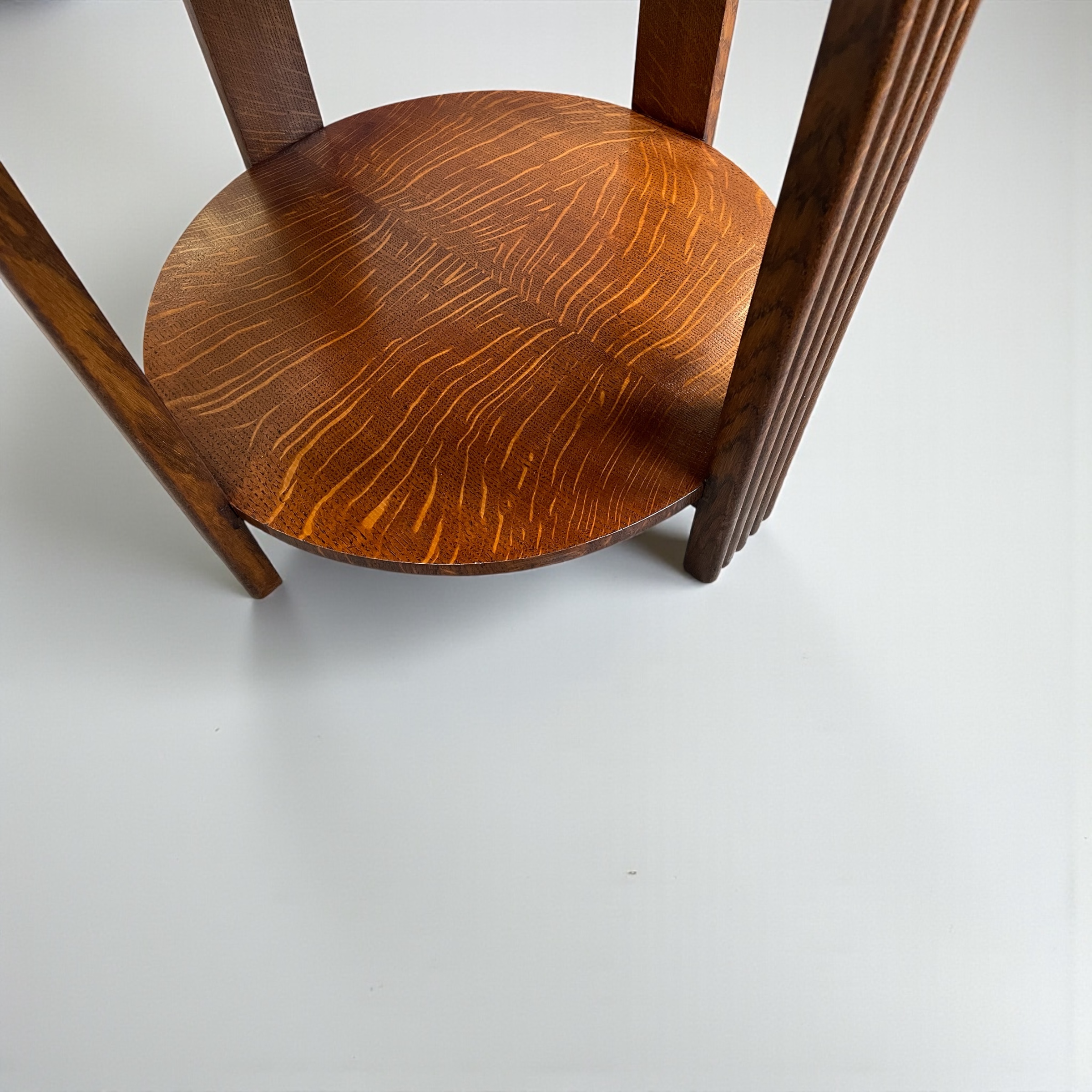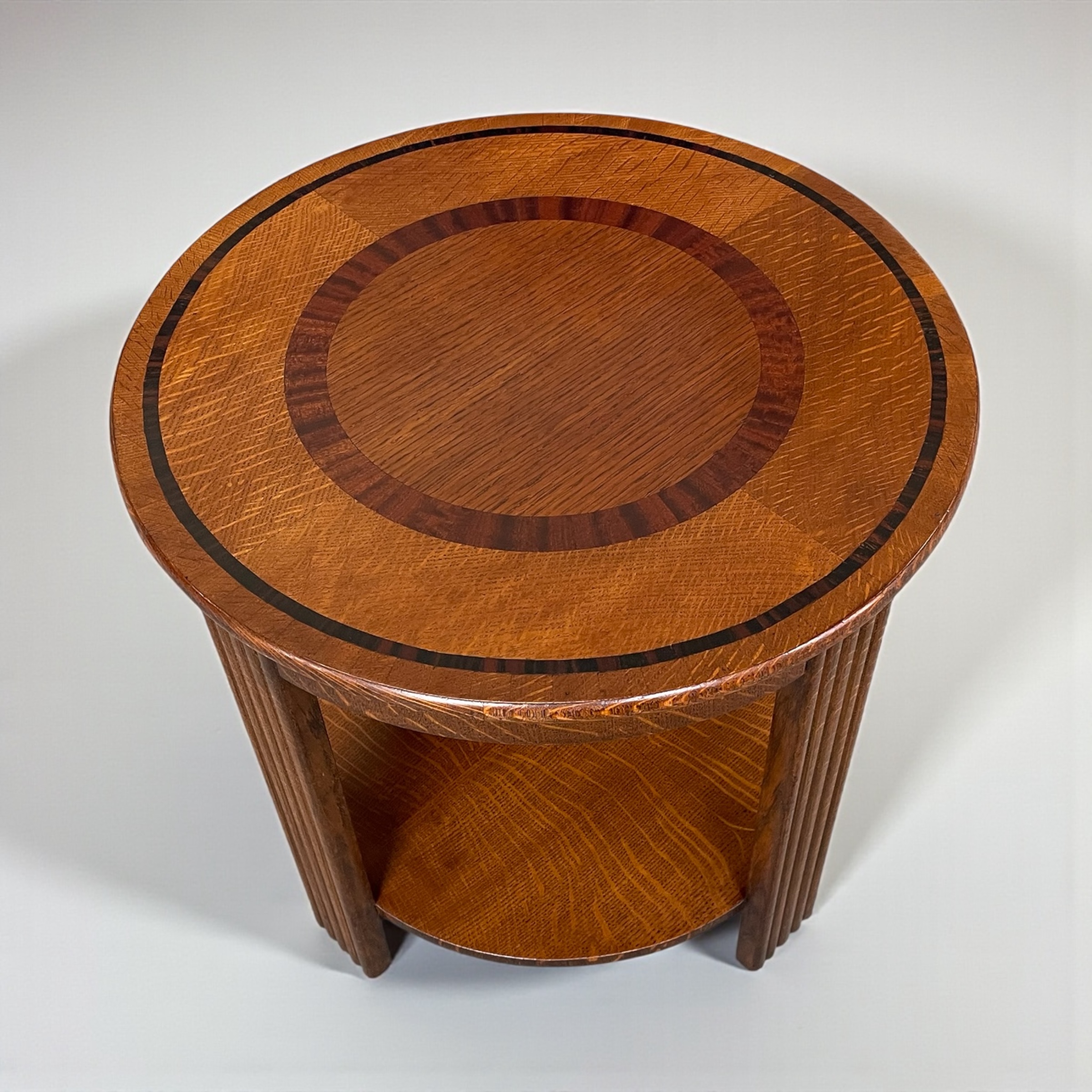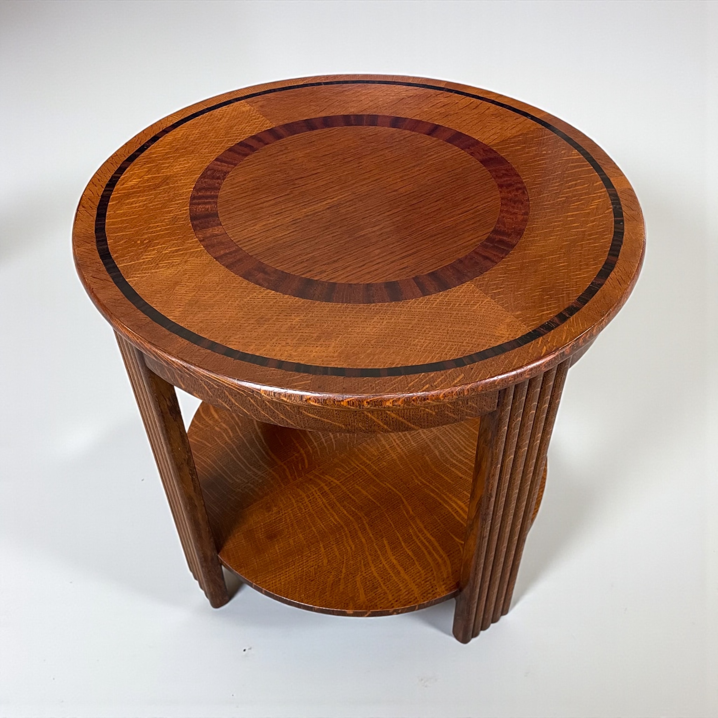Art Deco circular coffee table. The top with a circular band of walnut to the centre and a macassar ebony band to the outer edge. The bottom shelf with attractive medullary rays to the oak.