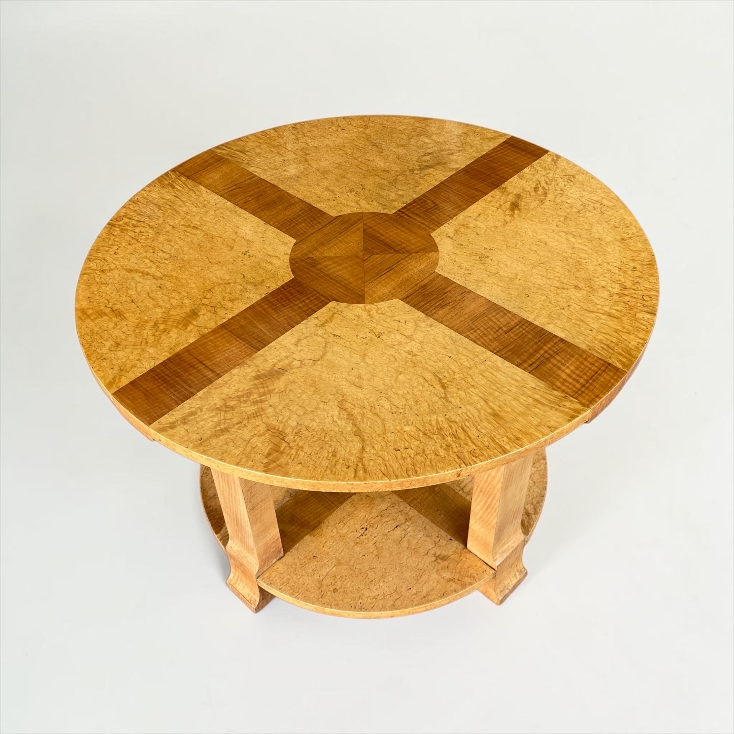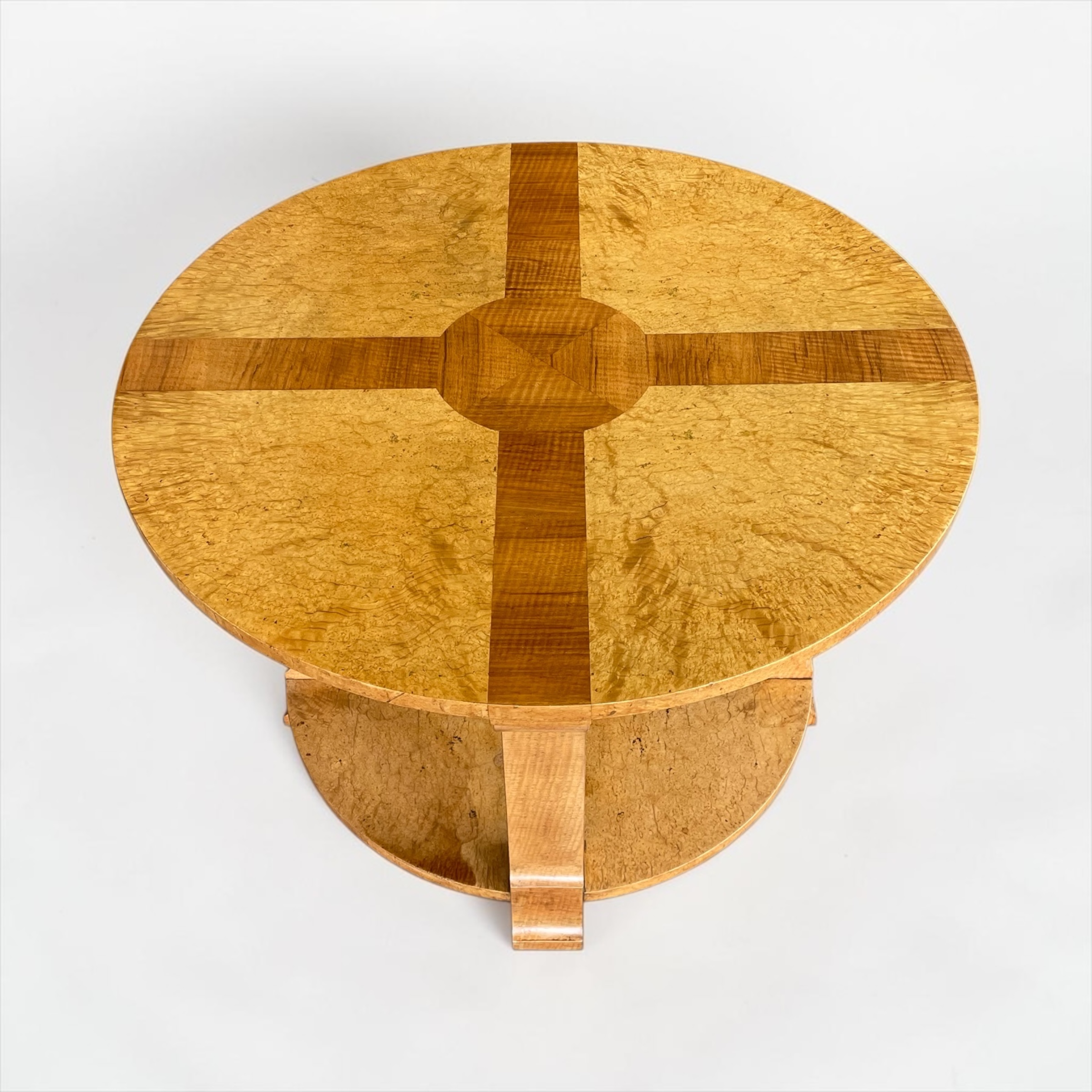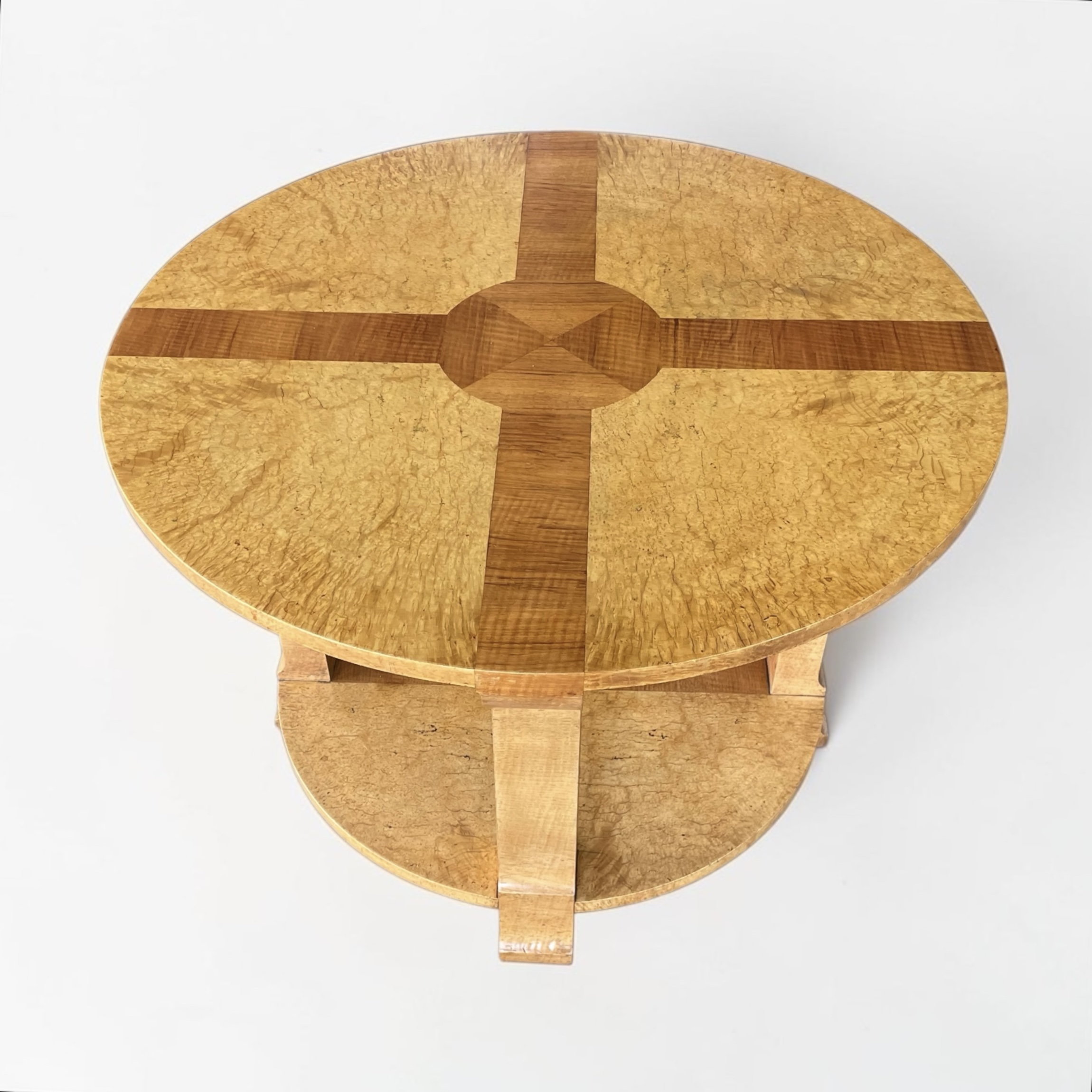 A good size and quality Art Deco coffee in blond burr walnut with darker straight grained walnut inlay to the table top and the shelf below.