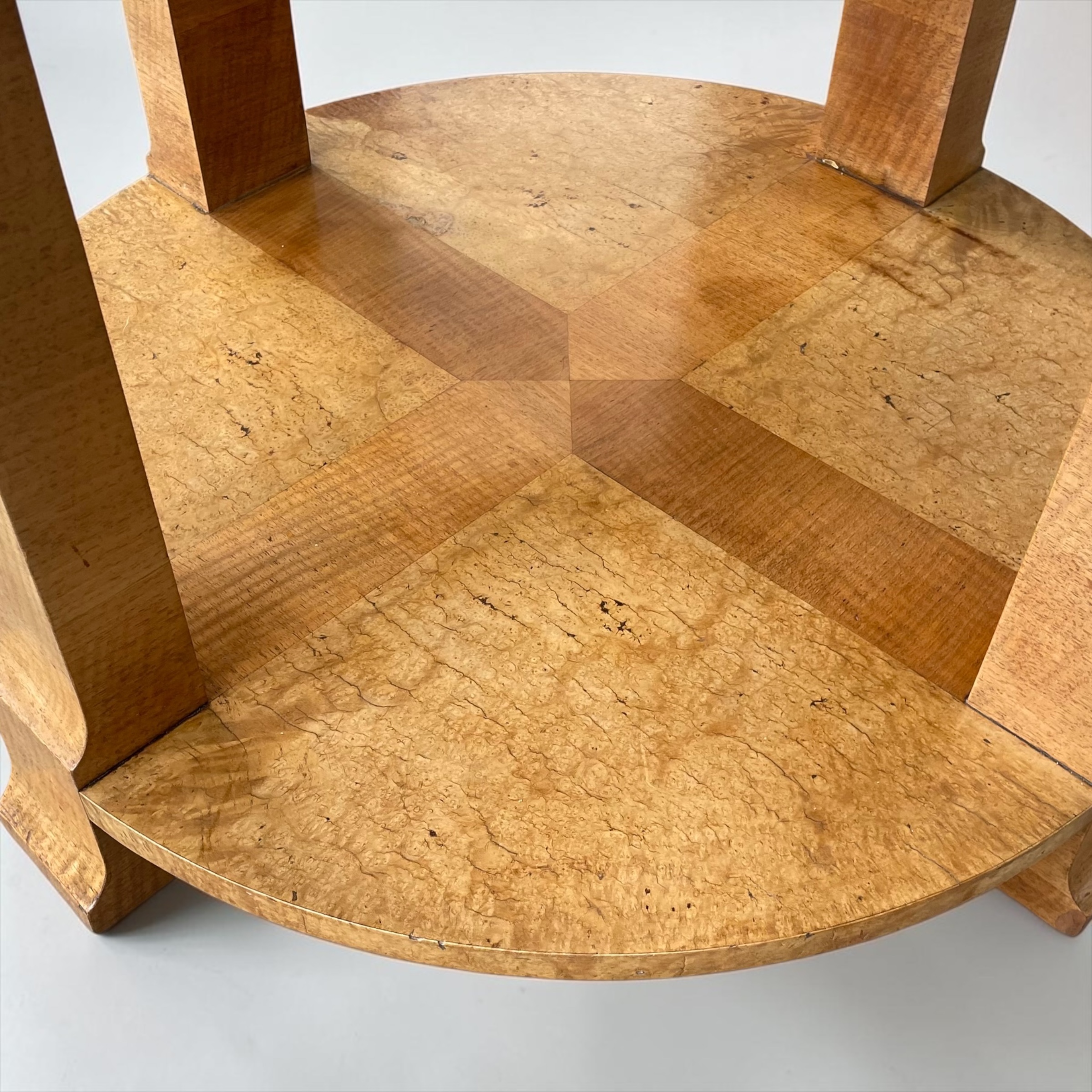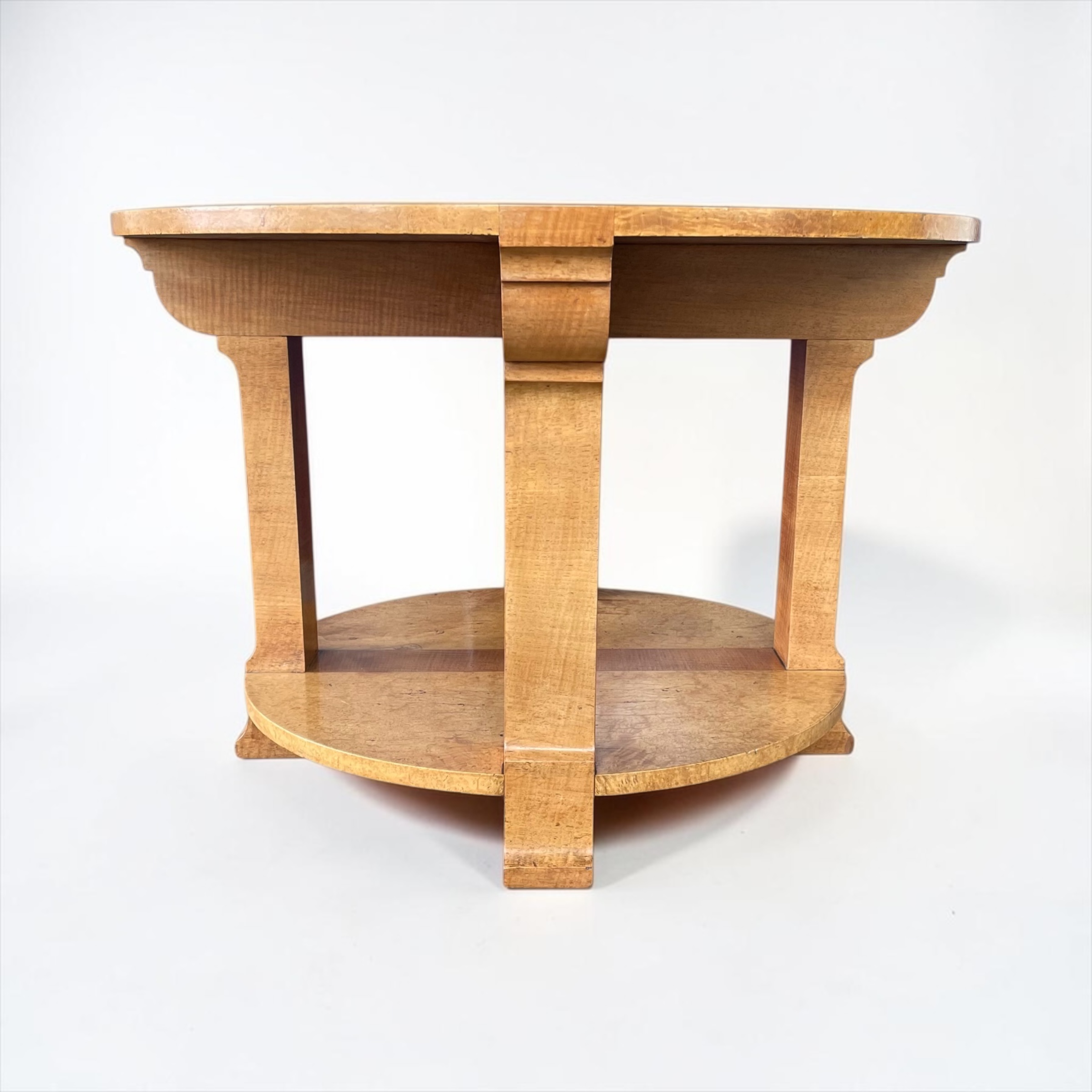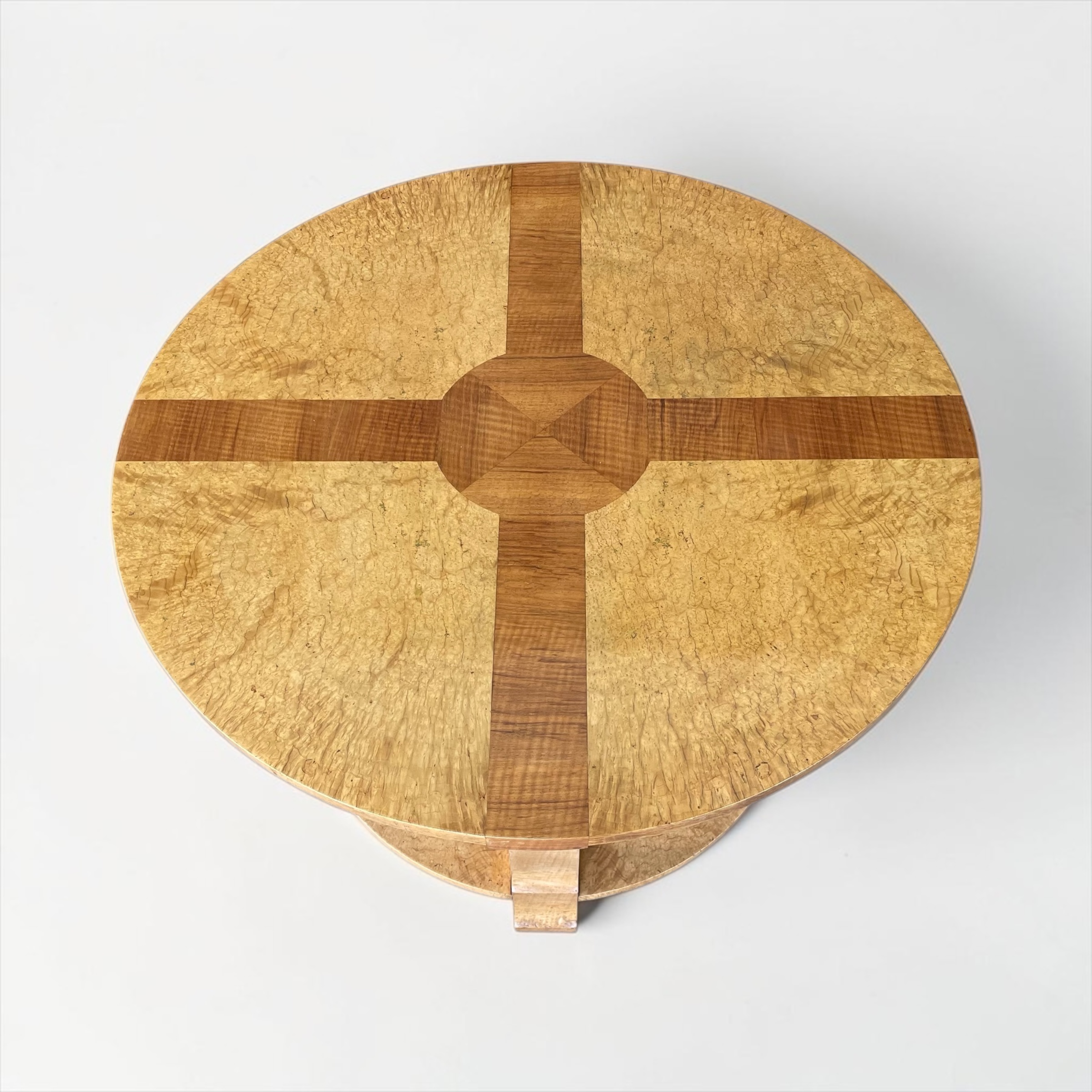 A good size and quality Art Deco coffee in blond burr walnut with darker straight grained walnut inlay to the table top and the shelf below.